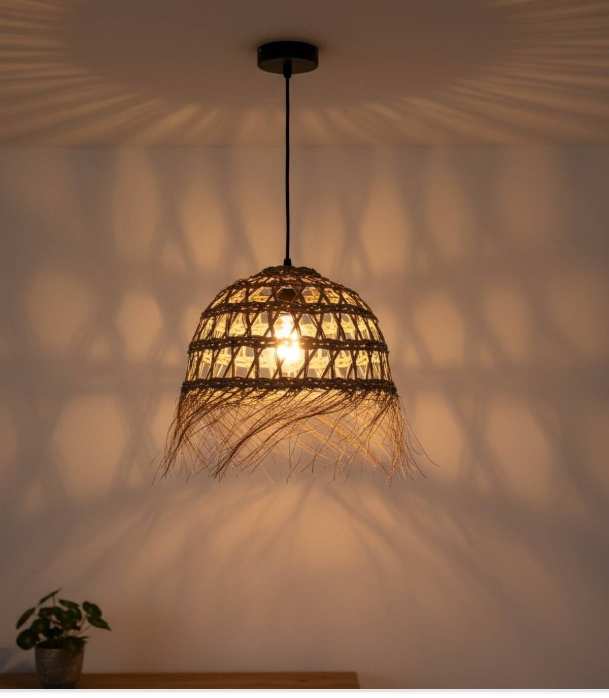 Ronde opengewerkte lamp van 50 cm met de hand gemaakt, geeft een etnisch tintje en het licht is goed zichtbaar omdat het niet volledig bedekt is met espartogras en licht doorlaat.