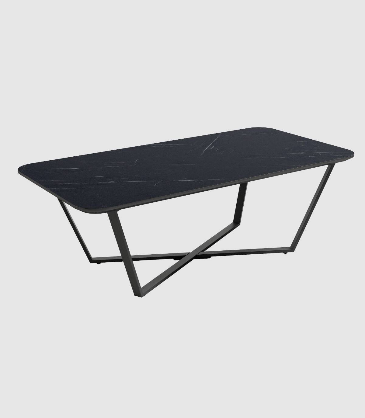 De rechthoekige Egeo salontafel, Het elegante en moderne ontwerp heeft een afgeschuinde bovenkant met een steenachtige afwerking en een zwart gelakte metalen structuur.