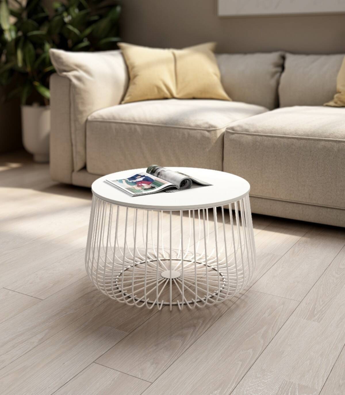 De ronde Indico salontafel, Het heeft een elegant en modern ontwerp, een wit afgewerkt houten blad en een wit gelakte metalen structuur.