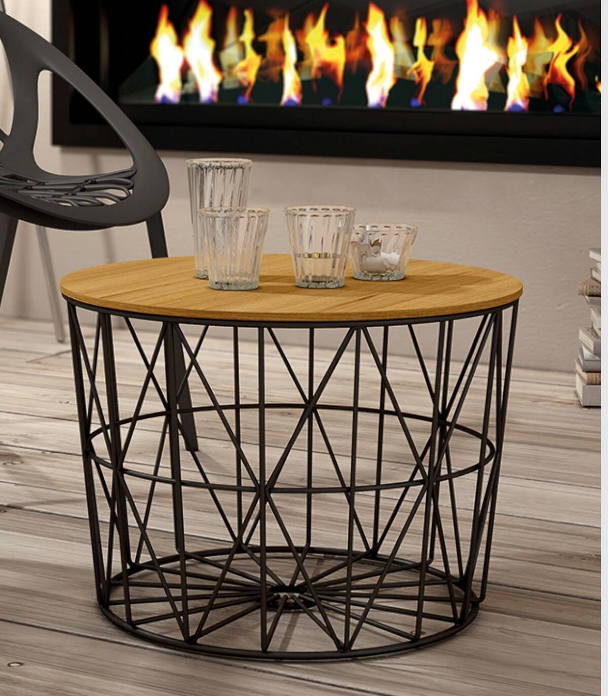 De ronde Atlantische salontafel, Het heeft een elegant en modern design, een naturelkleurig houten blad en een zwart gelakte metalen structuur.