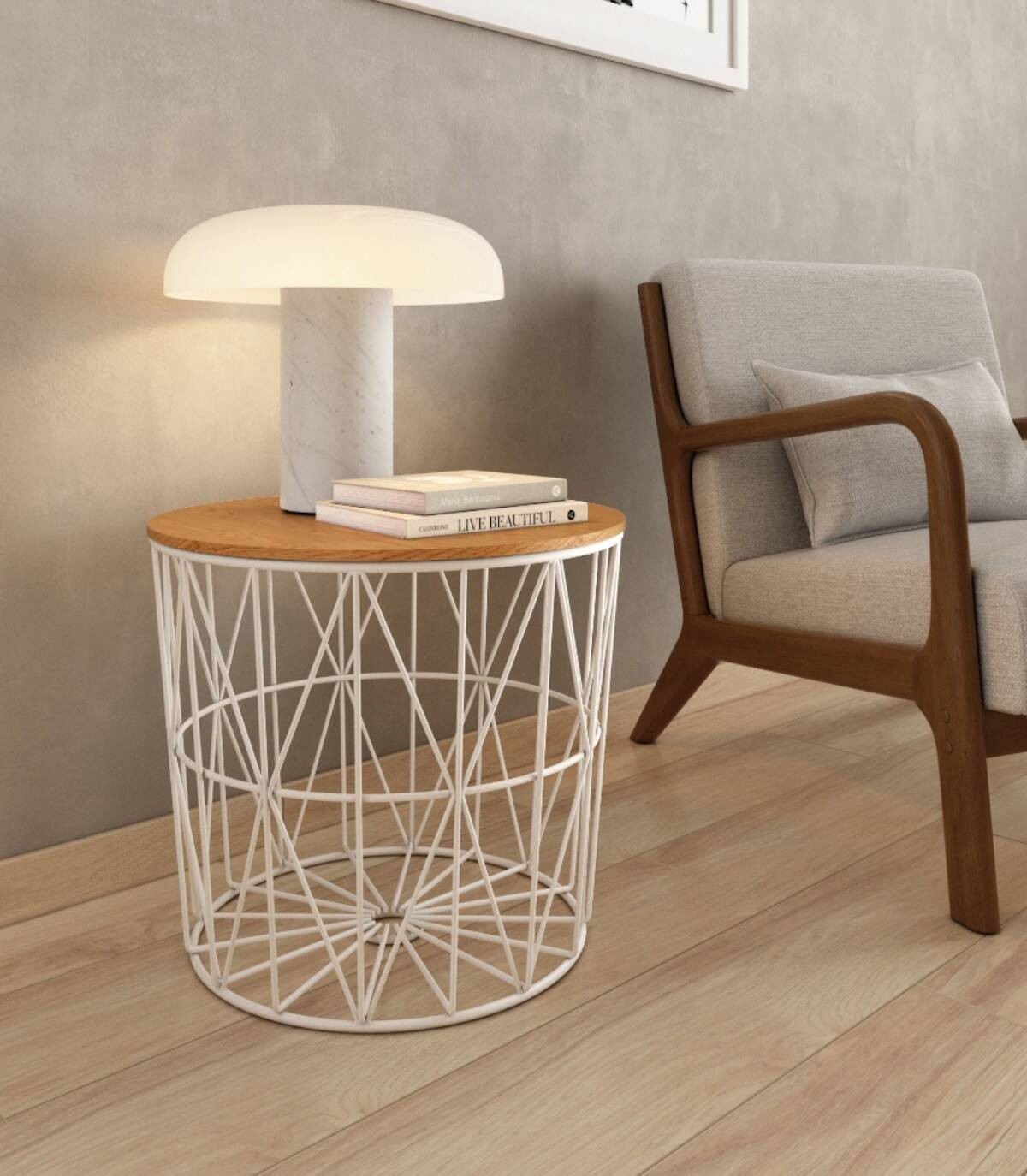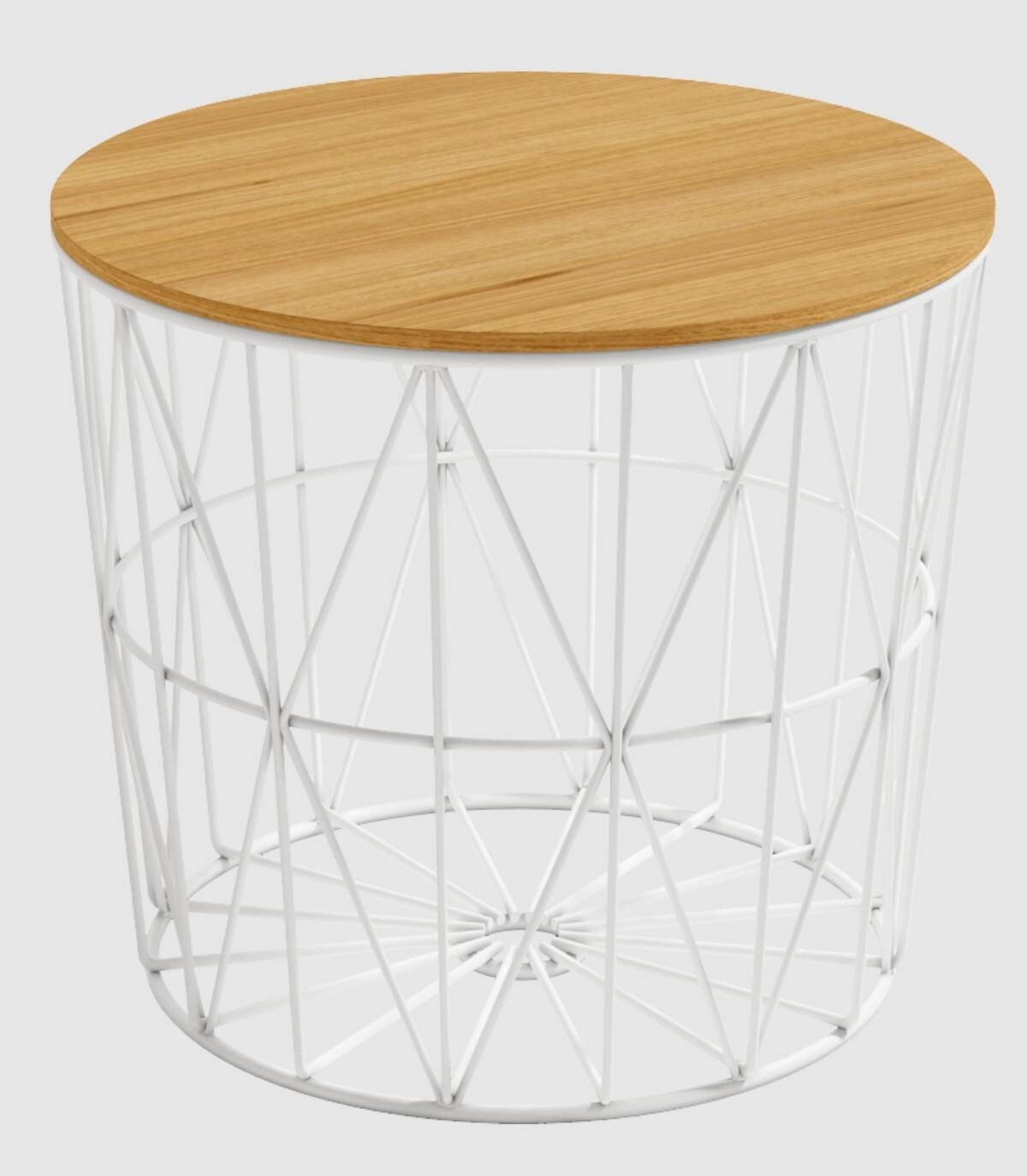 De ronde Atlantische salontafel, Het heeft een elegant en modern design, een naturelkleurig houten blad en een wit gelakte metalen structuur.