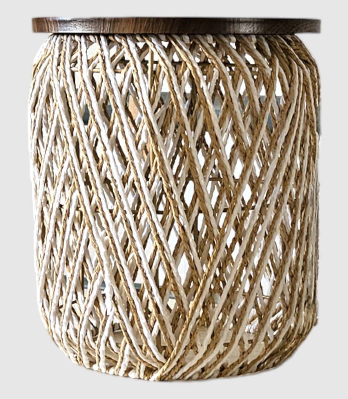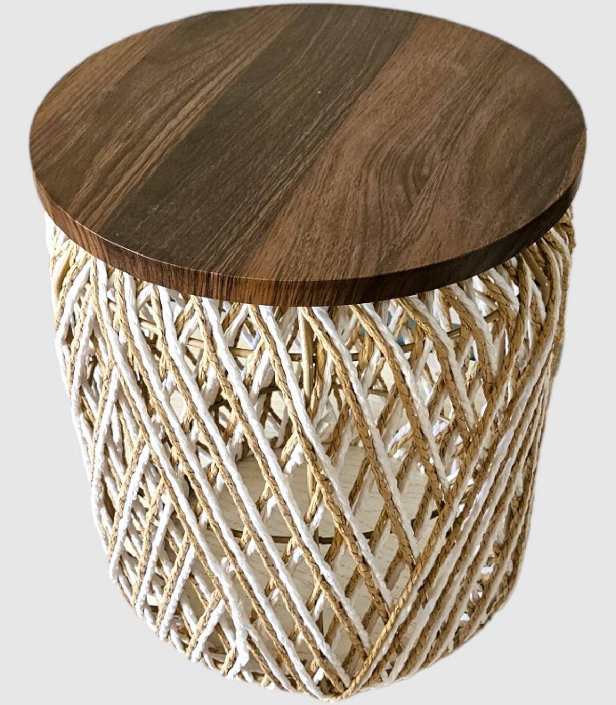 Ronde touwtafel met groot houten blad, Deze elegante salontafel met gevlochten touwbasis en rond houten blad is een uitstekende optie als aanvulling op de decoratie van elke ruimte. Het veelzijdige en tijdloze ontwerp past zich perfect aan verschillende stijlen aan, van moderne tot rustieke omgevingen. De basis van gevlochten touw zorgt voor een natuurlijk, handgemaakt tintje, terwijl de houten bovenkant zorgt voor een stevig, duurzaam oppervlak. Ideaal voor het plaatsen van tijdschriften, boeken, lampen of gewoon als bijzettafel. Dit stuk is perfect voor woonkamers, slaapkamers, entrees of zelfs overdekt buiten. Combineert elegantie en functionaliteit in één product.