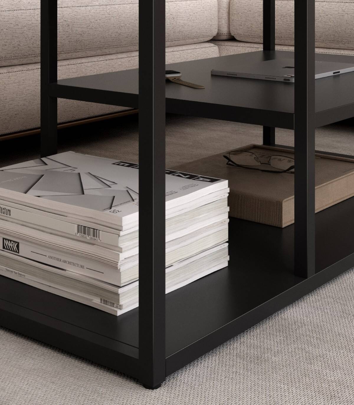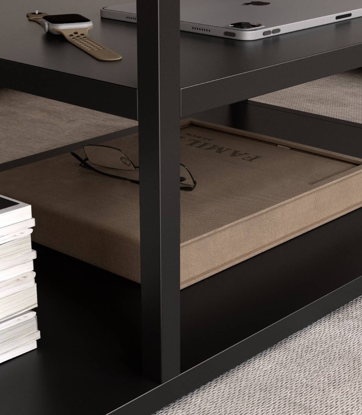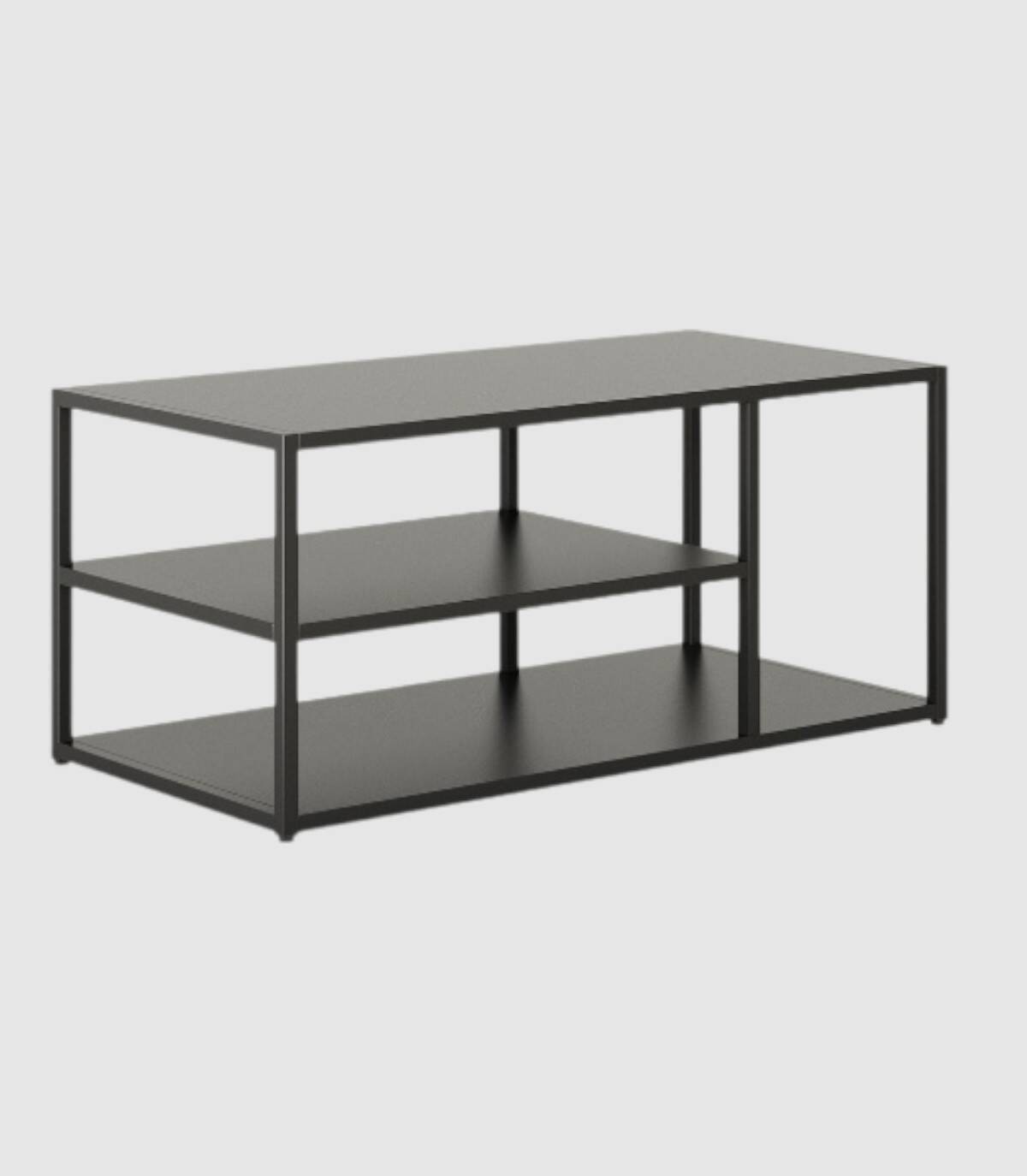 Read moreShow lessHet bestaat uit een zwarte structuur met vier poten en drie planken van verschillende afmetingen.