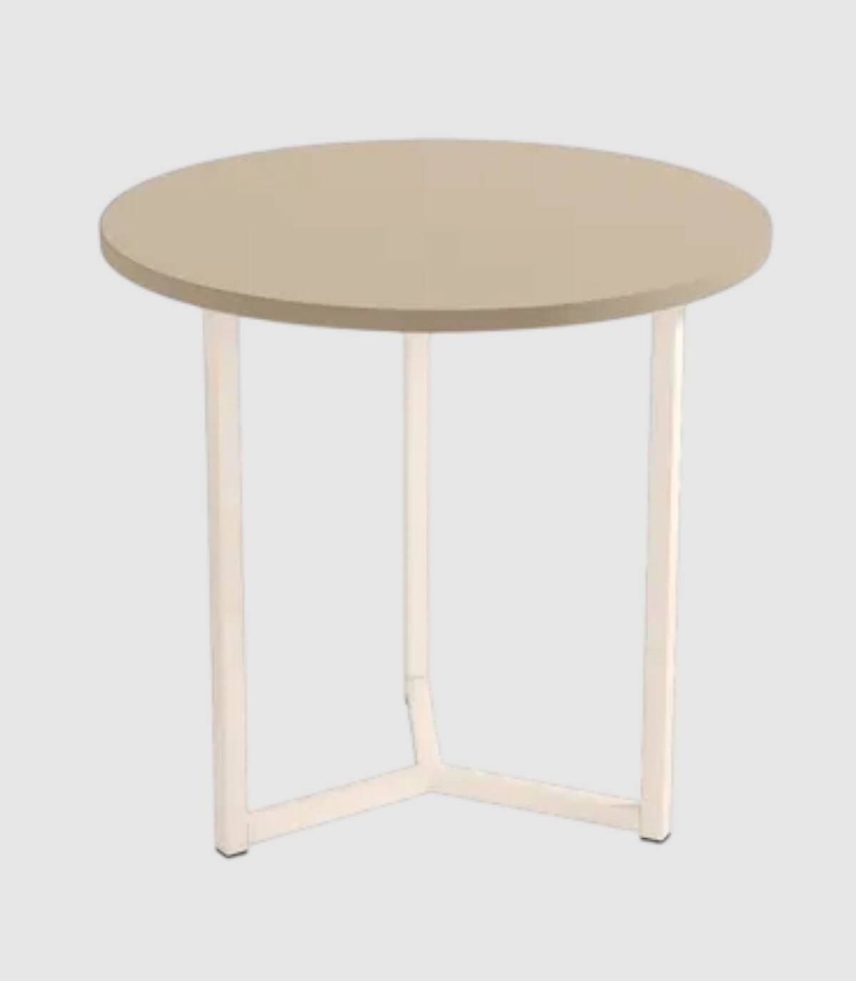 La mesa de centro redonda Pacífico se compone de tablero acabado en melaminas sobre estructura metálica pintada de color marfil con diseño de tres patas.