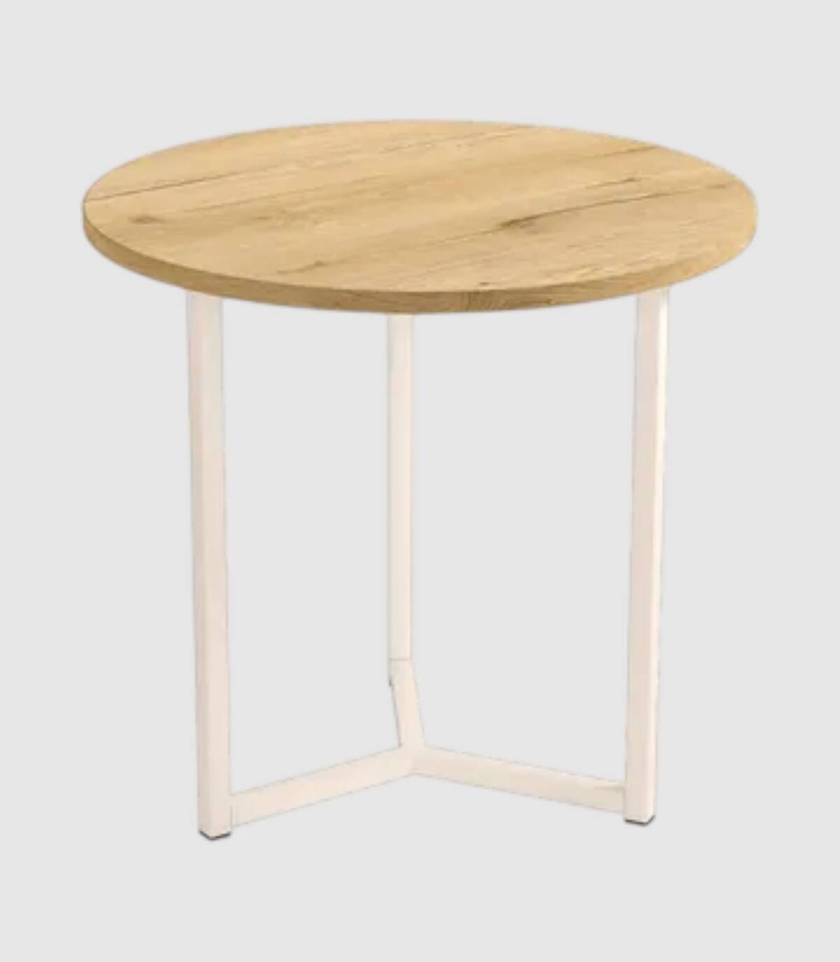 La mesa de centro redonda Pacífico se compone de tablero acabado en melaminas sobre estructura metálica pintada de color marfil con diseño de tres patas.