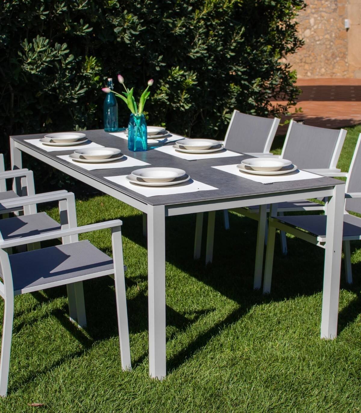 De rechthoekige aluminium eettafel Duna Het is gemaakt van gepoedercoat aluminium (polyester). Het heeft een glad rechthoekig aluminium oppervlak. Alle 4 poten hebben antislip doppen.