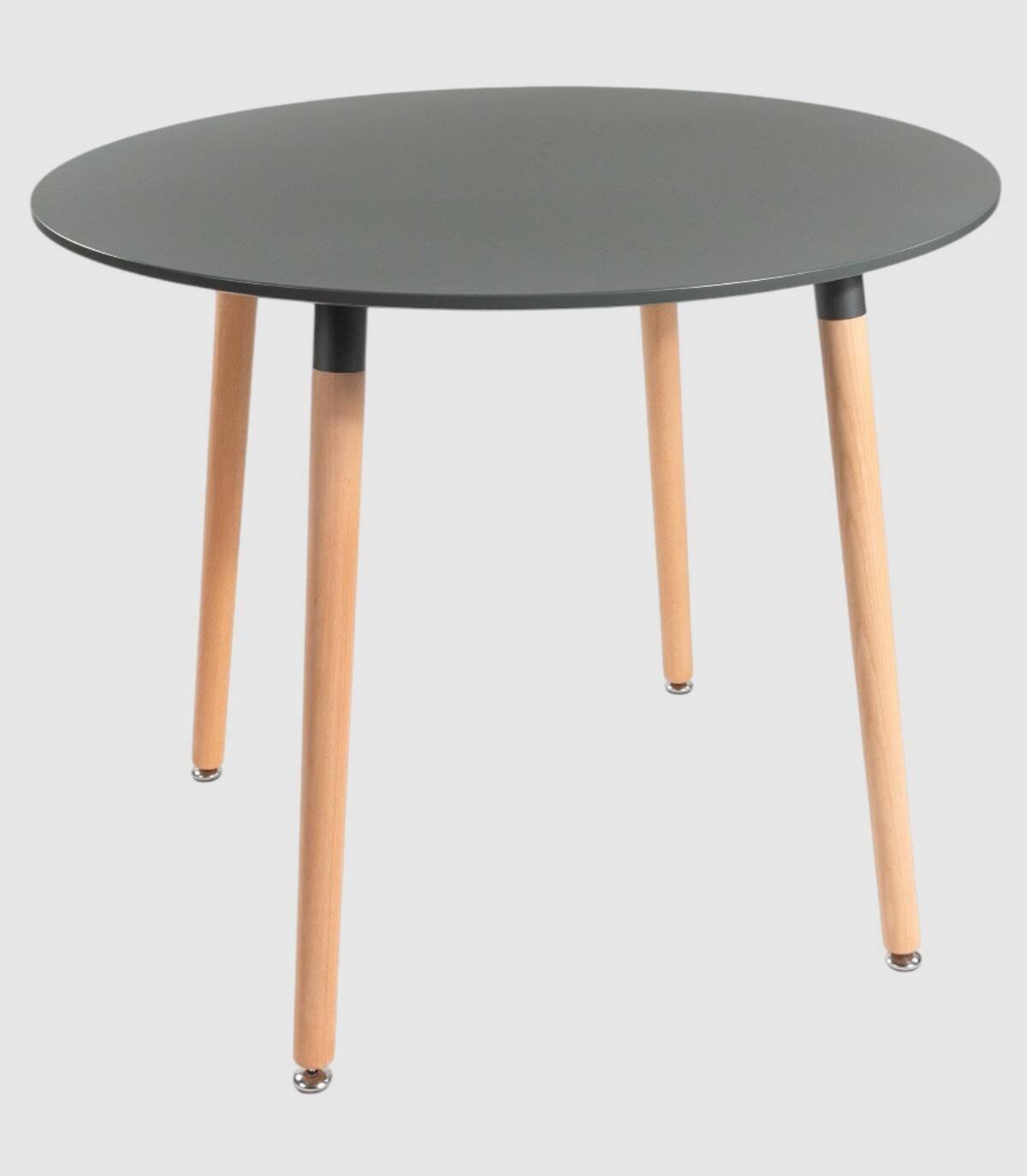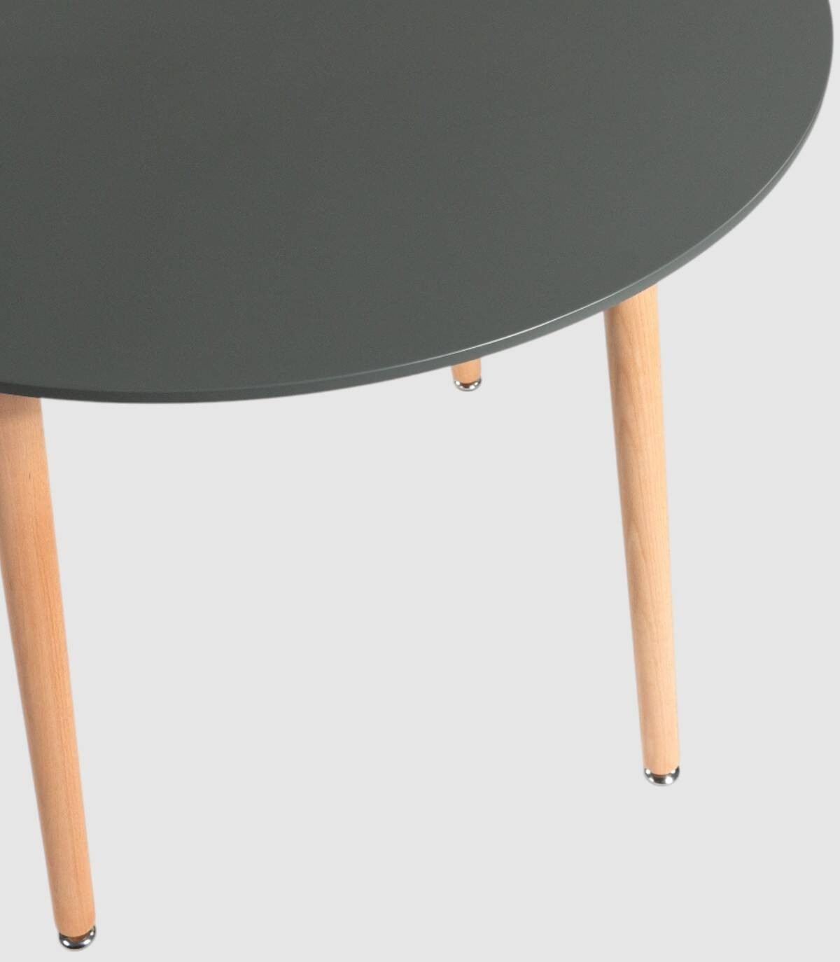 De ronde Caribische tafel, Elegant en modern ontwerp, het heeft een gelakt MDF-blad en naturelkleurige houten poten die aan de onderkant verstelbaar zijn.
