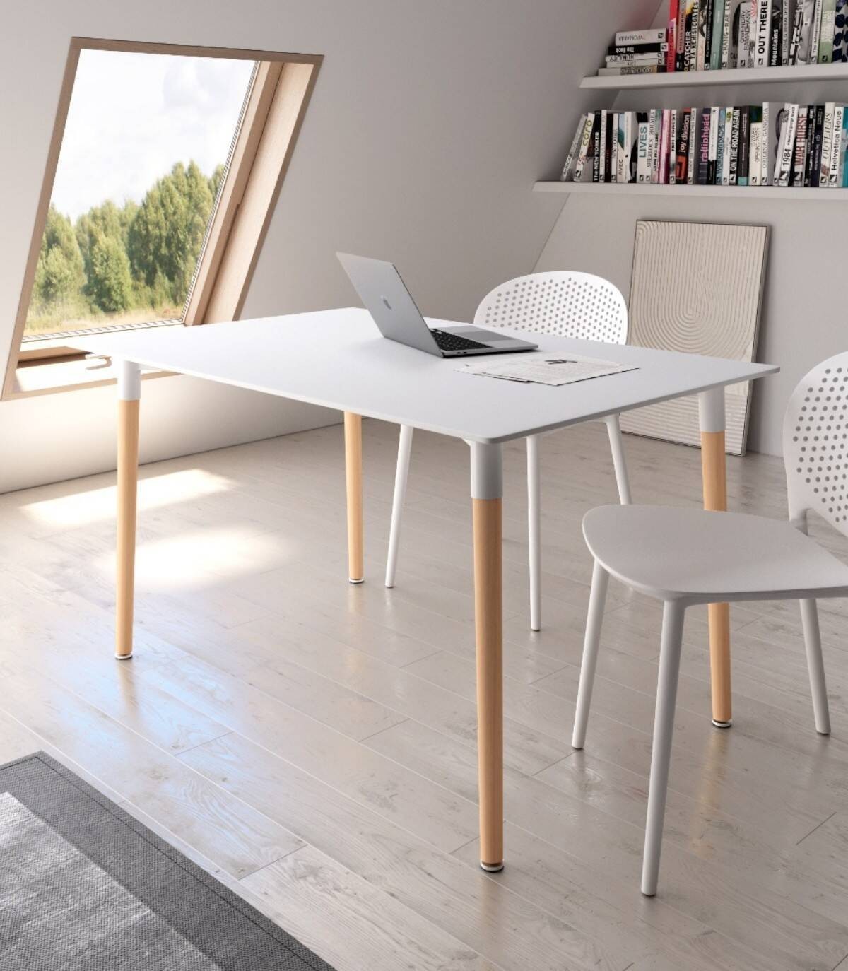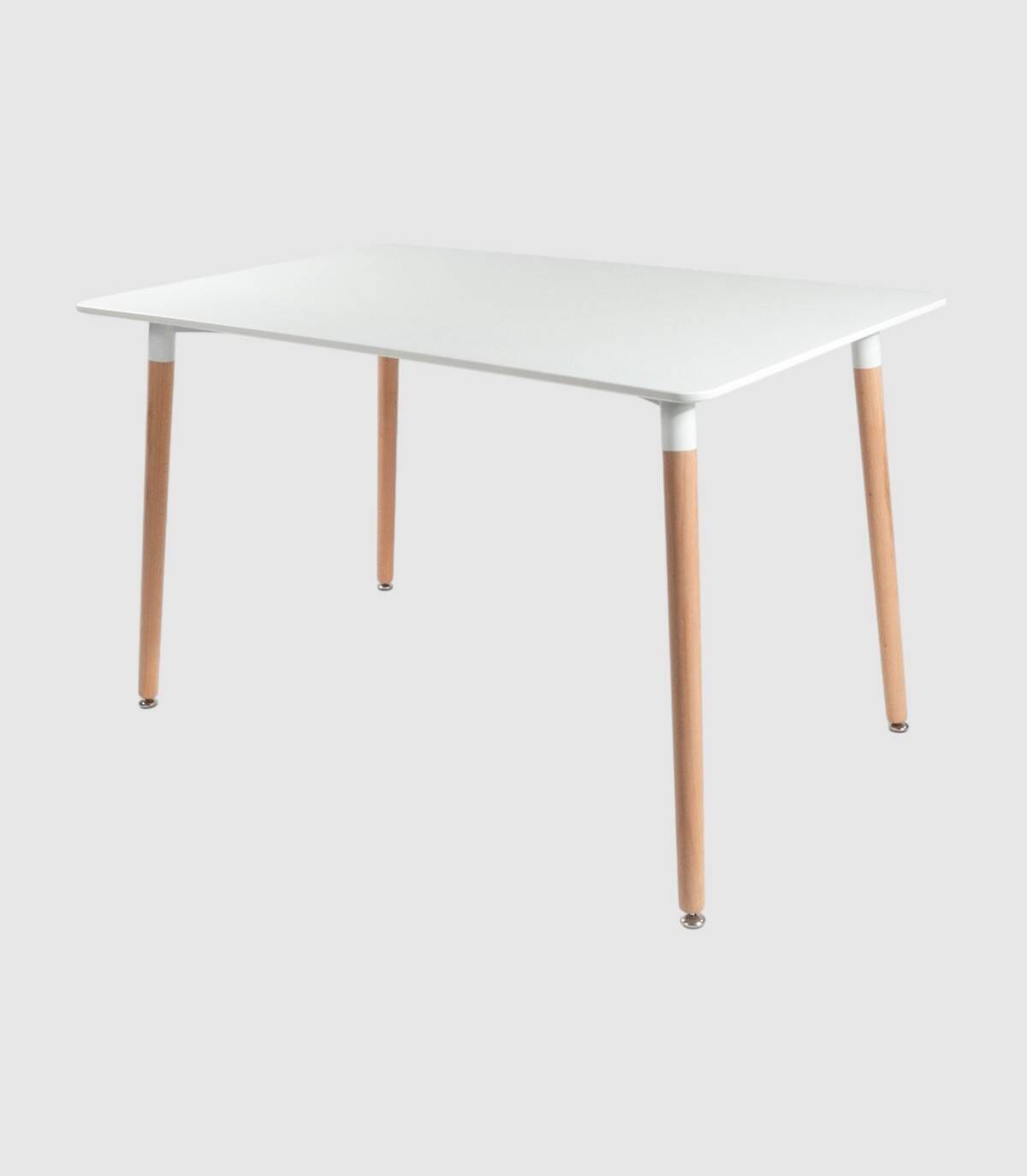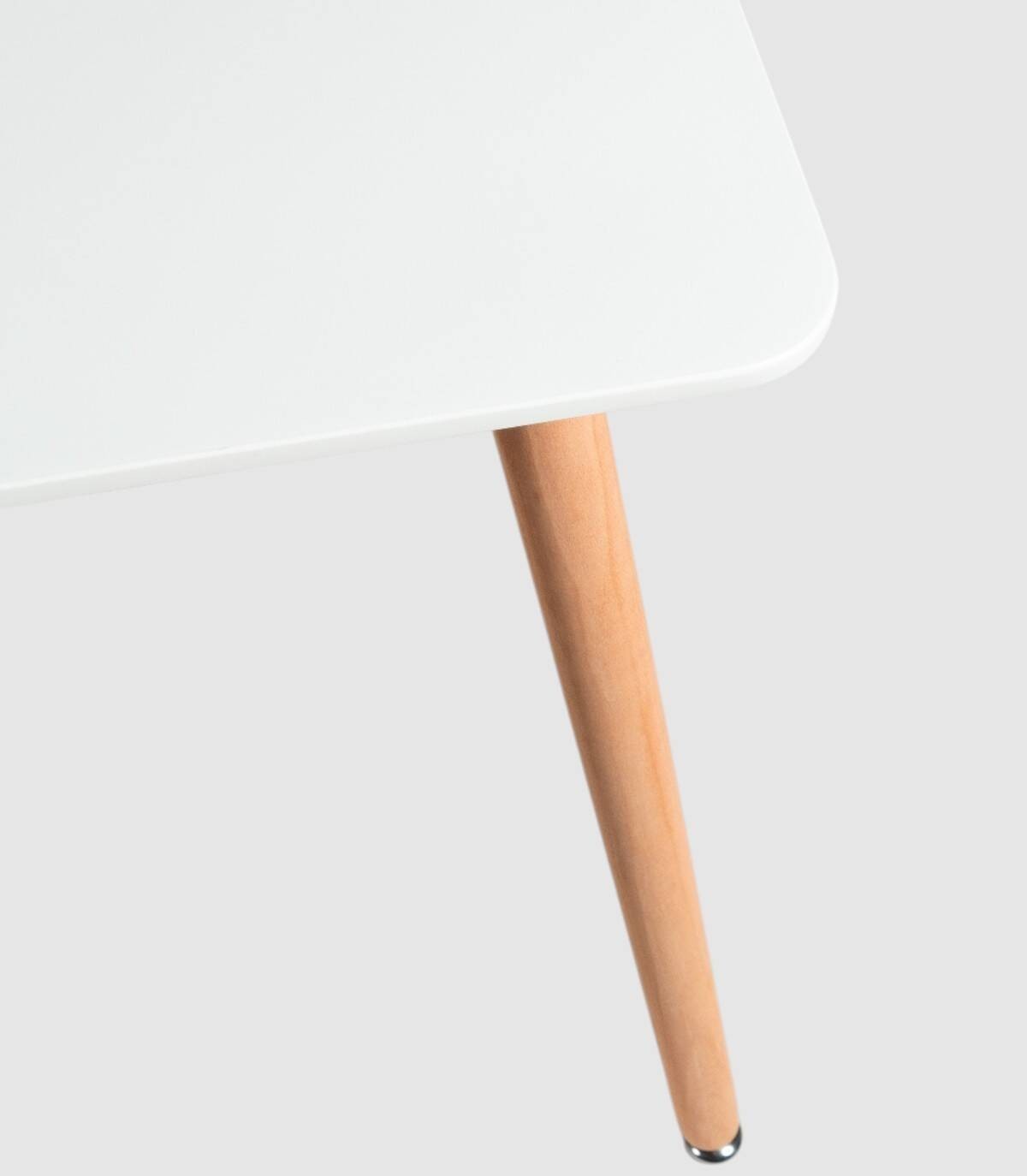 De rechthoekige Caribe tafel, Elegant en modern ontwerp, het heeft een gelakt MDF-blad en naturelkleurige houten poten die aan de onderkant verstelbaar zijn.