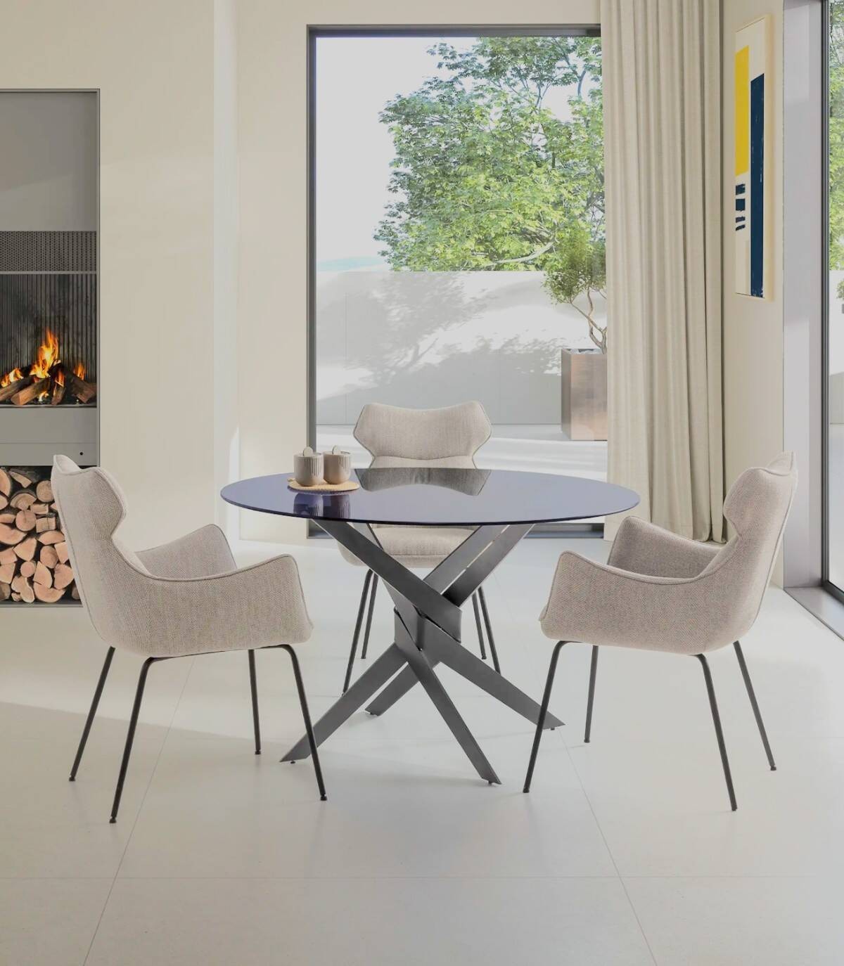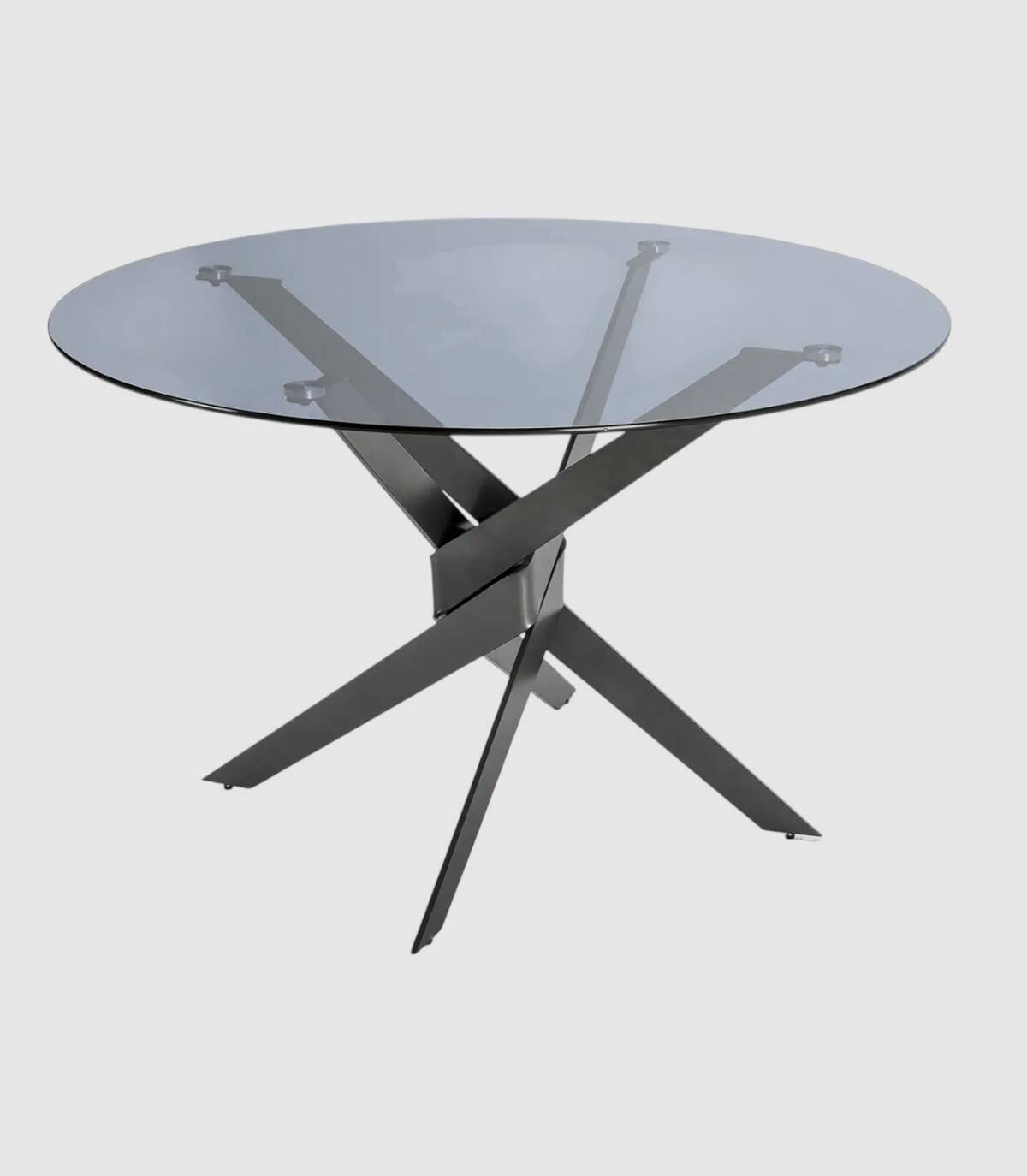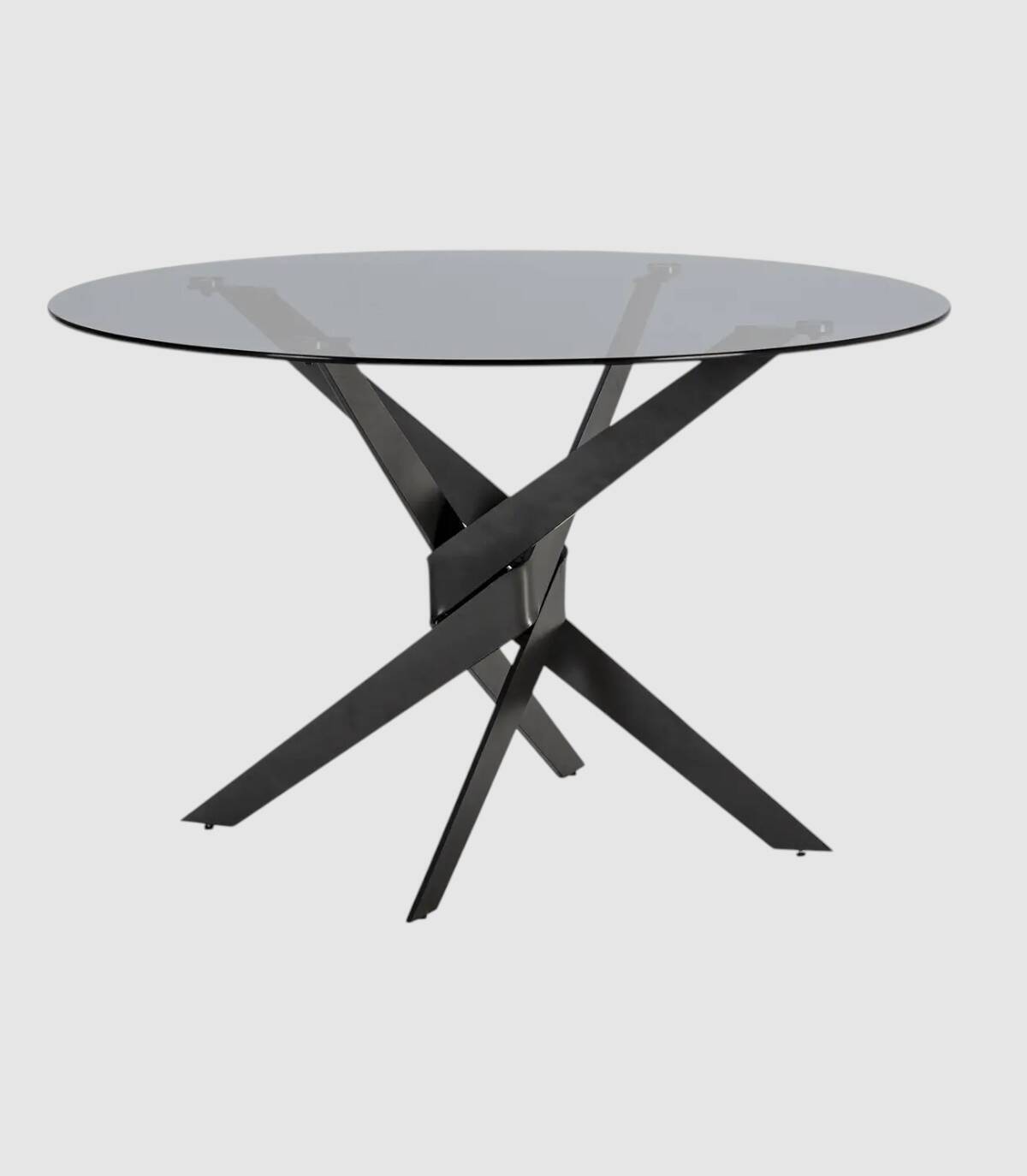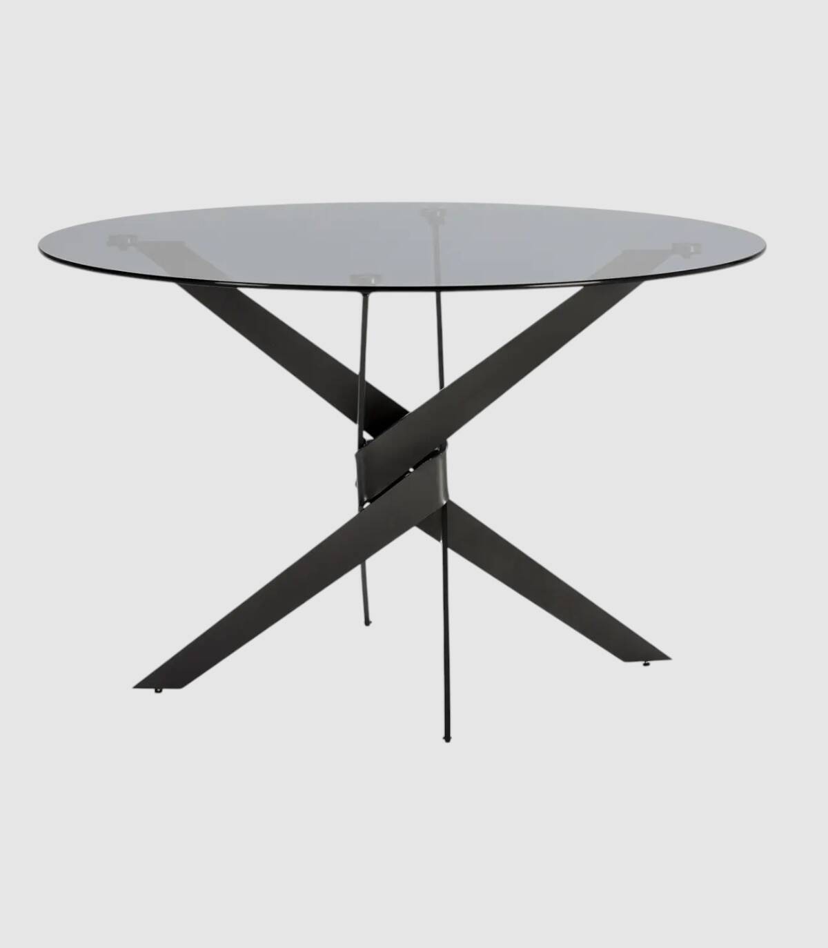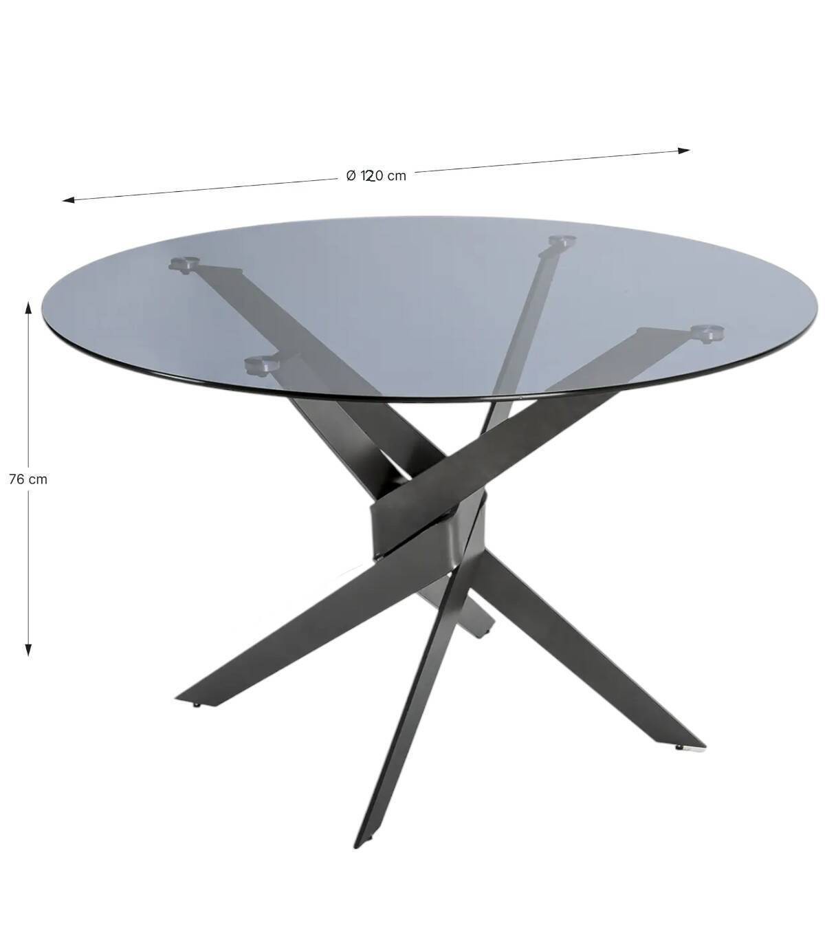 La mesa de comedor Zerne se compone de tablero redondo de cristal de color oscuro no opaco sobre cuatro patas unidas por el centro de metal pintado de color negro.