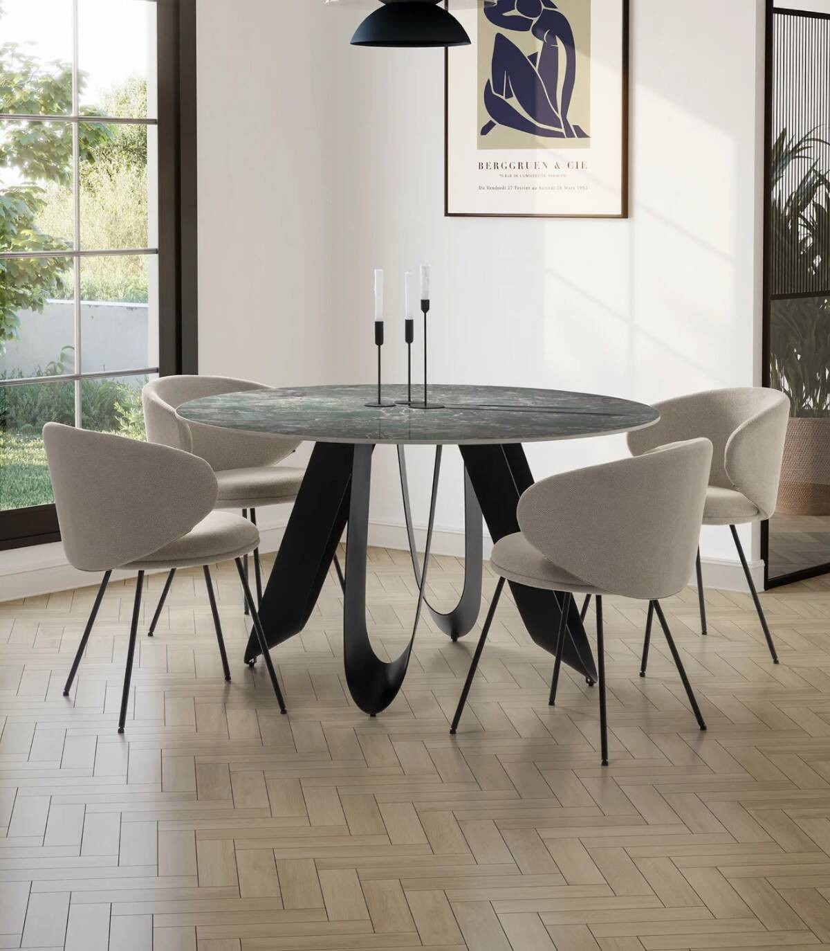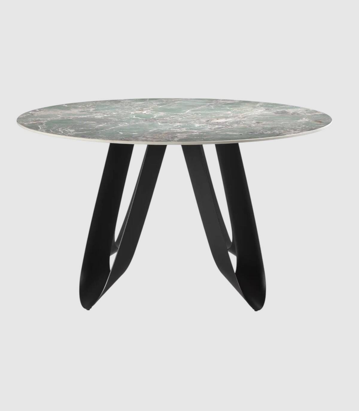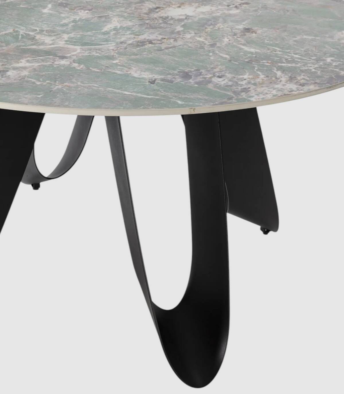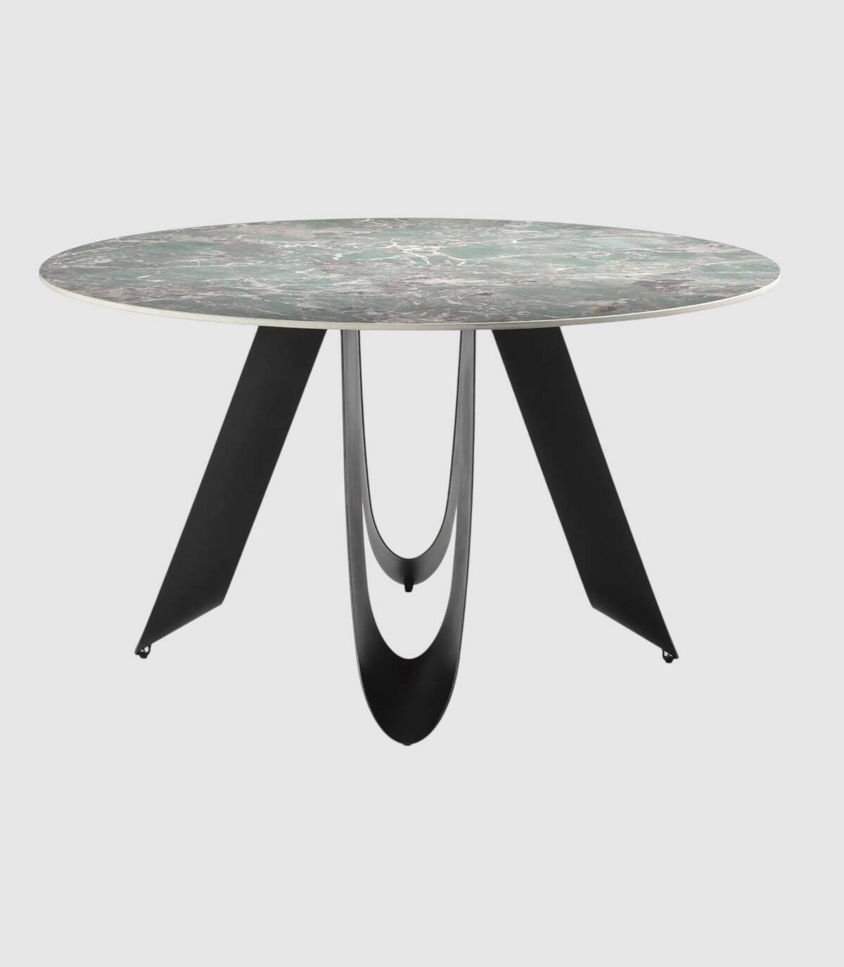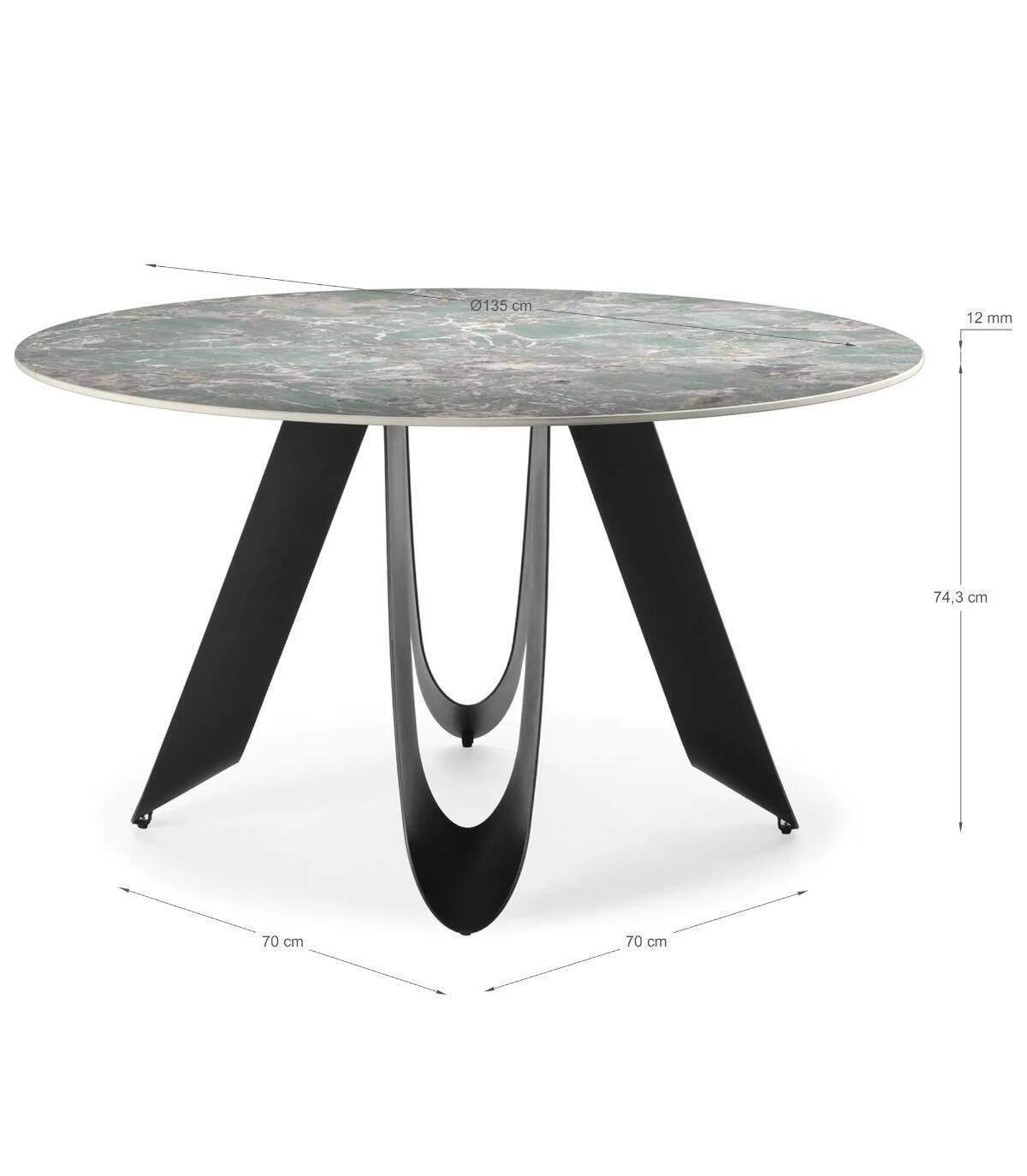 La mesa redonda de comedor Taina se compone de tablero redondo de piedra sinterizada sobre cuatro patas de metal con forma de u pintado de color negro.
