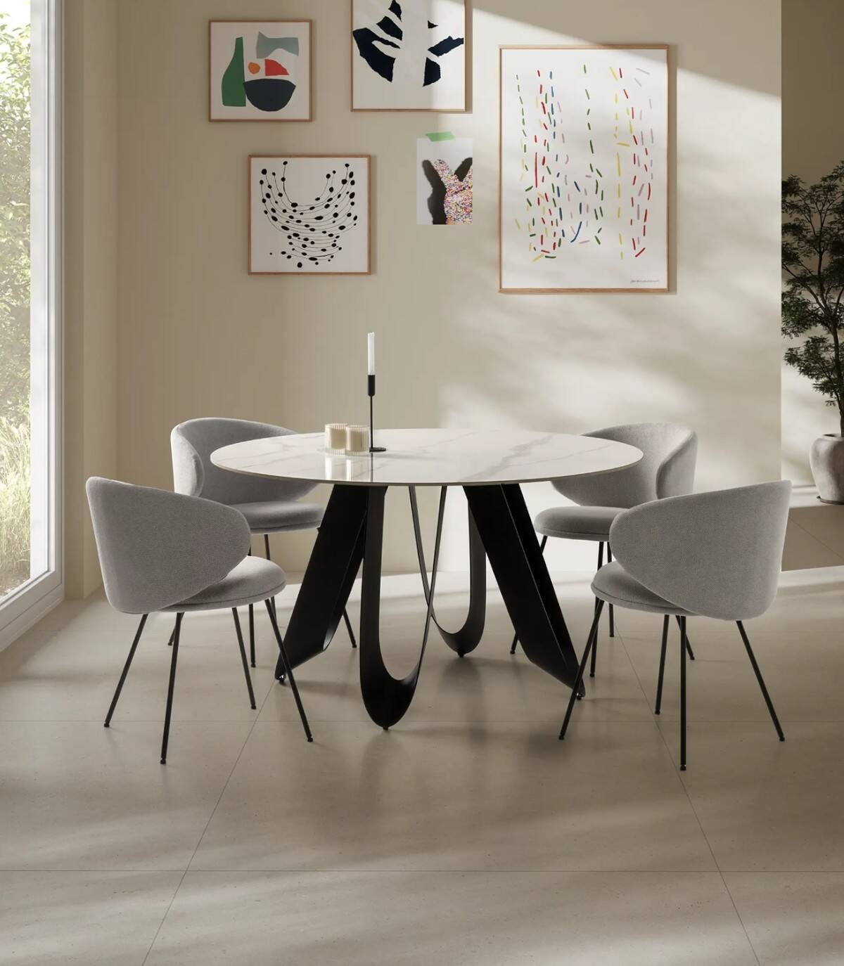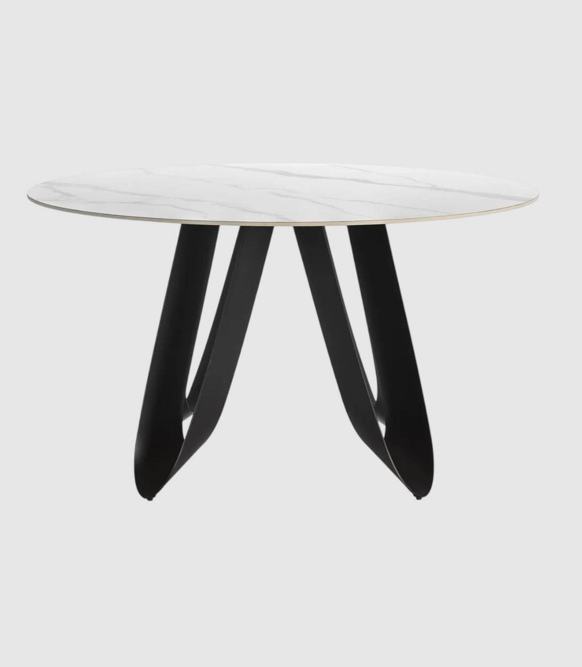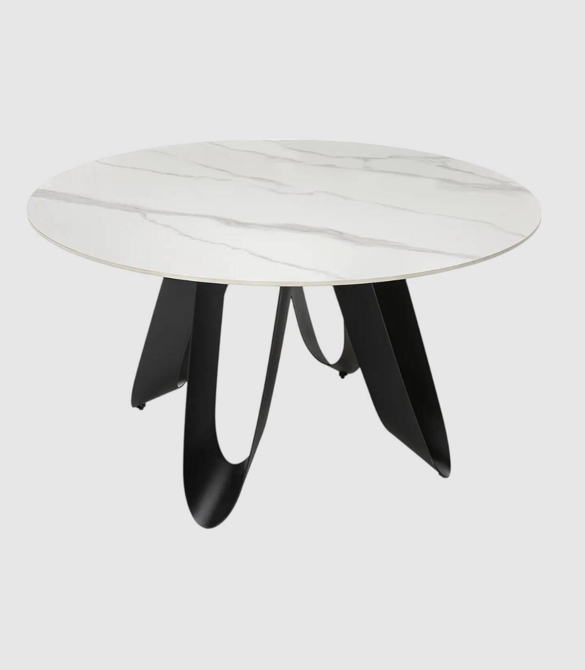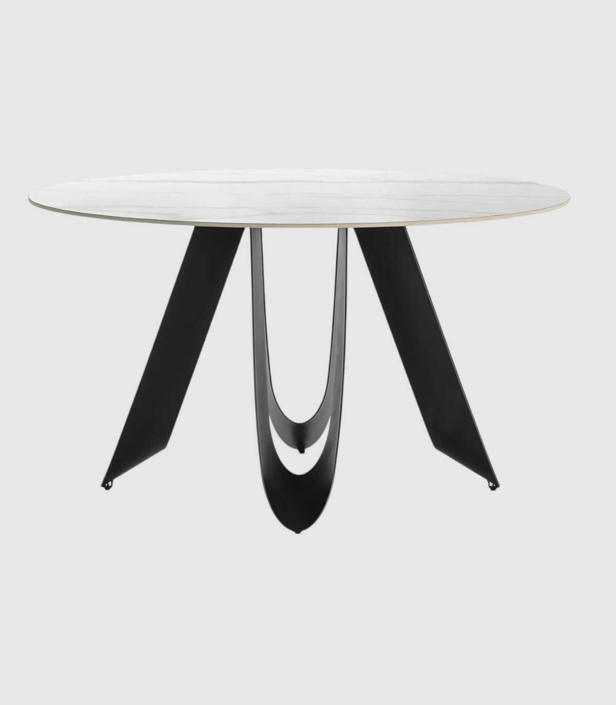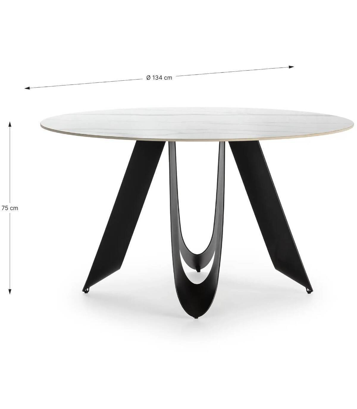 La mesa redonda de comedor Taina se compone de tablero redondo de piedra sinterizada sobre cuatro patas de metal con forma de u pintado de color negro.