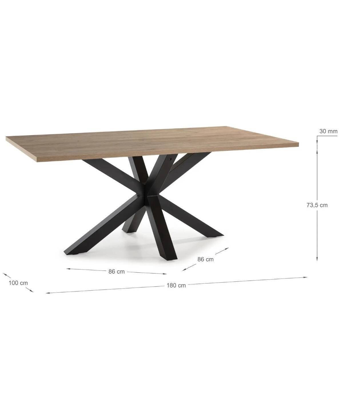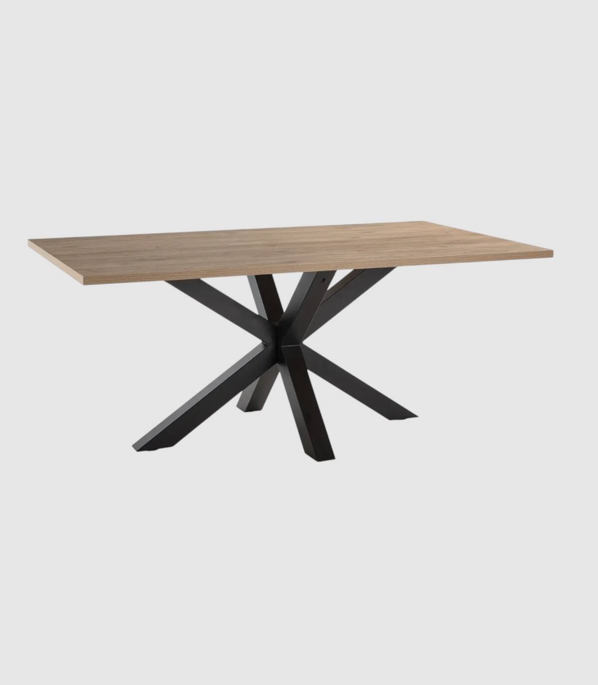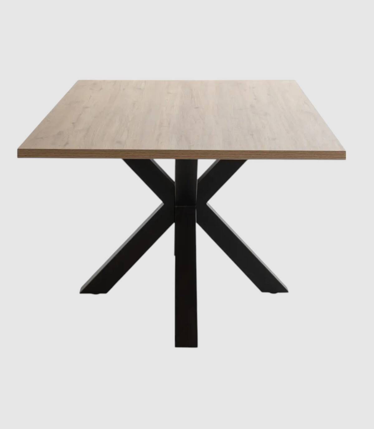 La mesa de comedor Laibuz se compone de tablero cuadrado de melamina de color madera sobre cuatro patas de metal pintado de color negro.