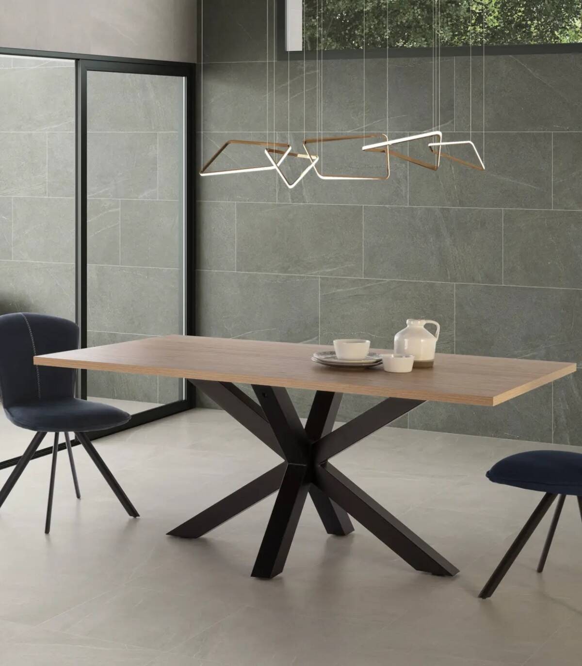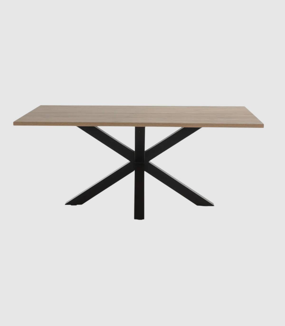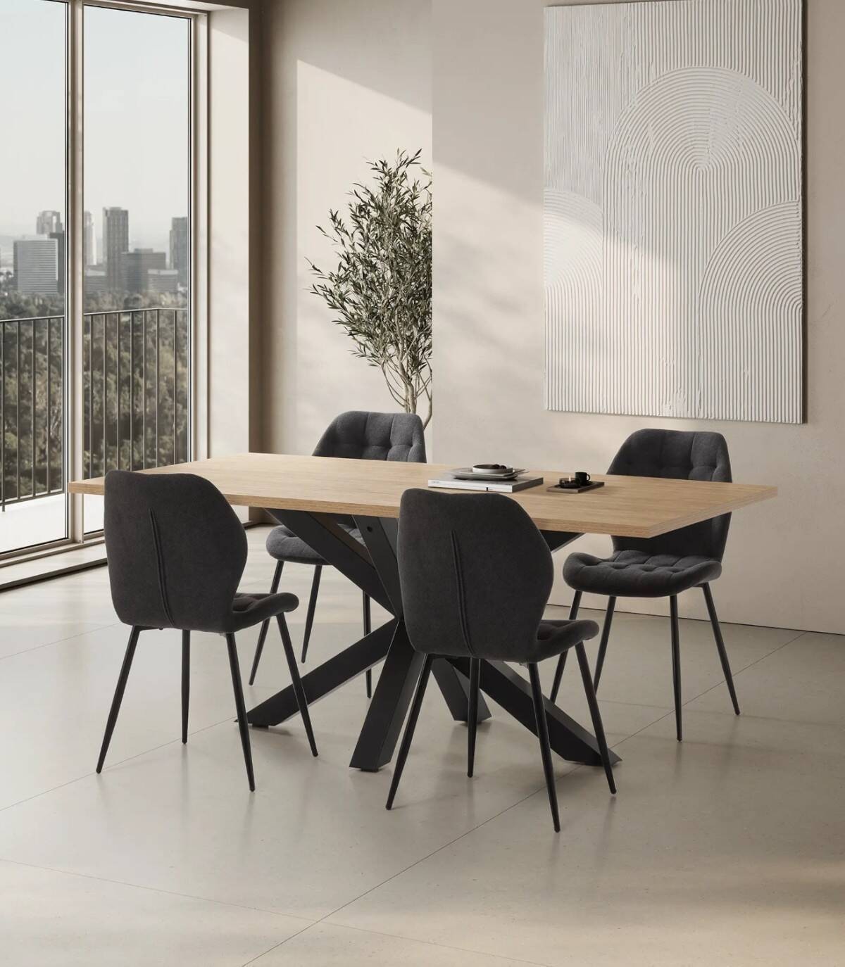 La mesa de comedor Laibuz se compone de tablero cuadrado de melamina de color madera sobre cuatro patas de metal pintado de color negro.