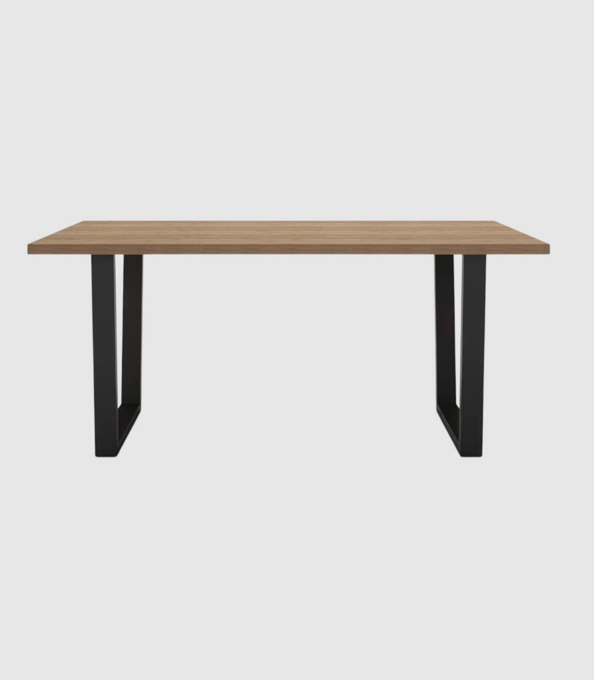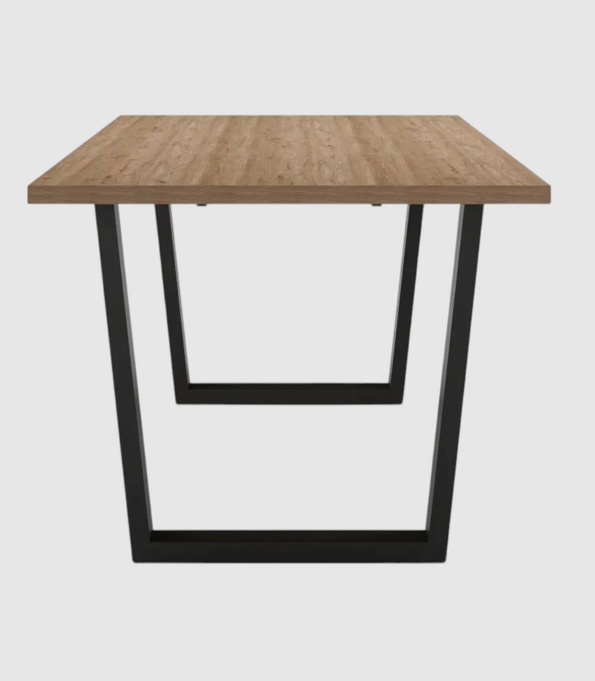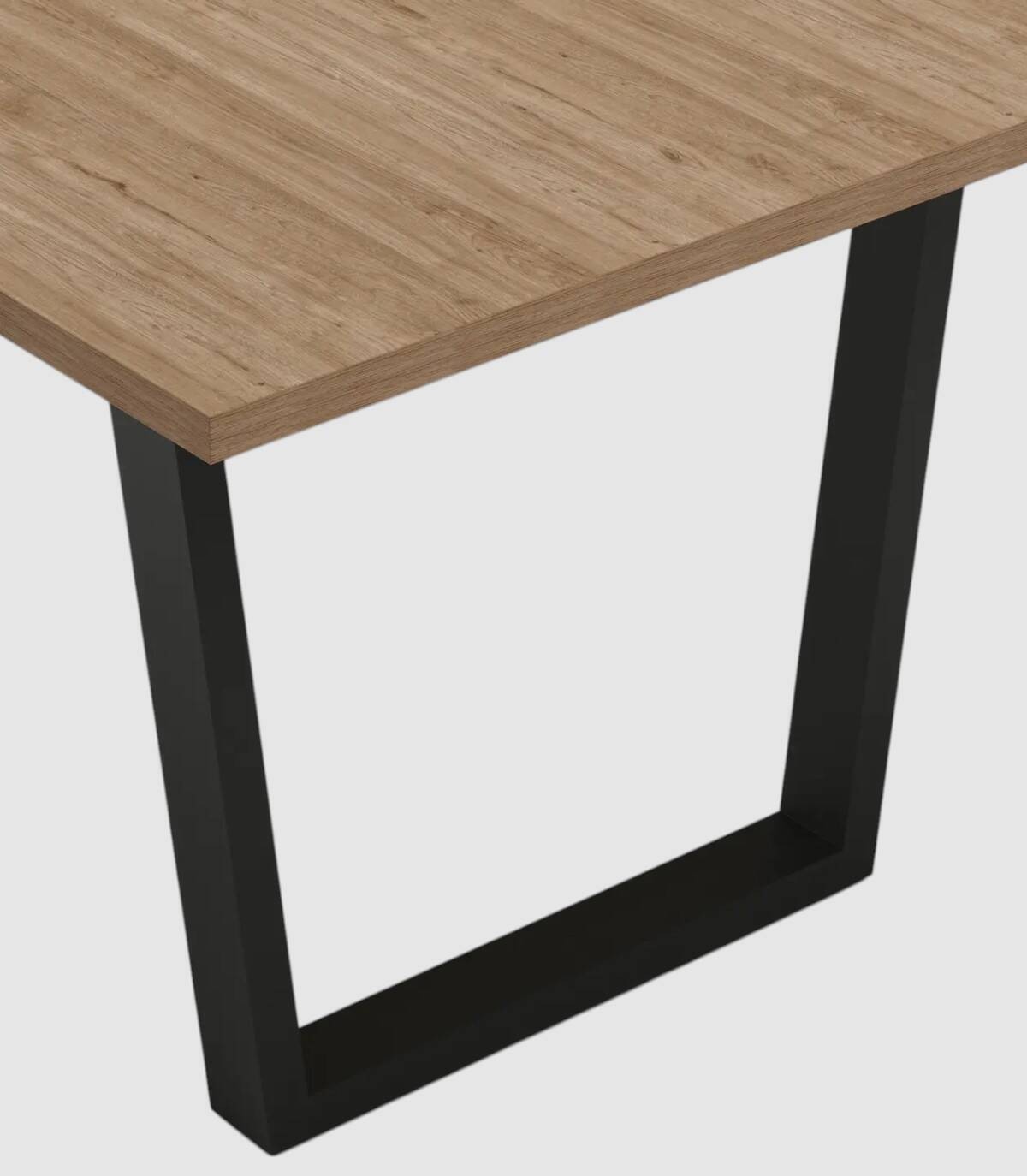 La mesa Tutely se compone de tablero rectangular de color madera sobre cuatro patas de metal pintado de color negro unidas por el extremo inferior en los laterales.