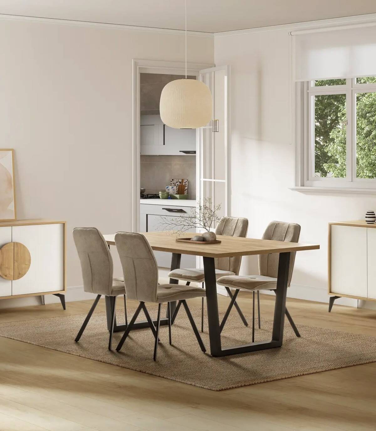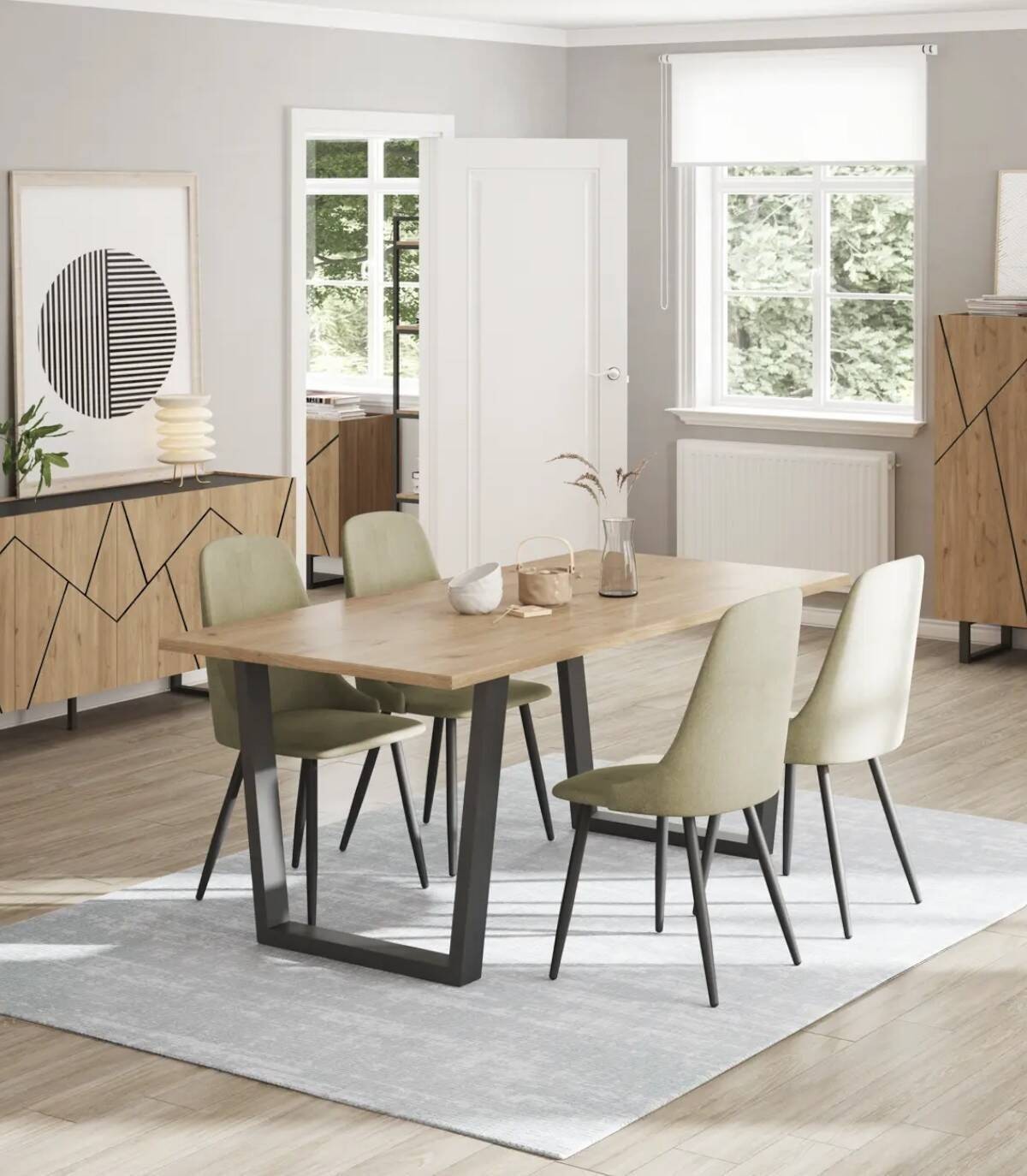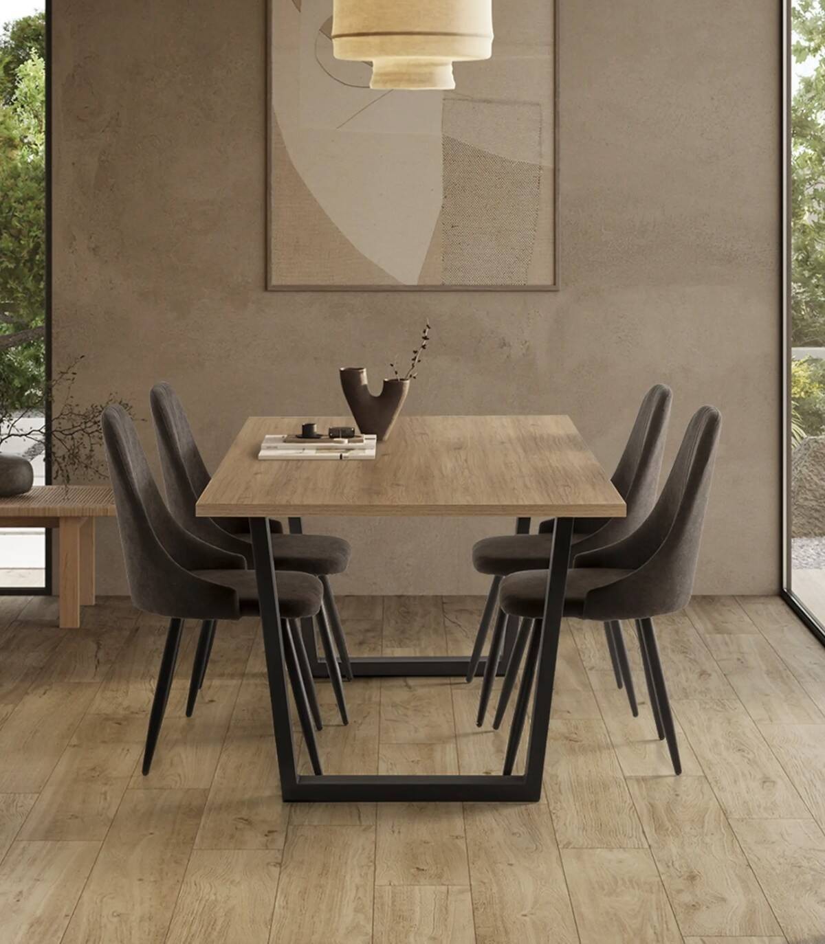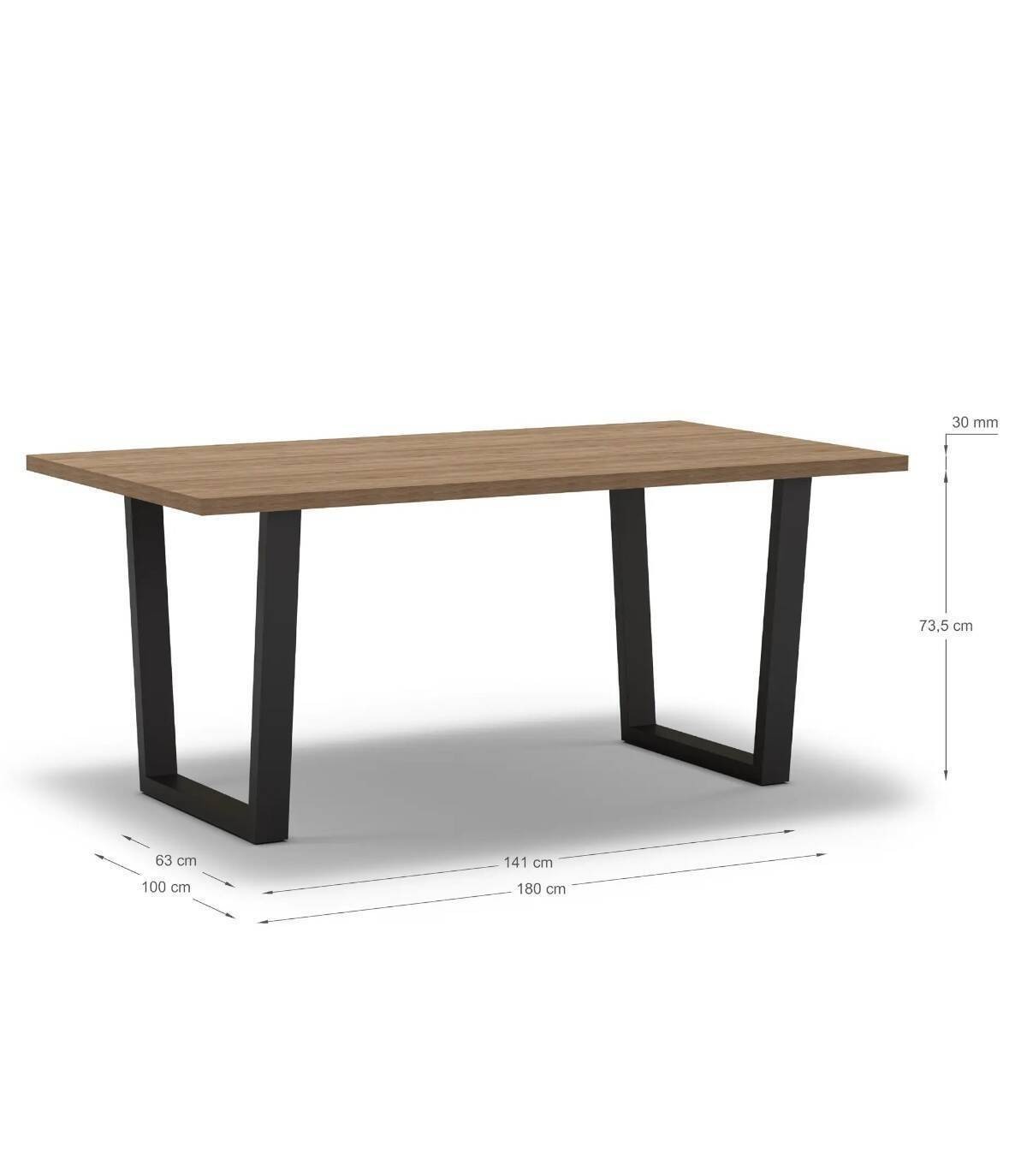 La mesa Tutely se compone de tablero rectangular de color madera sobre cuatro patas de metal pintado de color negro unidas por el extremo inferior en los laterales.