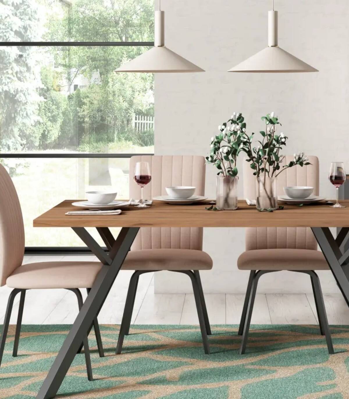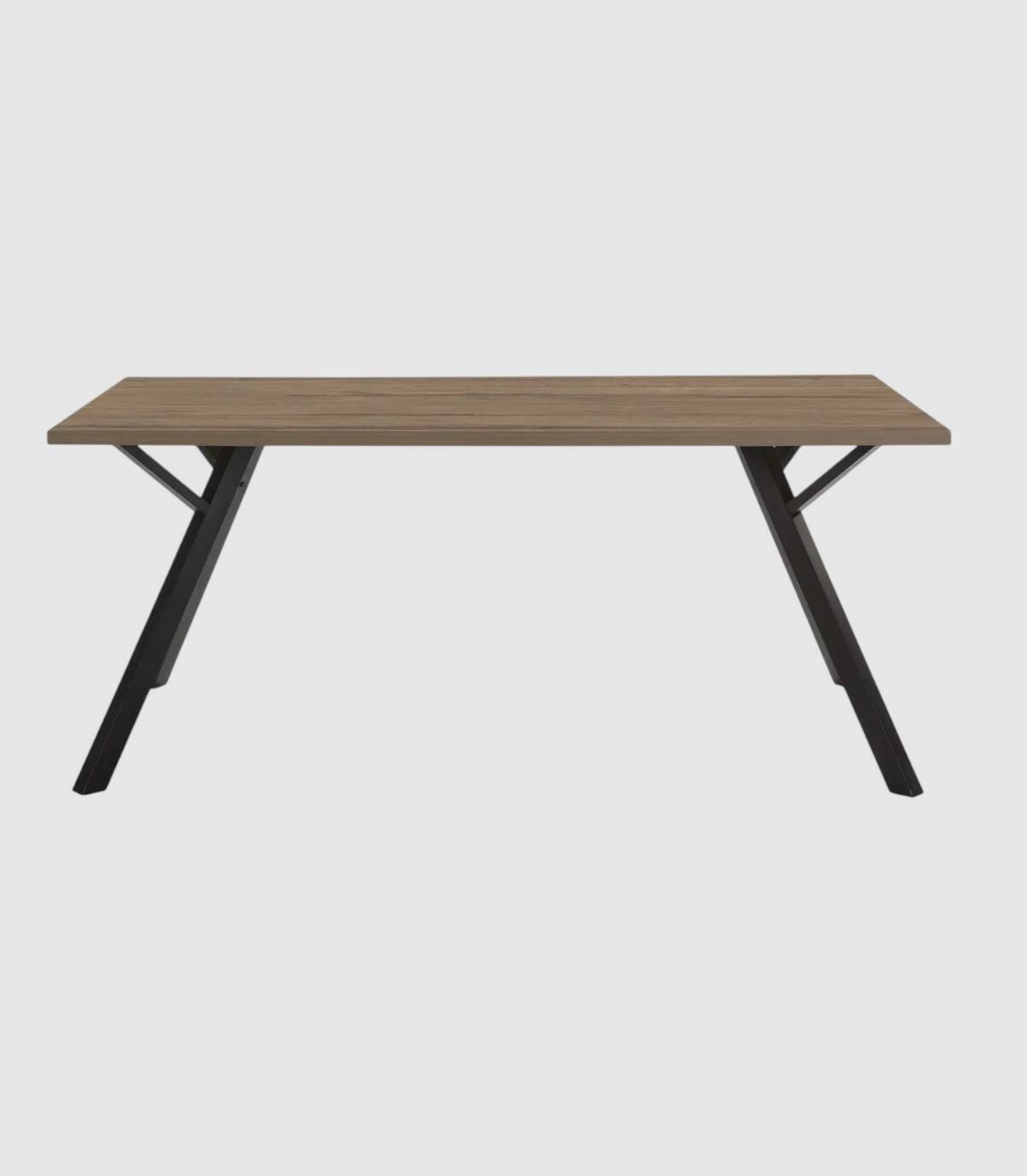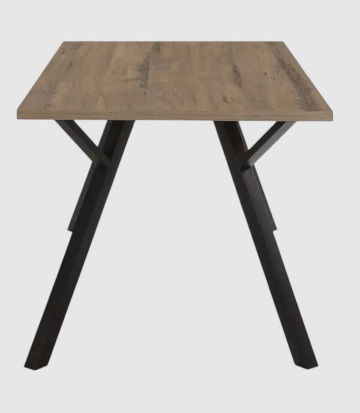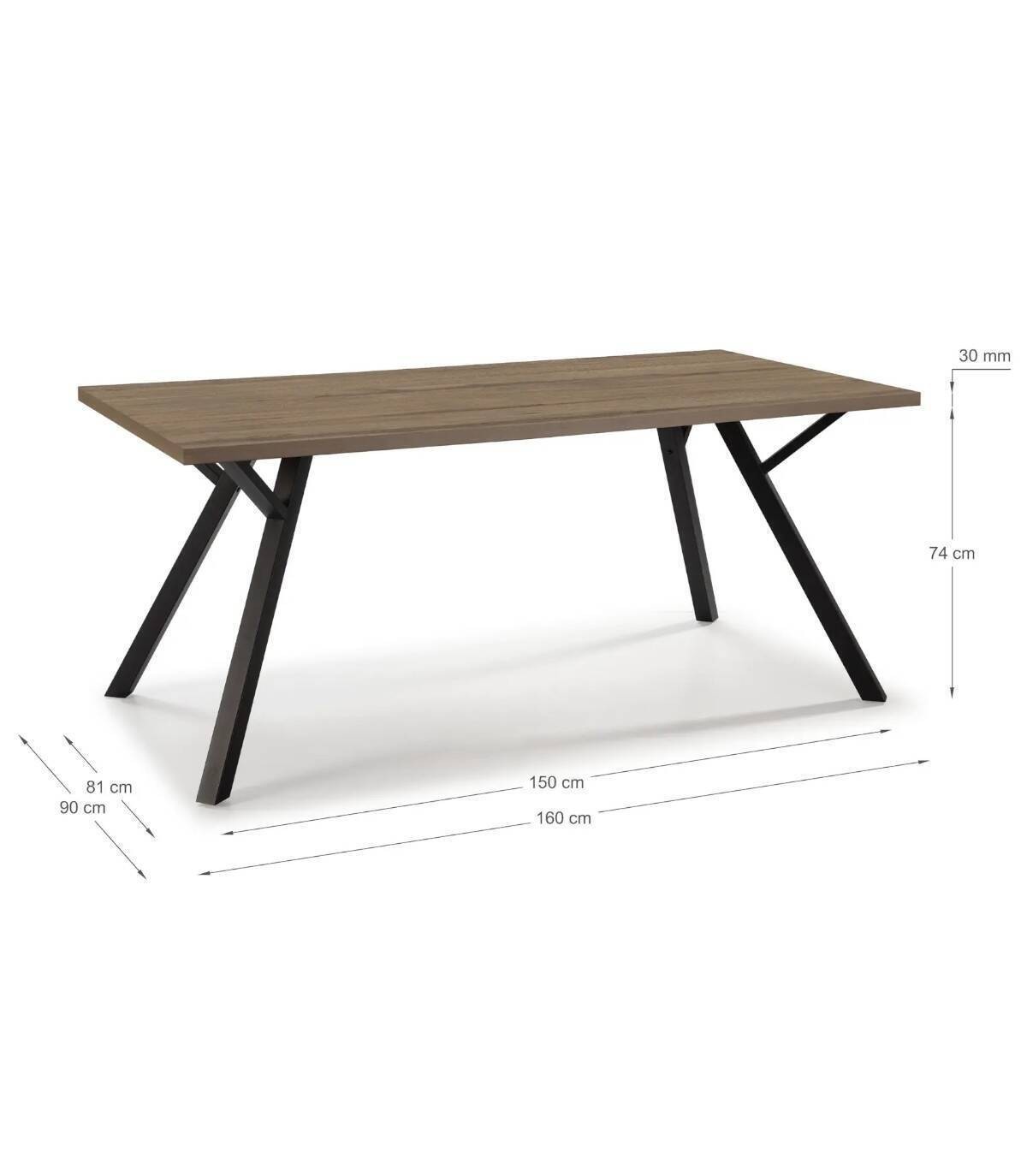 La mesa de comedor Conze se compone de tablero rectangular de melamina de color madera sobre cuatro de patas de metal de color negro.