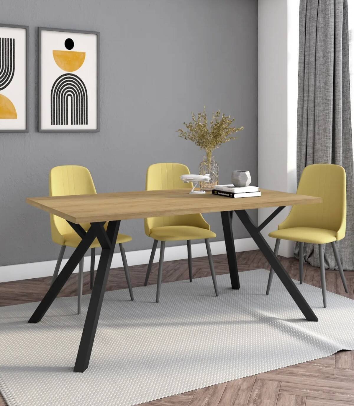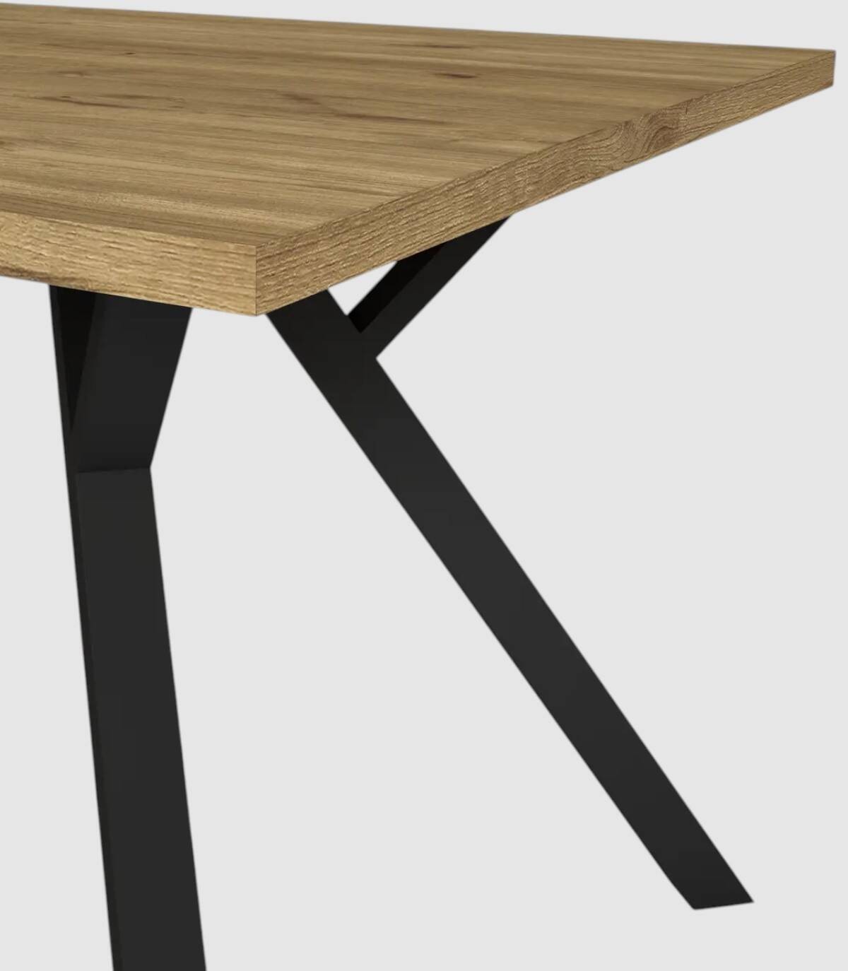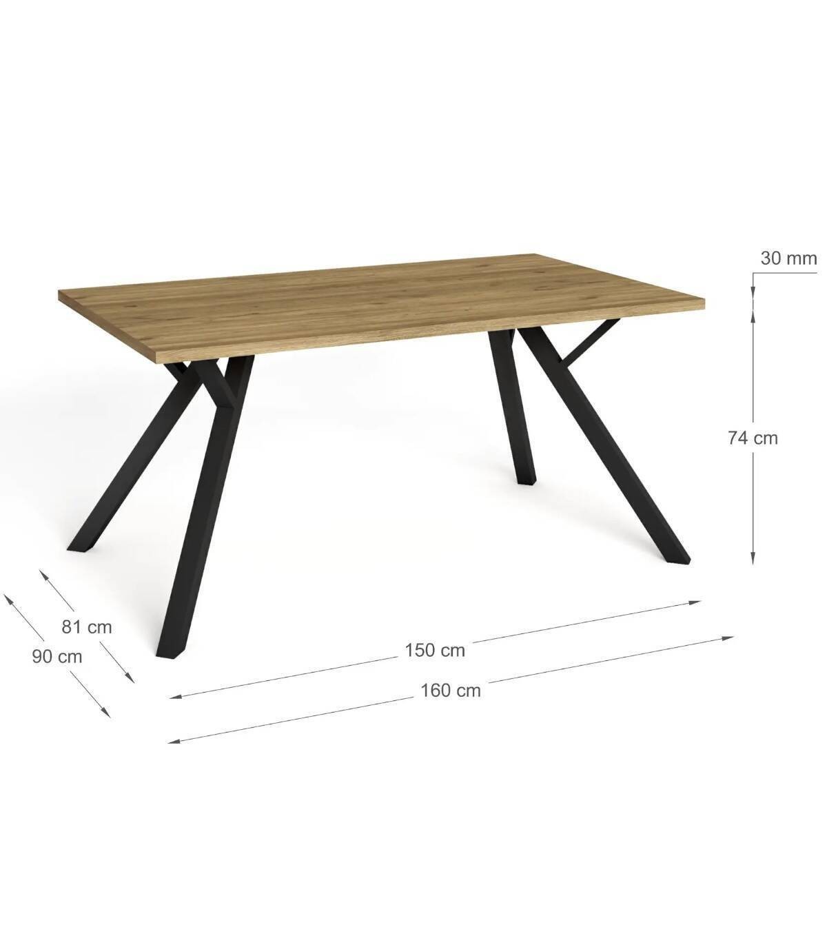 La mesa de comedor Conze se compone de tablero rectangular de melamina de color nogal sobre cuatro de patas de metal de color negro.