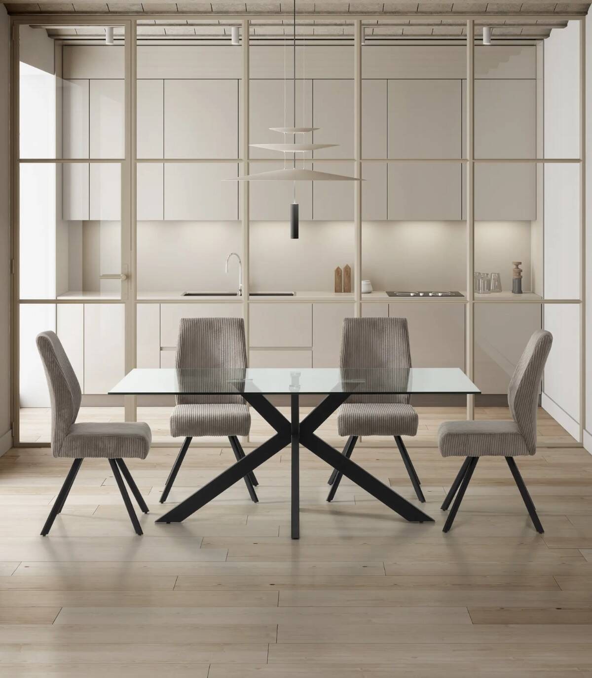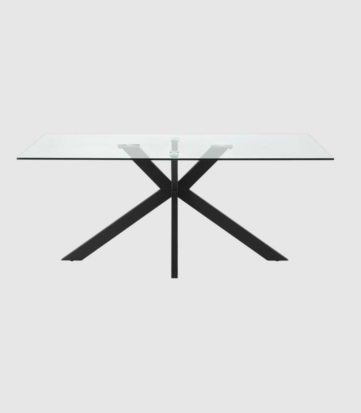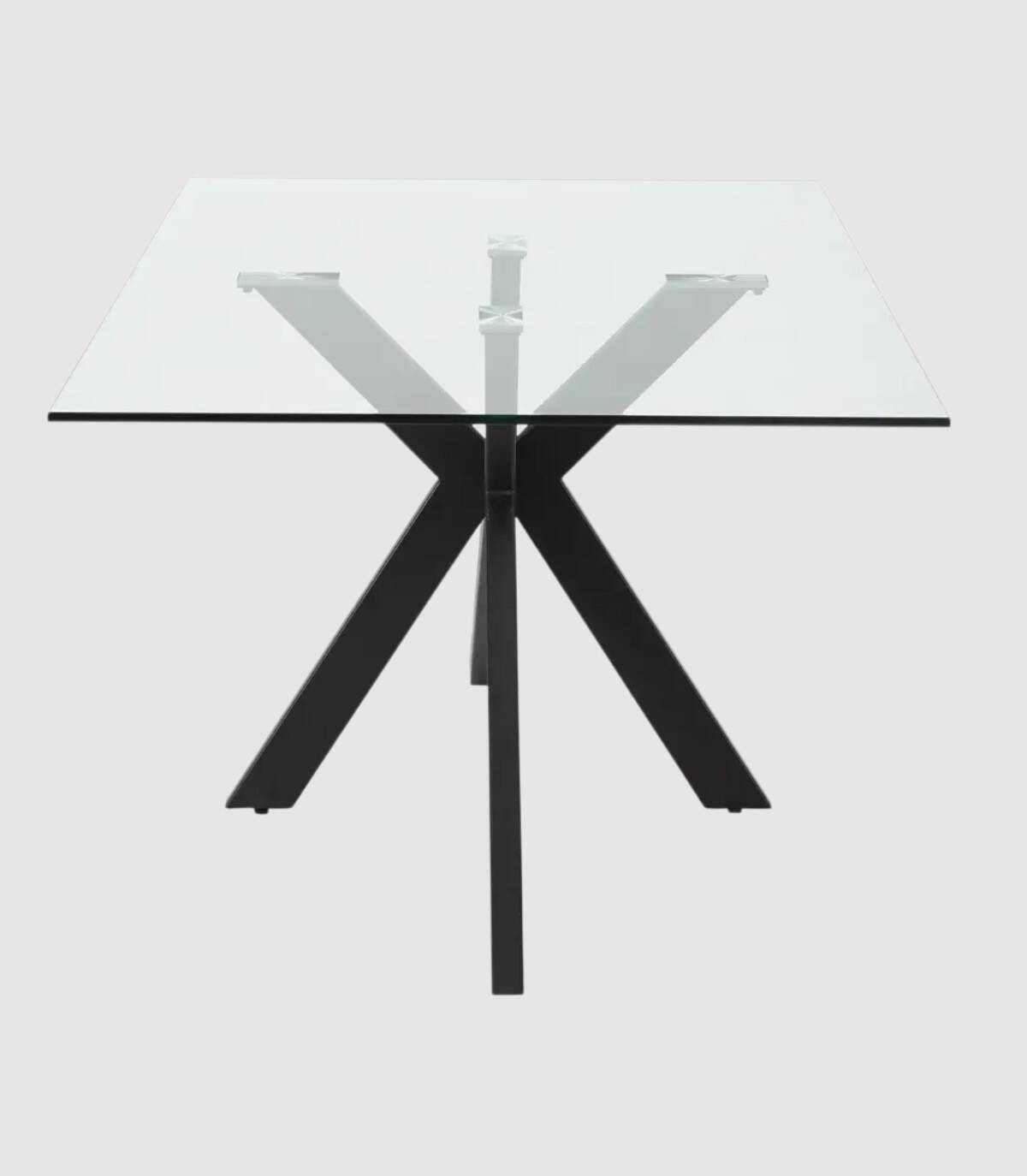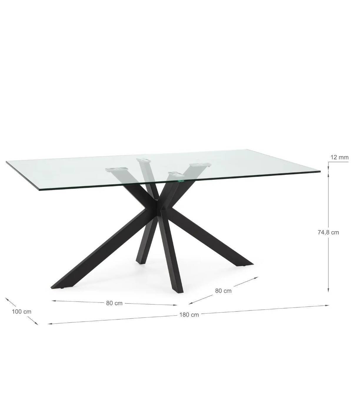 La mesa de comedor Tamba se compone de tablero rectangular de cristal de color transparente sobre cuatro patas de metal pintado de color negro.