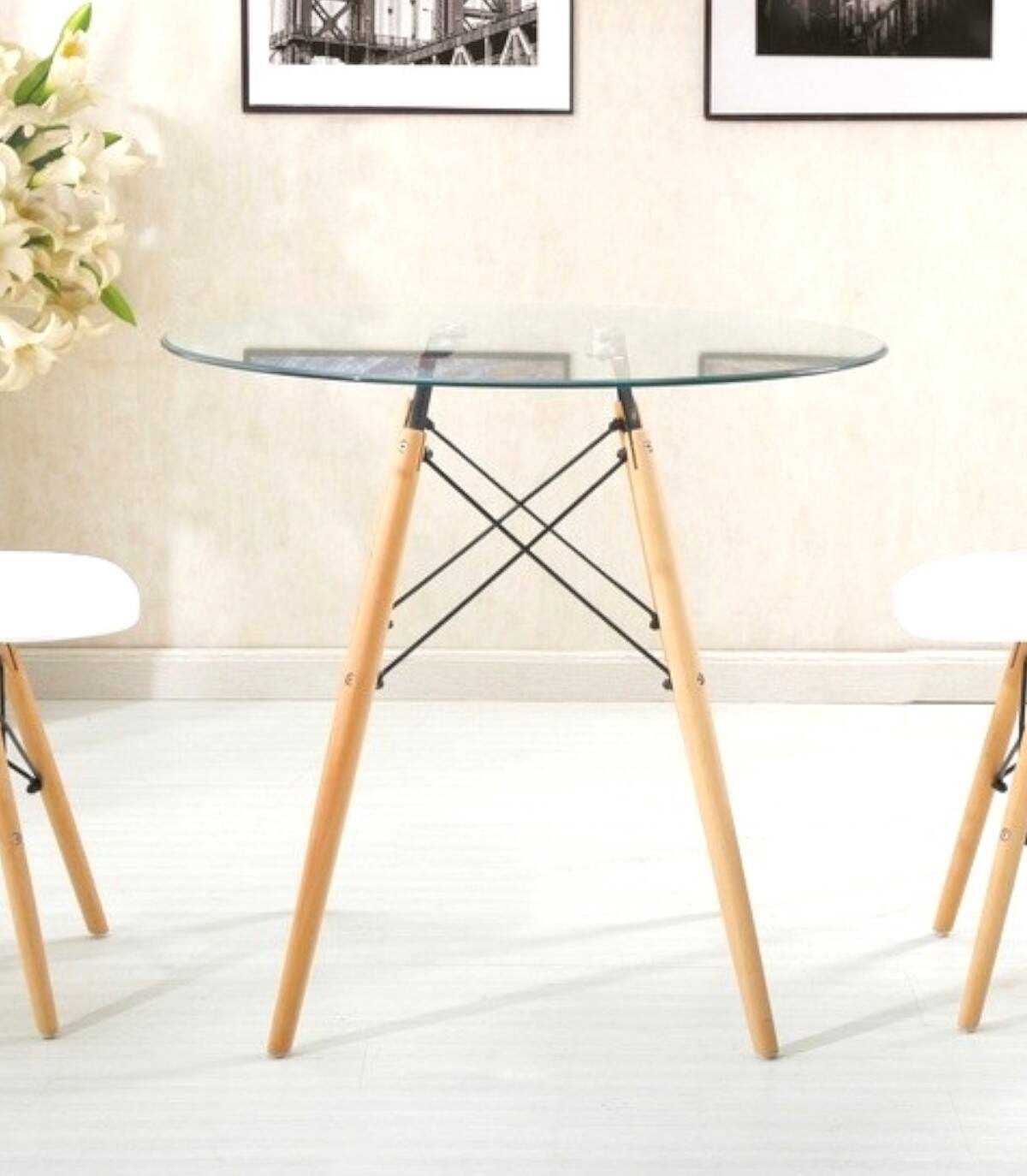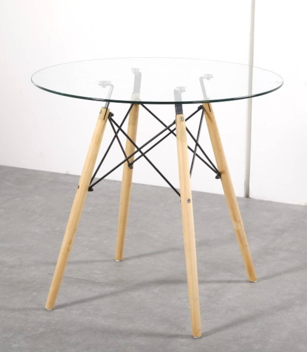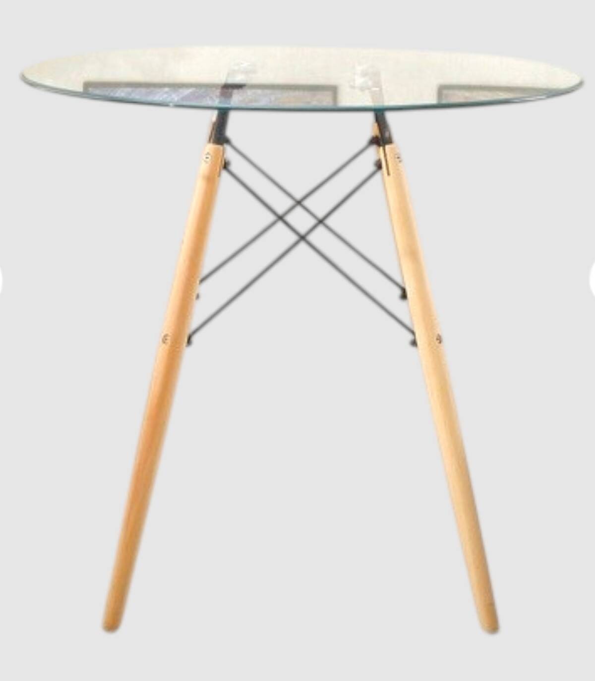 La mesa de comedor redonda Vintage se compone de tapa de cristal templado transparente de 8 mm y cuatro patas de madera maciza de haya con estructura de metal pintado de color negro en forma de varillas.