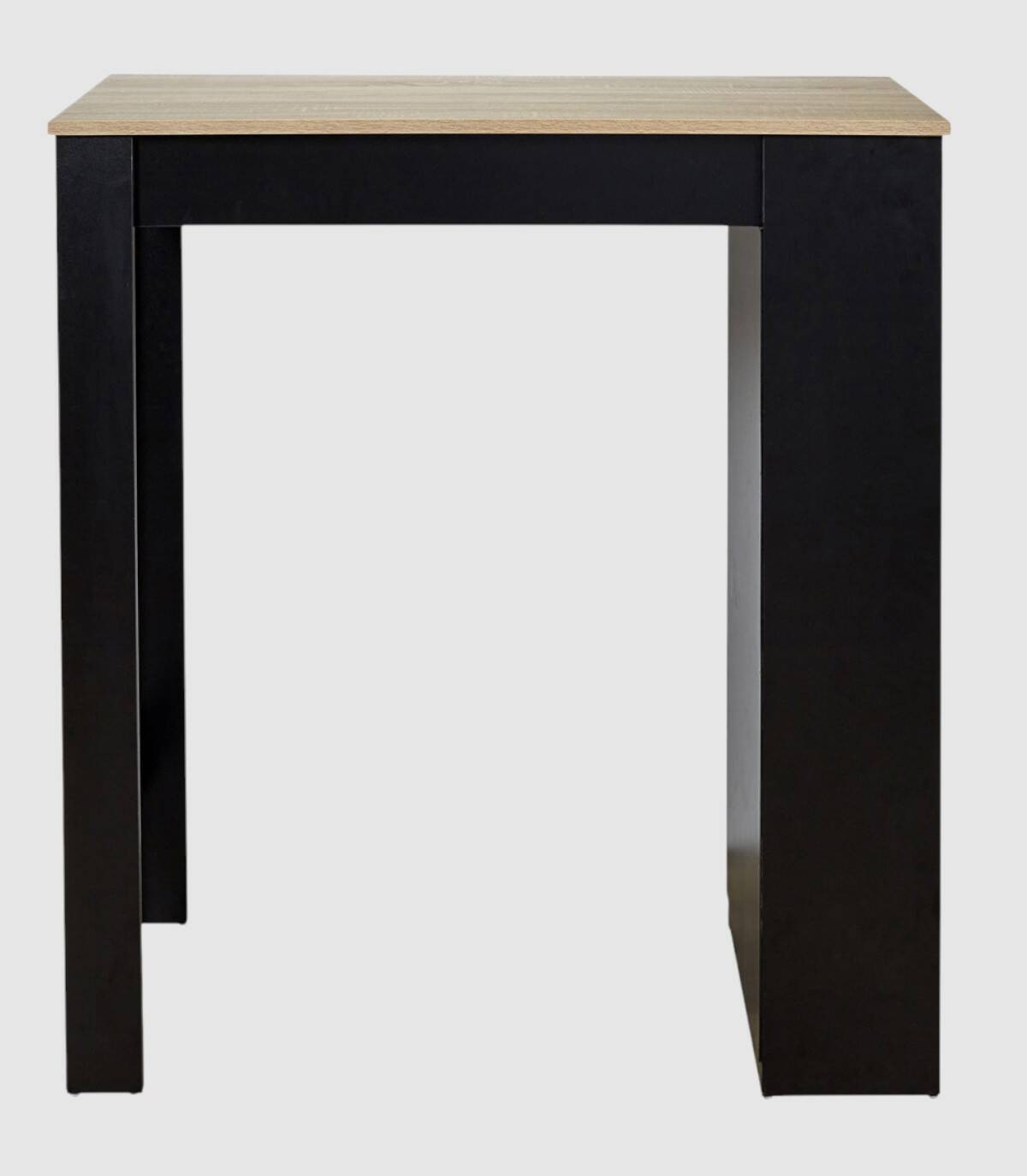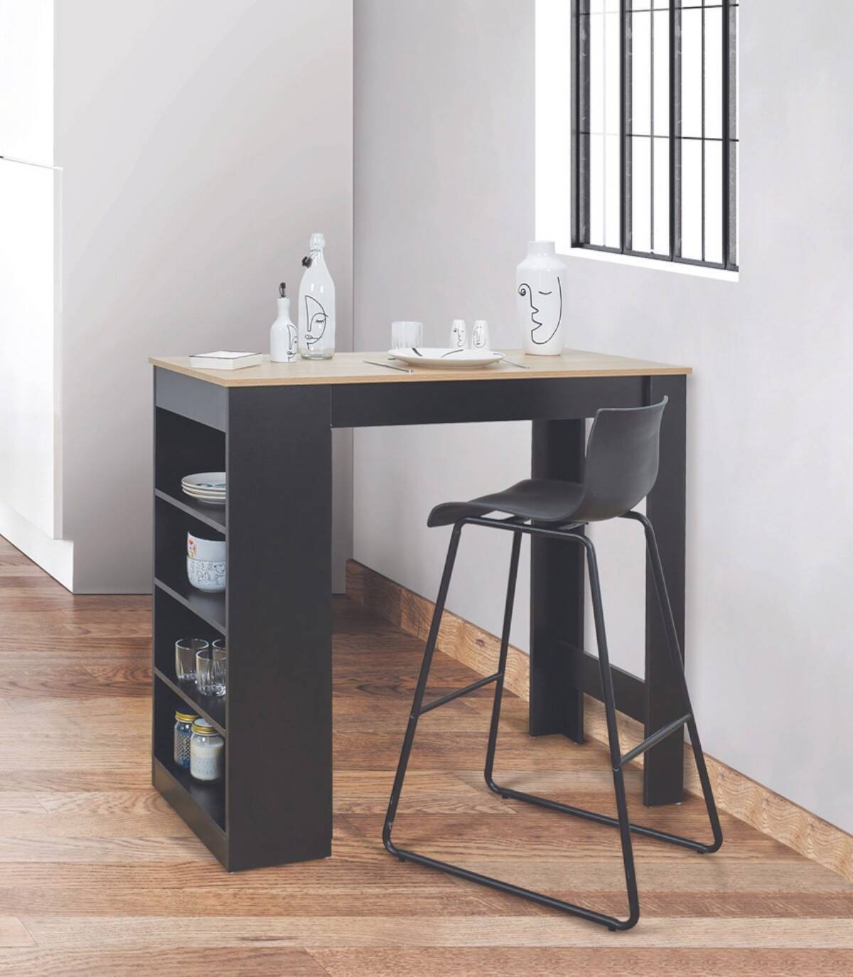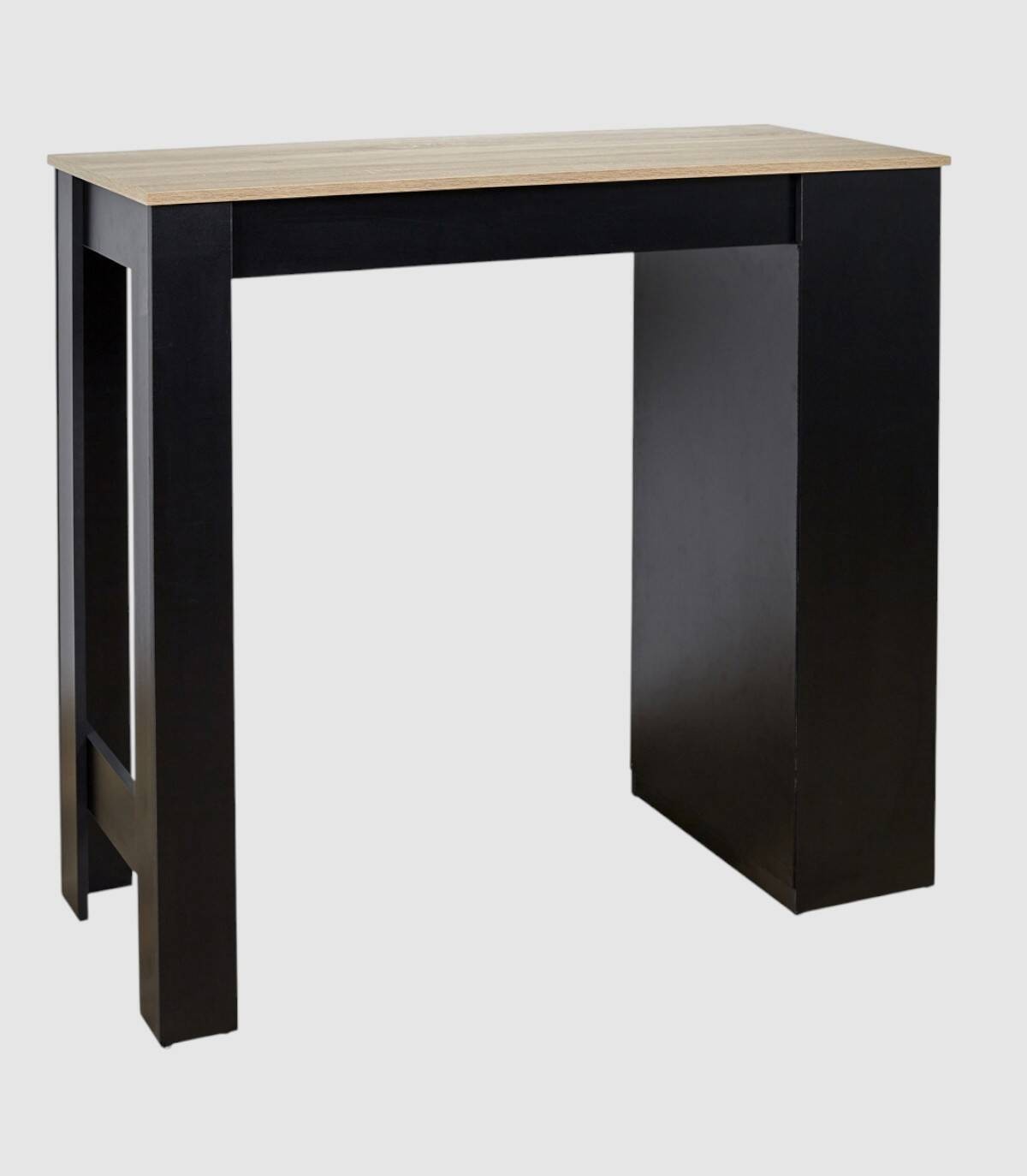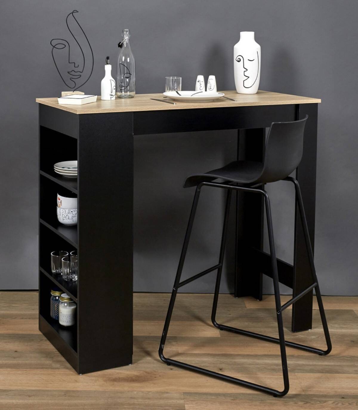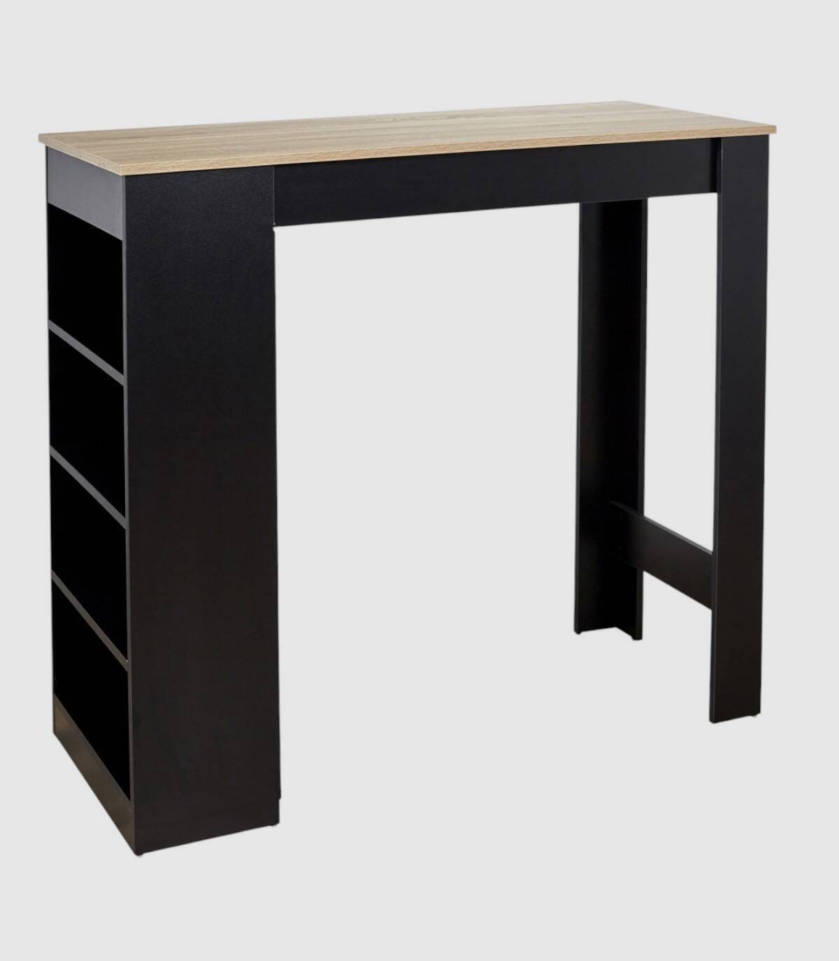 La mesa de bar alta se compone de un tablero de color madera sobre un estante de cuatro baldas a un lado y dos patas en el otro lado fabricado en paneles de partículas de color negro. Disfruta de tus momentos de convivencia alrededor de esta mesa de bar. Tiene 4 baldas en uno de los laterales para almacenar lo que necesites.