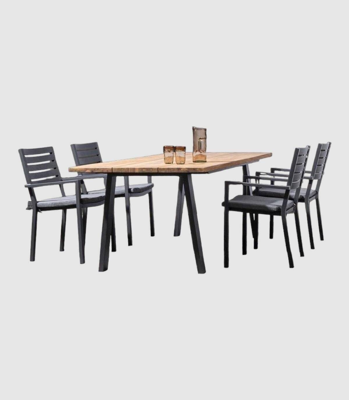 Het tafelblad Oslo is gemaakt van acacia hout FSC100%. Olie afwerking. Gepoedercoate (polyester) thermisch verzinkte stalen poten. Zijlatten in originele delen van de kofferbak. De vormen en afmetingen zijn slechts indicatief. De tafels zullen van elkaar verschillen. Poten vereisen montage.