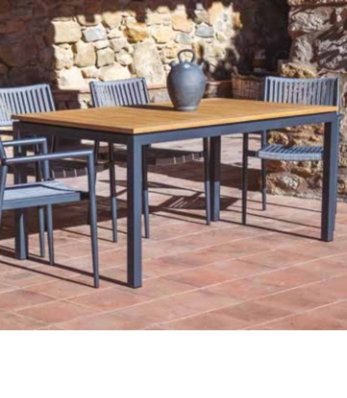 De Essential uitschuifbare aluminium eettafel Het is gemaakt van gepoedercoat aluminium (polyester). Het heeft een glad rechthoekig houten oppervlak. Alle 4 poten hebben antislip doppen.