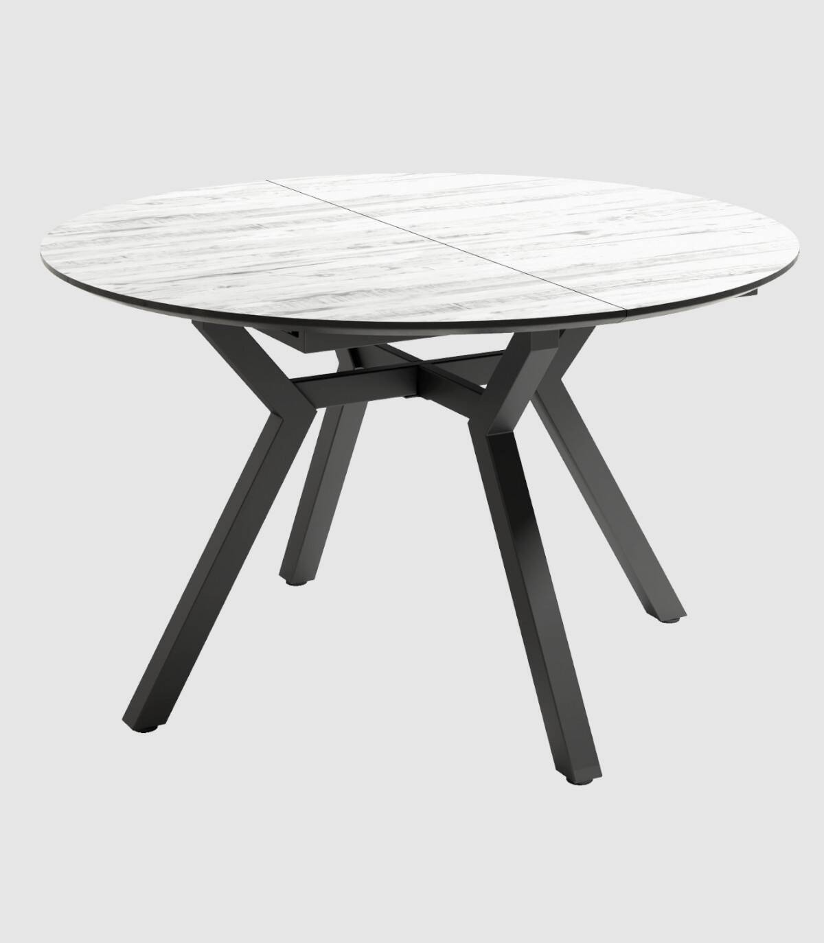De ronde Cantabrische tafel met verlengstuk, Het elegante en moderne ontwerp heeft een afgeschuinde bovenkant met een afwerking in houtstijl en een zwart gelakte metalen structuur.
