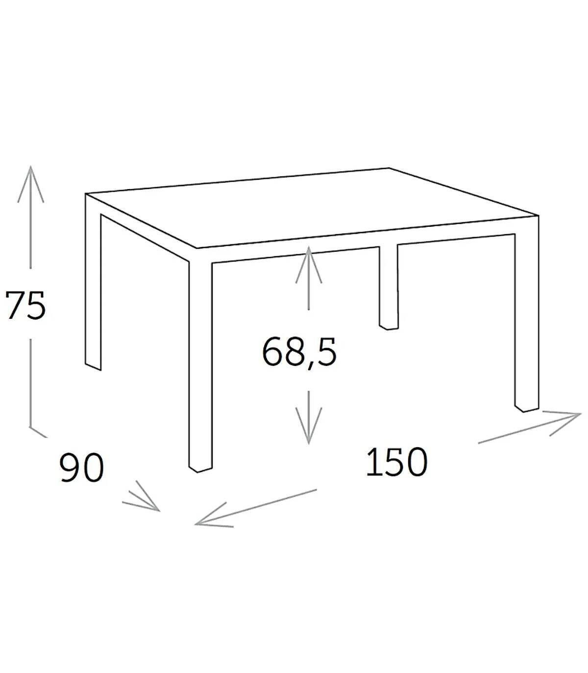 De eettafel A Het is gemaakt van gepoedercoat aluminium (polyester). Het heeft een glad rechthoekig glazen blad. Alle 4 poten hebben antislip doppen.