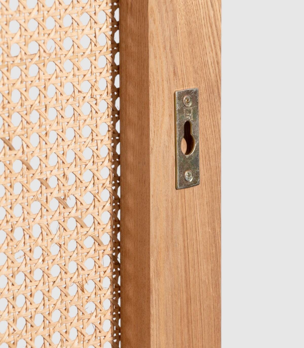 Read moreShow lessHet bestaat uit rieten rooster met gaten met een frame en poten van essenhout.