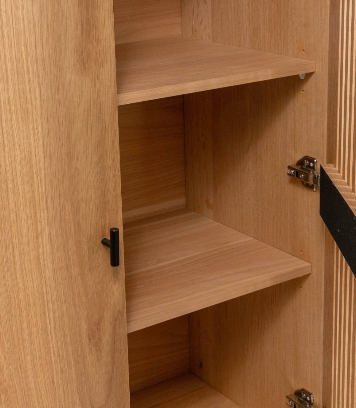 Het Samurai-meubel bestaat uit twee deuren, Elegant en modern ontwerp, het heeft een eikenhouten structuur en zwart gelakte metalen poten.