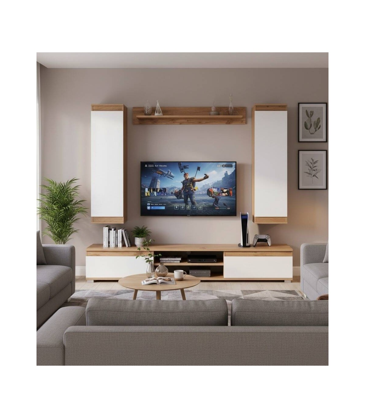 Lusia woonkamer meubelen modern, bestaande uit een televisietafel met twee deuren en een plank in het midden, een plank en twee kasten die op de muur steunen. De opening van de kasten is anders, de ene opent naar links en de andere naar rechts.