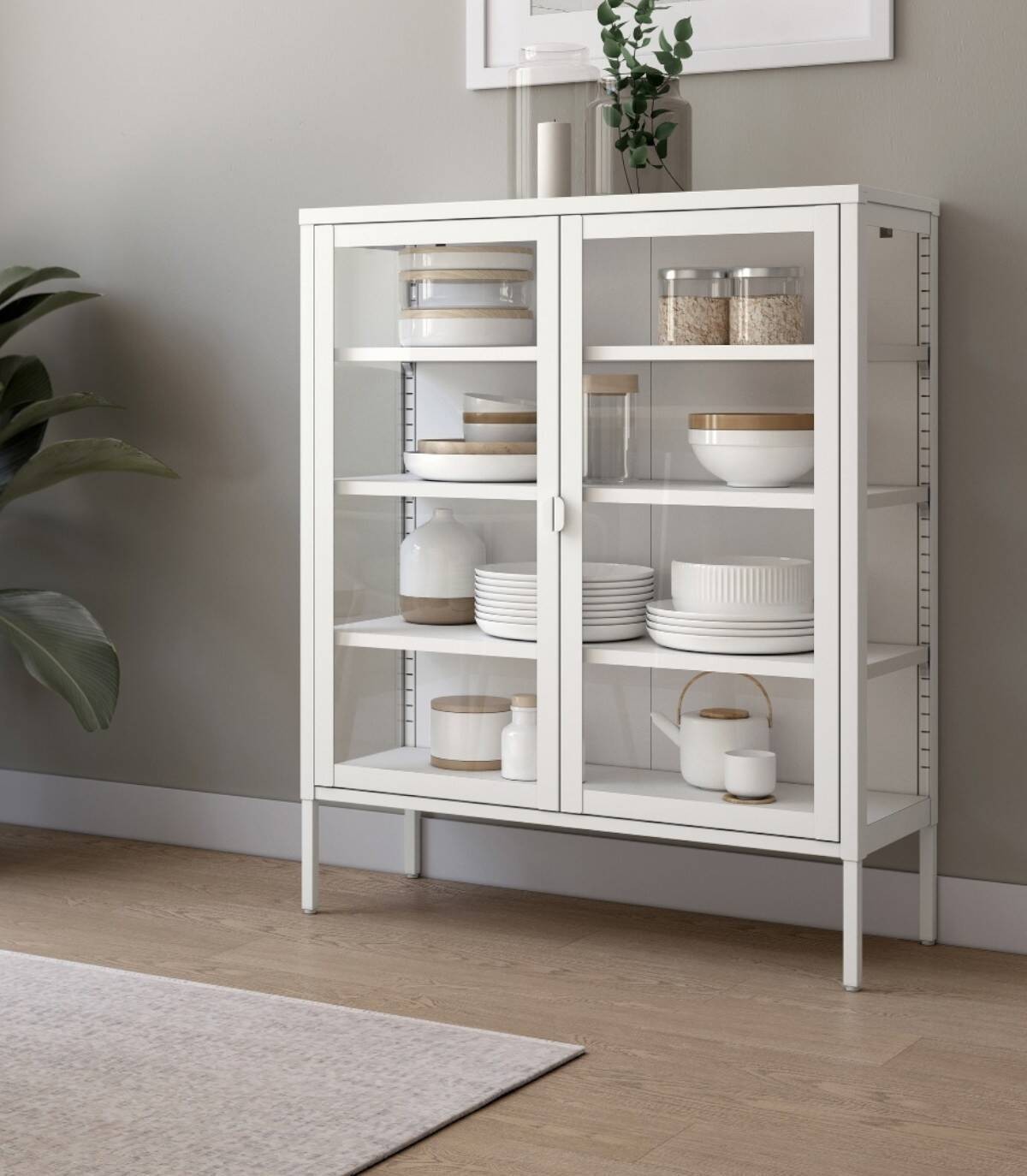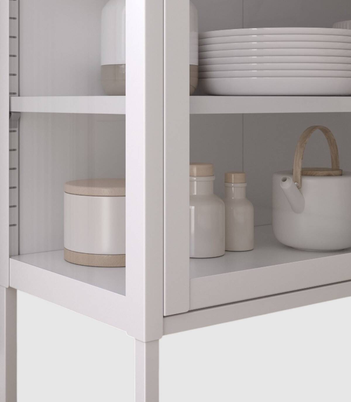 Read moreShow lessHet bestaat uit een crèmekleurige structuur met vier poten, vier planken en glazen deuren met handgrepen.
