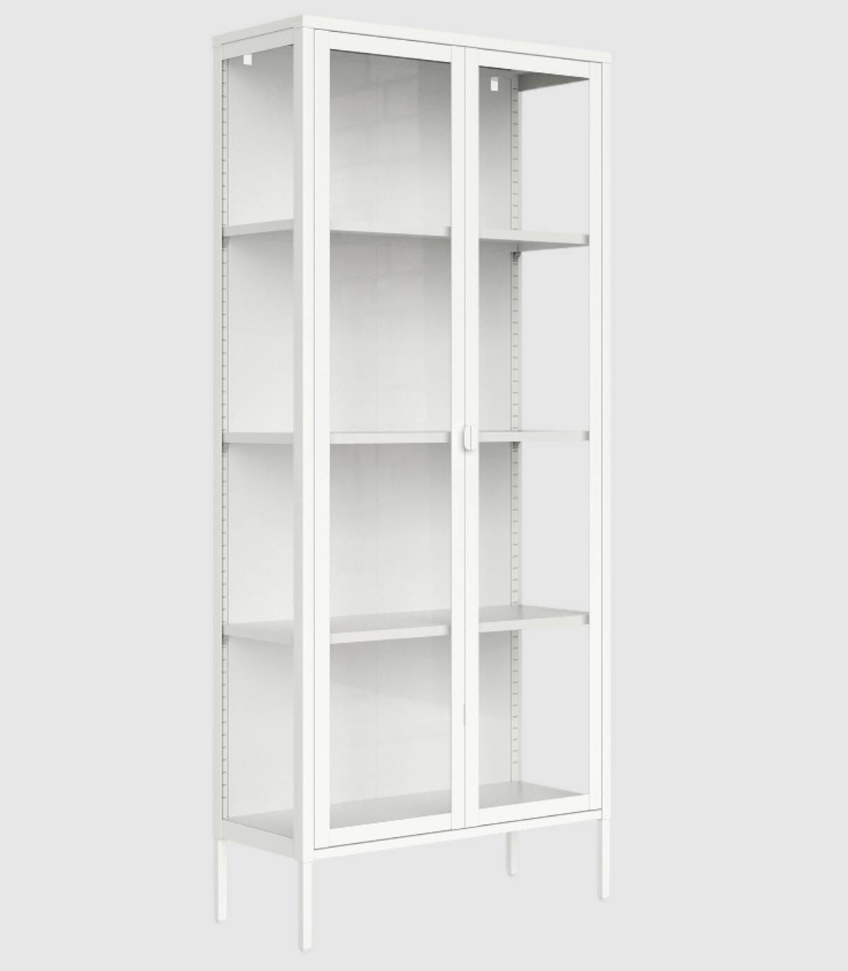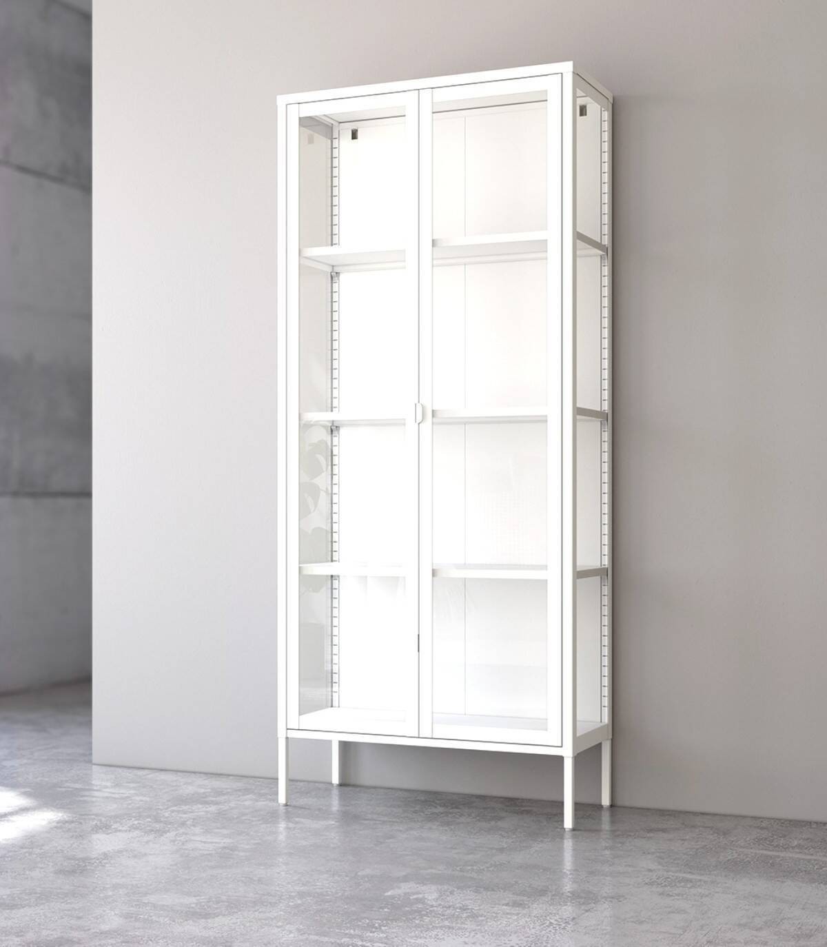 Read moreShow lessHet bestaat uit een crèmekleurige structuur met vier poten, vijf planken en glazen deuren met handgrepen.