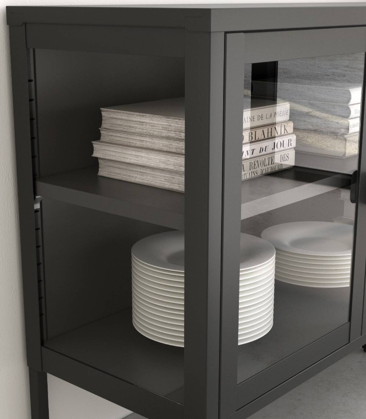 Read moreShow lessHet bestaat uit een zwarte structuur met vijf poten, twee planken en vier glazen deuren met handgrepen.