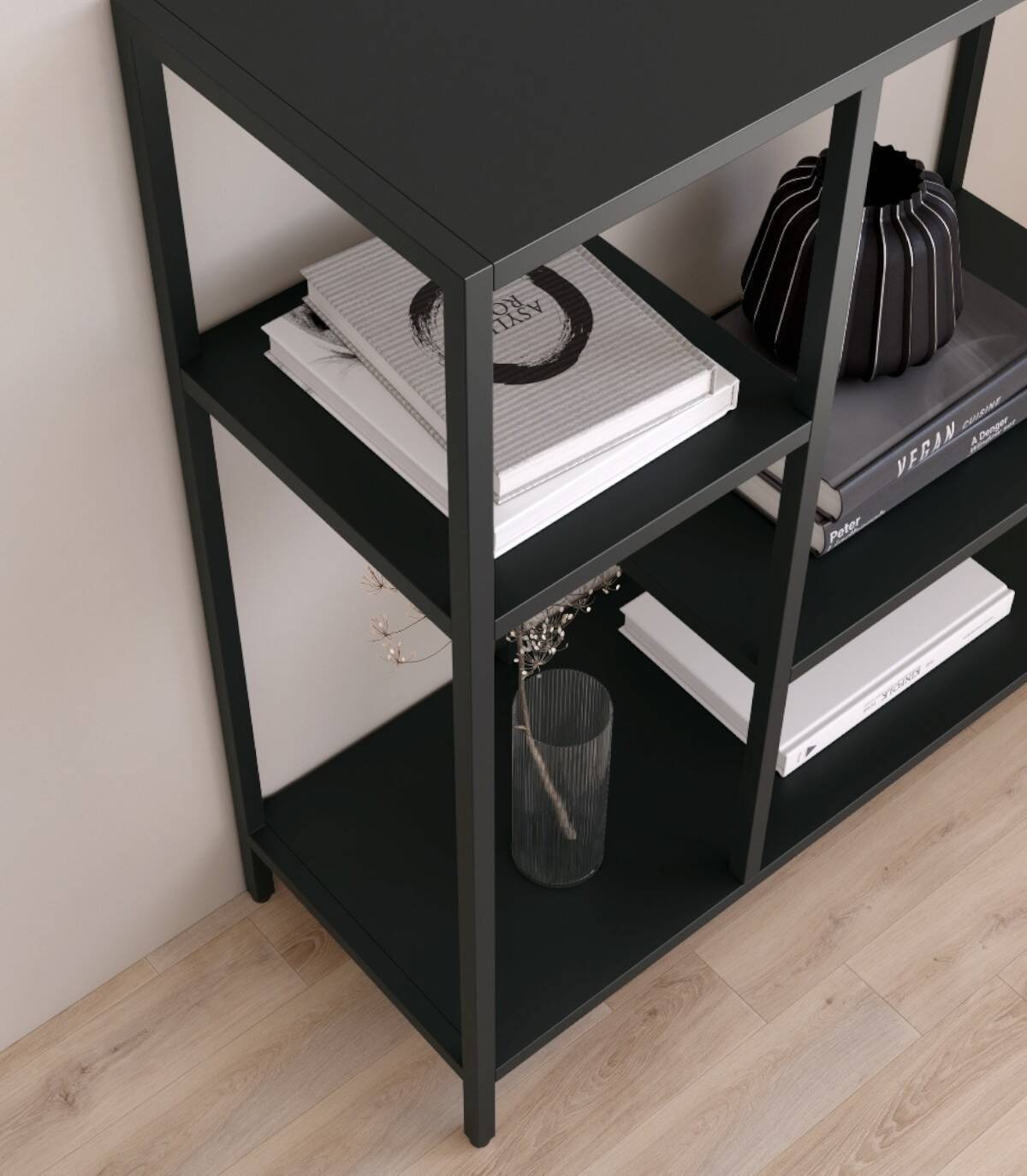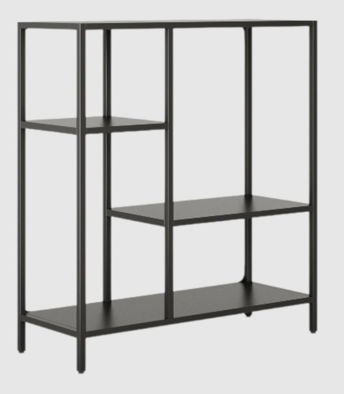 La estanteria Titania grande se compone de estructura de color negro con cuatro patas y cuatro baldas.