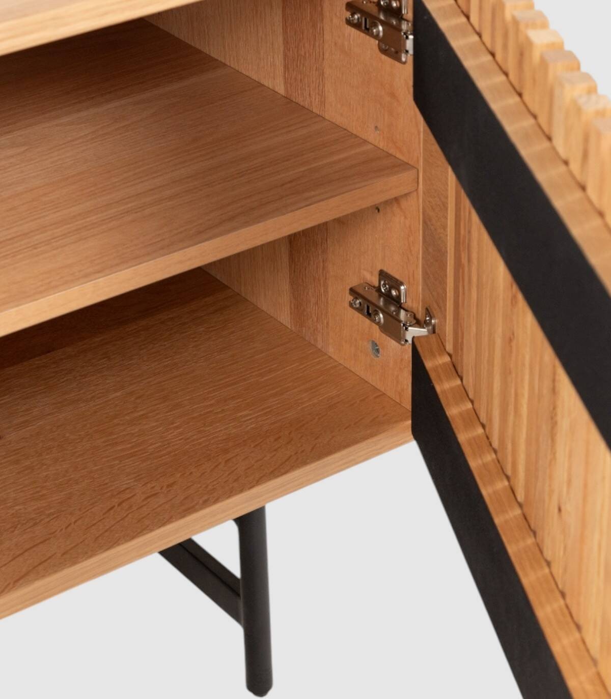 El mueble de TV Samurai se compone de tres puertas, de diseño elegante y moderno, tiene estructura de madera de chapa natural de roble, tiradores y patas metálicas pintadas de color negro.