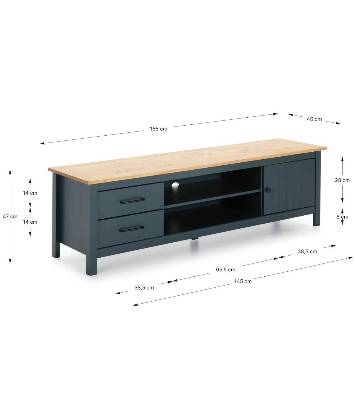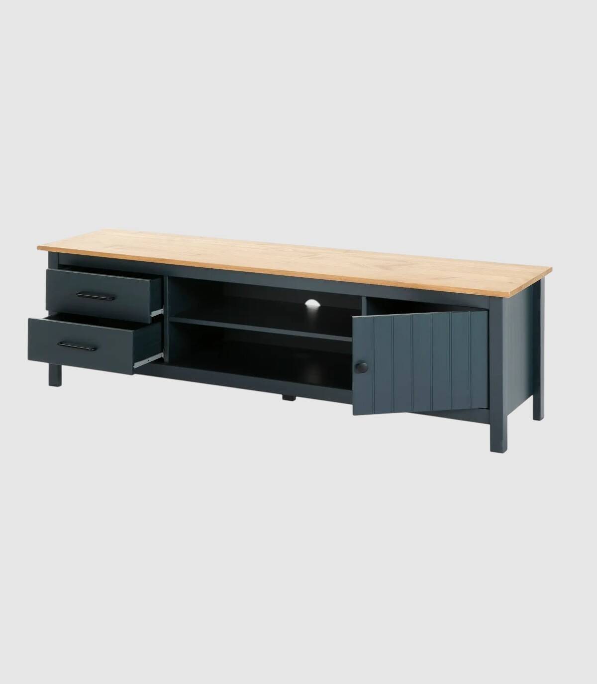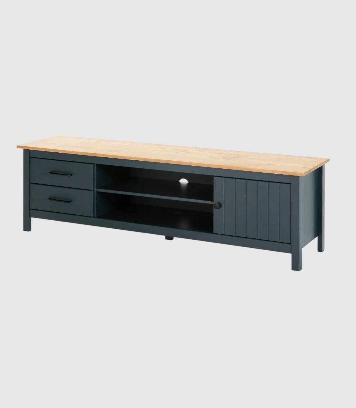 El mueble TV Dangal se compone de una puerta a la derecha con pomo y frontal con lineas verticales, dos cajones a la izquierda en vertical con tirador negro, dos huecos separados por una balda en el centro con hueco para cables en la trasera y tablero de color madera con estructura de madera de pino pintada de color azul sobre cinco patas.