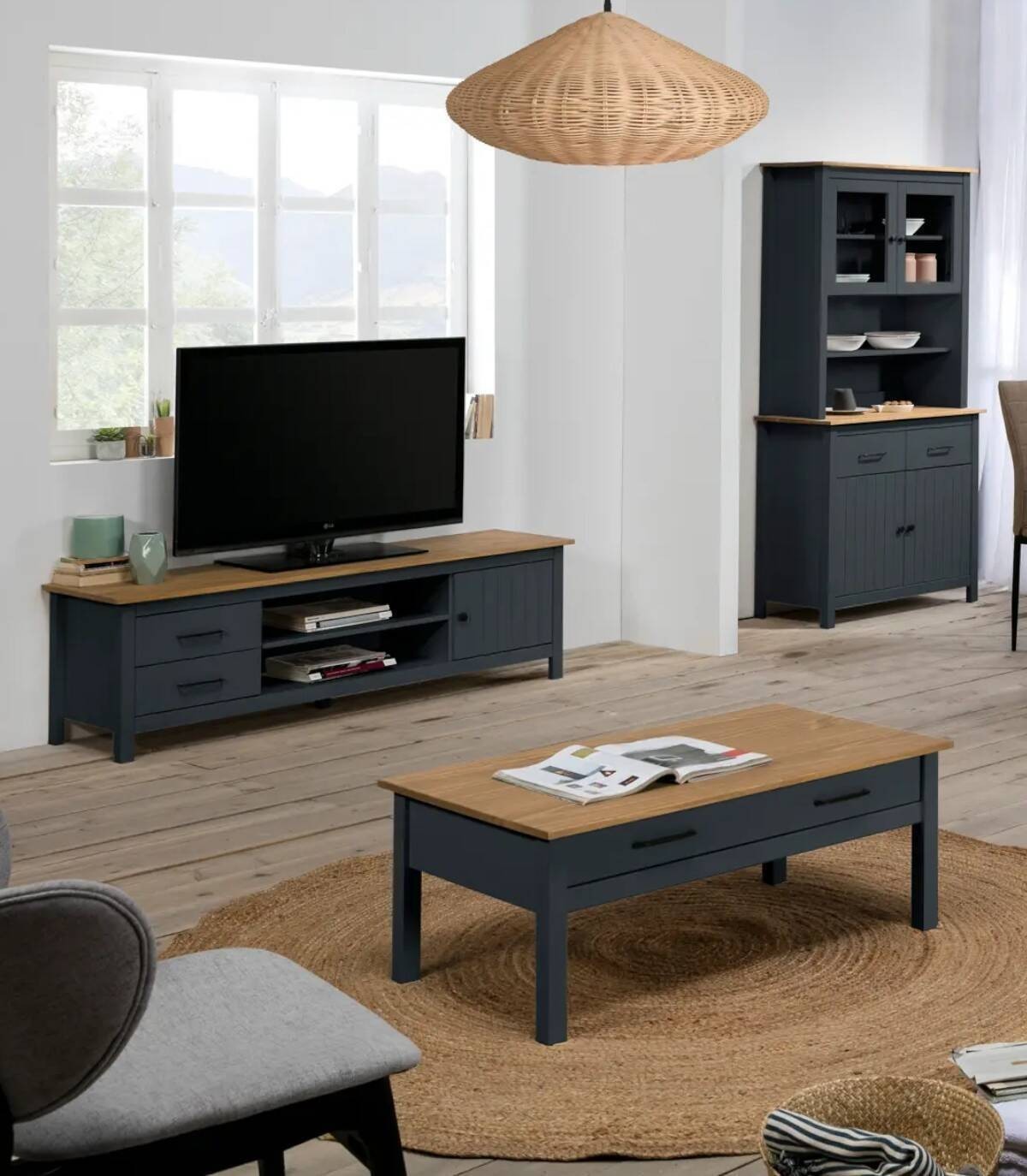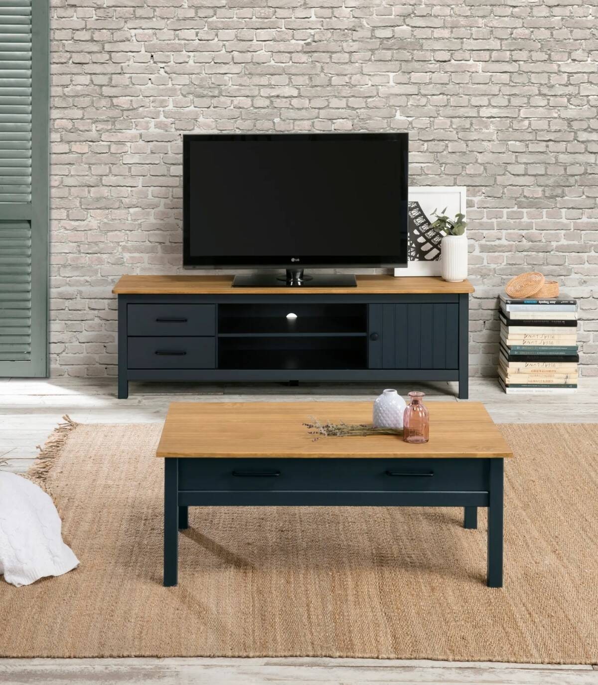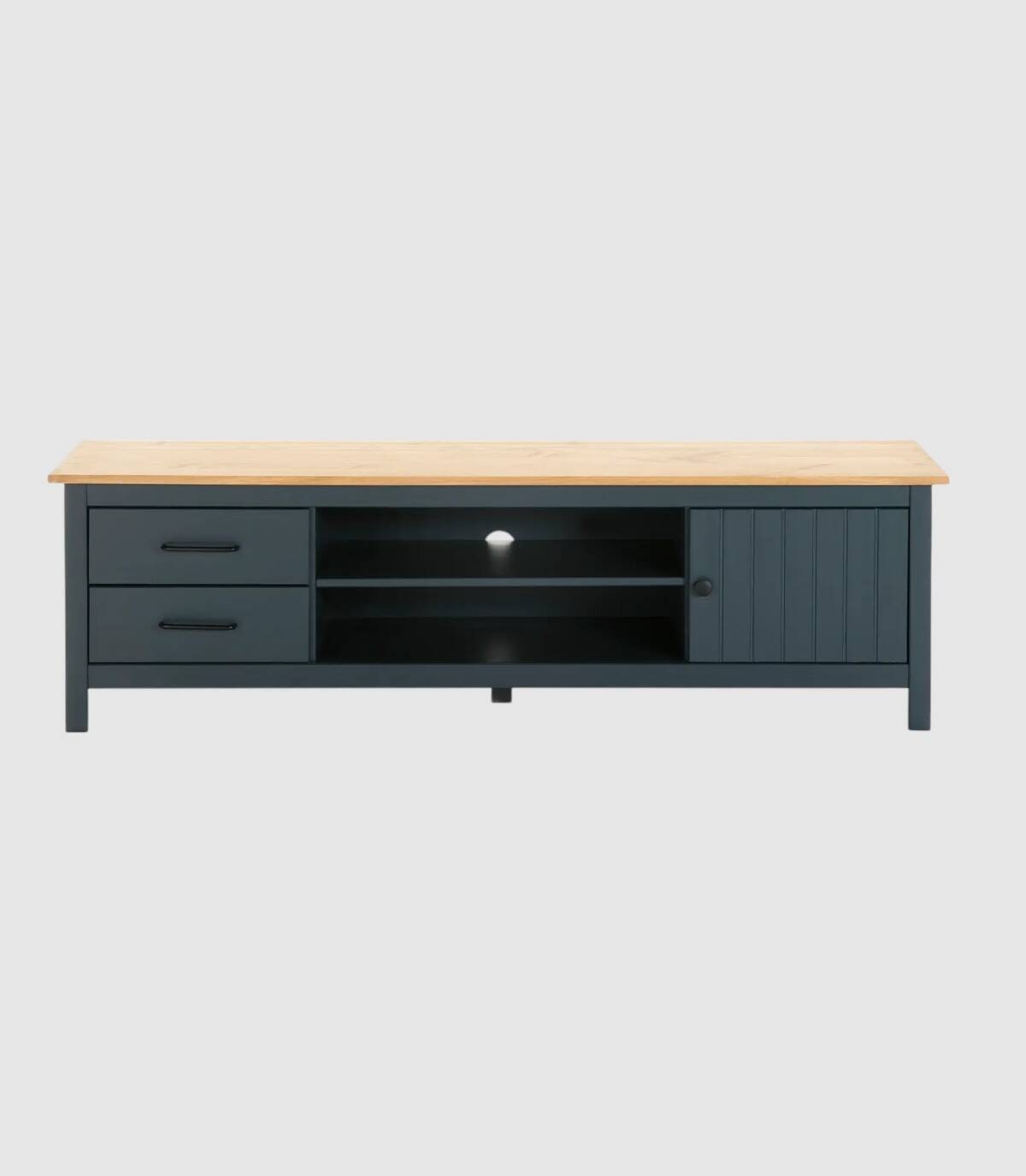 El mueble TV Dangal se compone de una puerta a la derecha con pomo y frontal con lineas verticales, dos cajones a la izquierda en vertical con tirador negro, dos huecos separados por una balda en el centro con hueco para cables en la trasera y tablero de color madera con estructura de madera de pino pintada de color azul sobre cinco patas.
