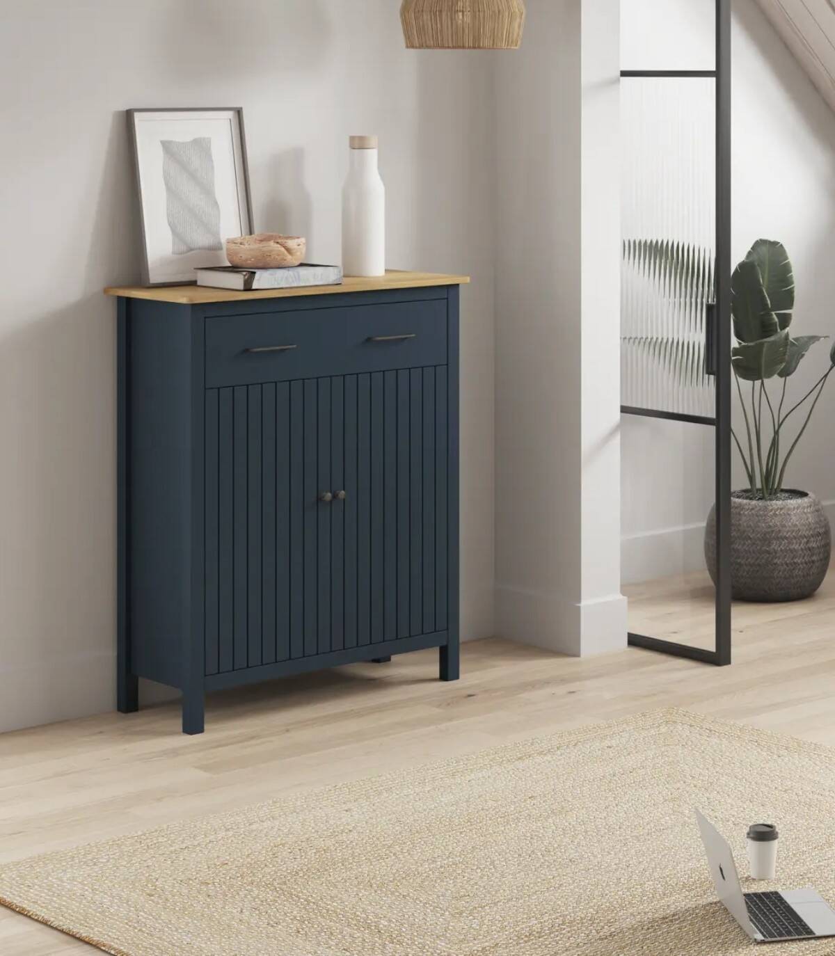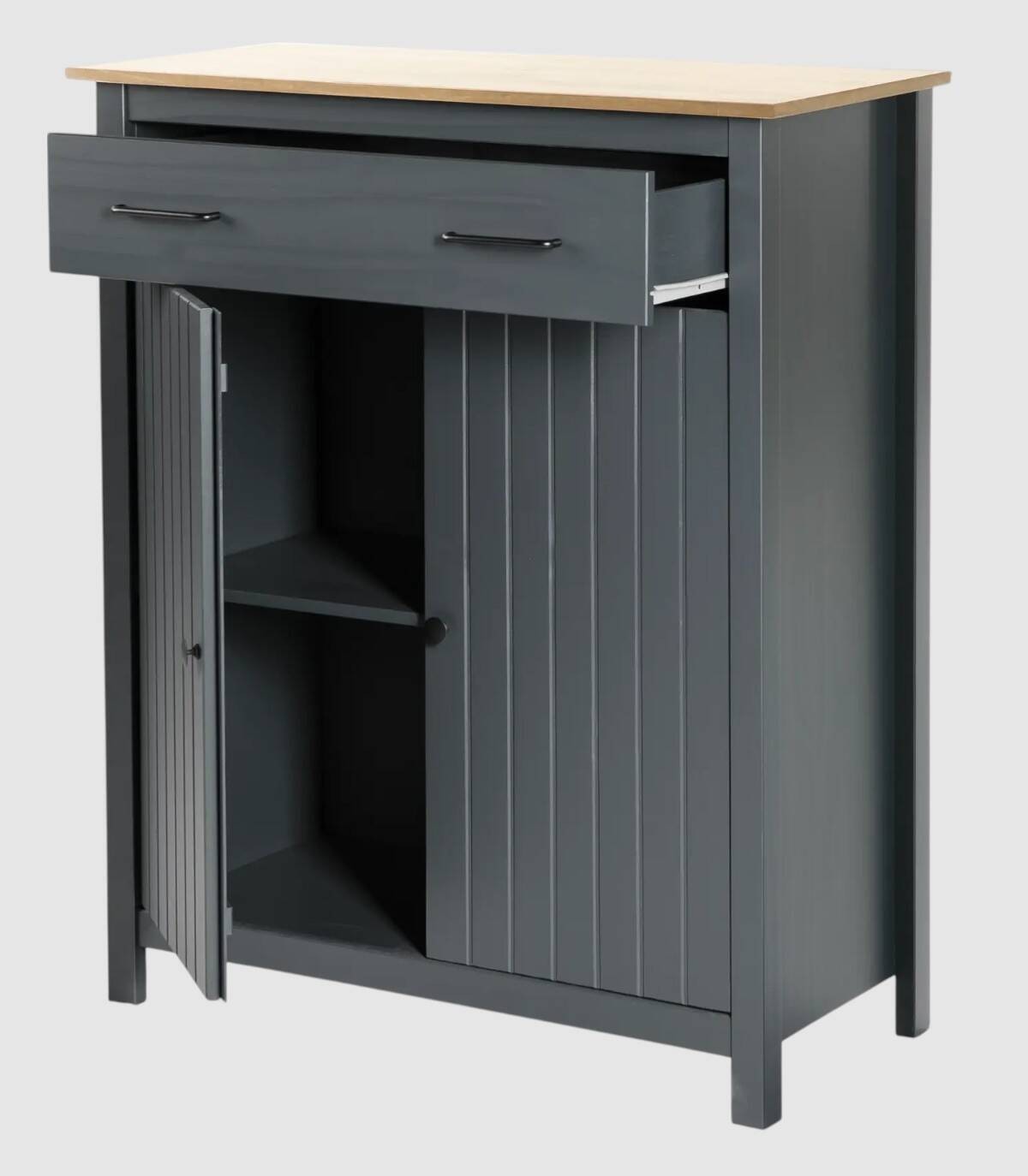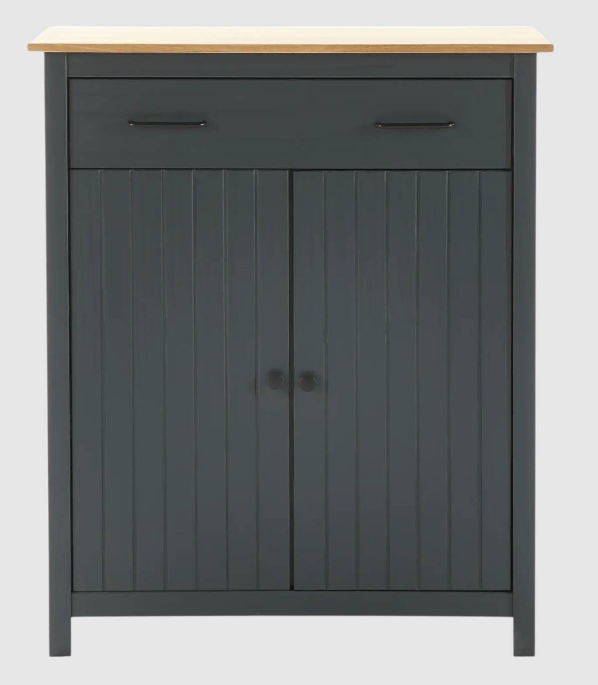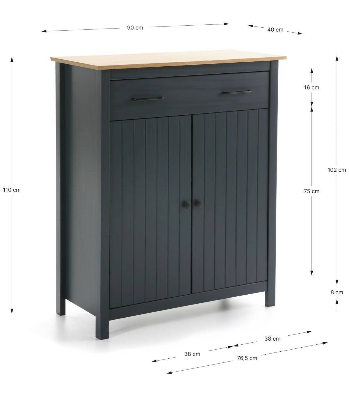 El mueble auxiliar Dangal se compone de dos puerta abajo con pomo y frontal con lineas verticales, un cajón arriba con tiradores negros y tablero de color madera con estructura de madera de pino pintada de color azul sobre cuatro patas.