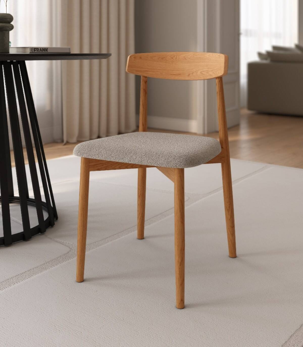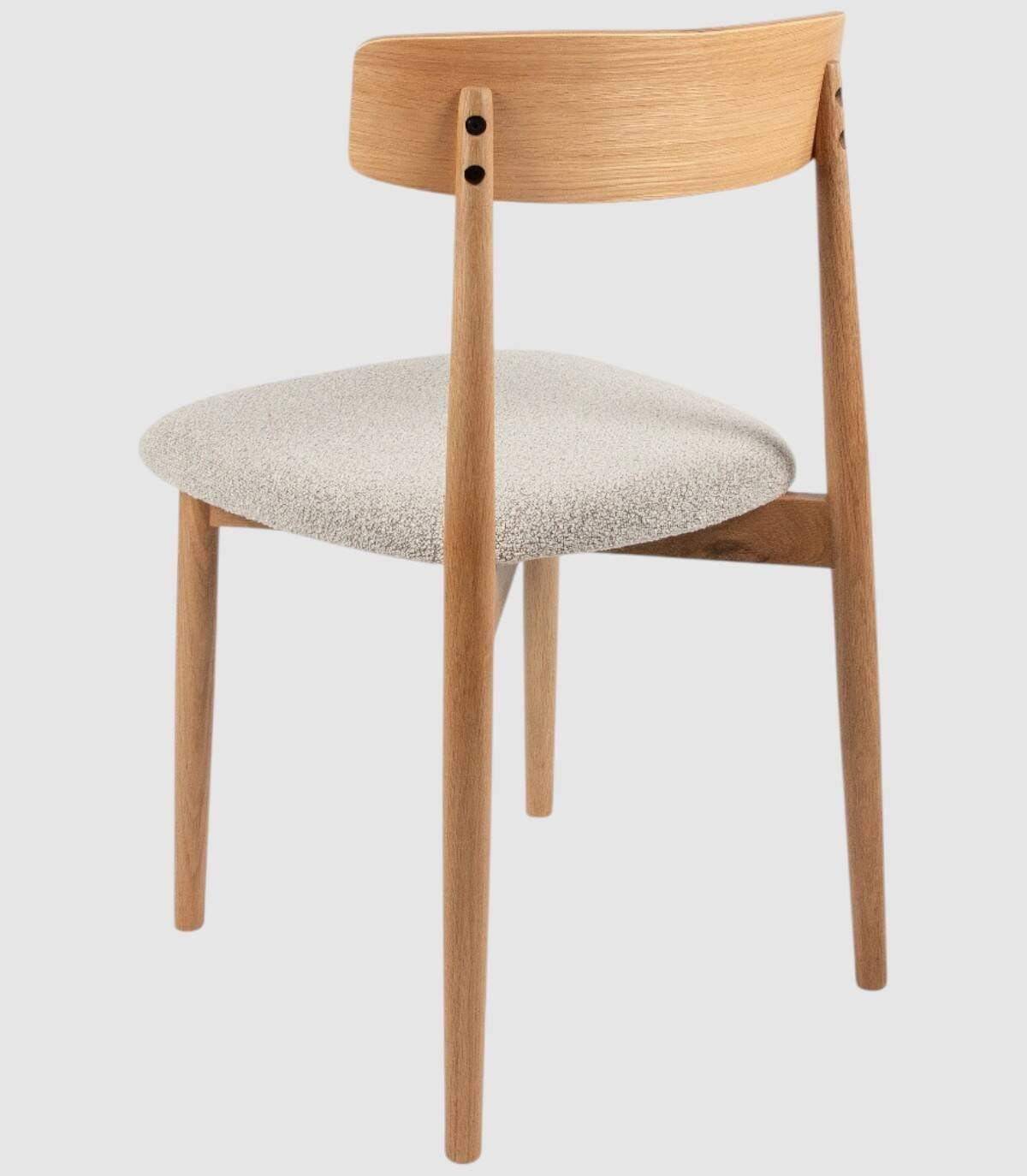Read moreShow lessHet bestaat uit een naturel eikenkleurige houten rugleuning, vier houten poten en een gestoffeerde zitting.