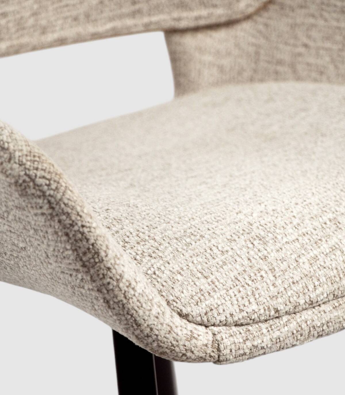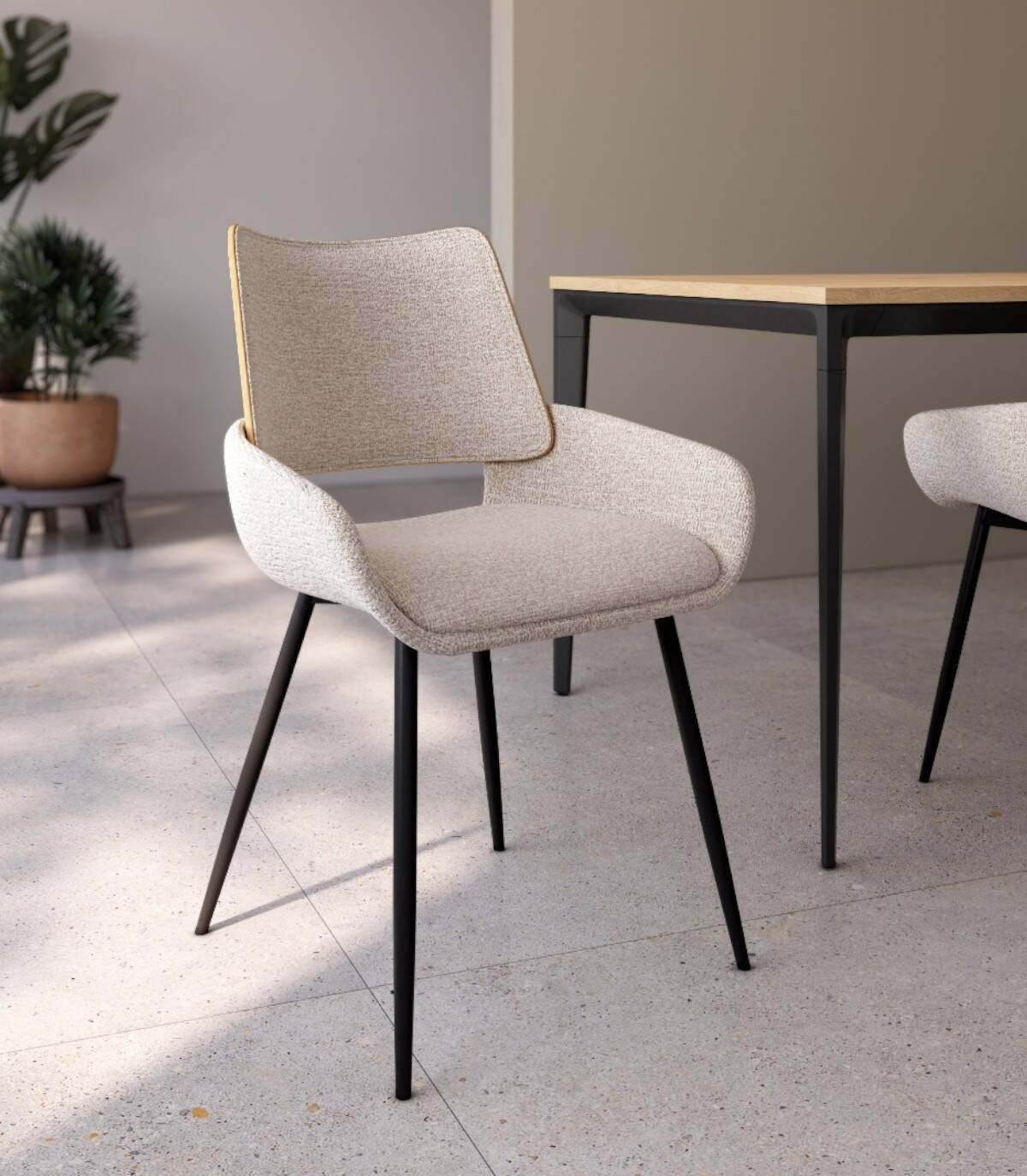 Read moreShow lessHet bestaat uit een naturel eikenkleurige en gestoffeerde houten rugleuning, vier zwart metalen poten, een gestoffeerde zitting en armleuningen.