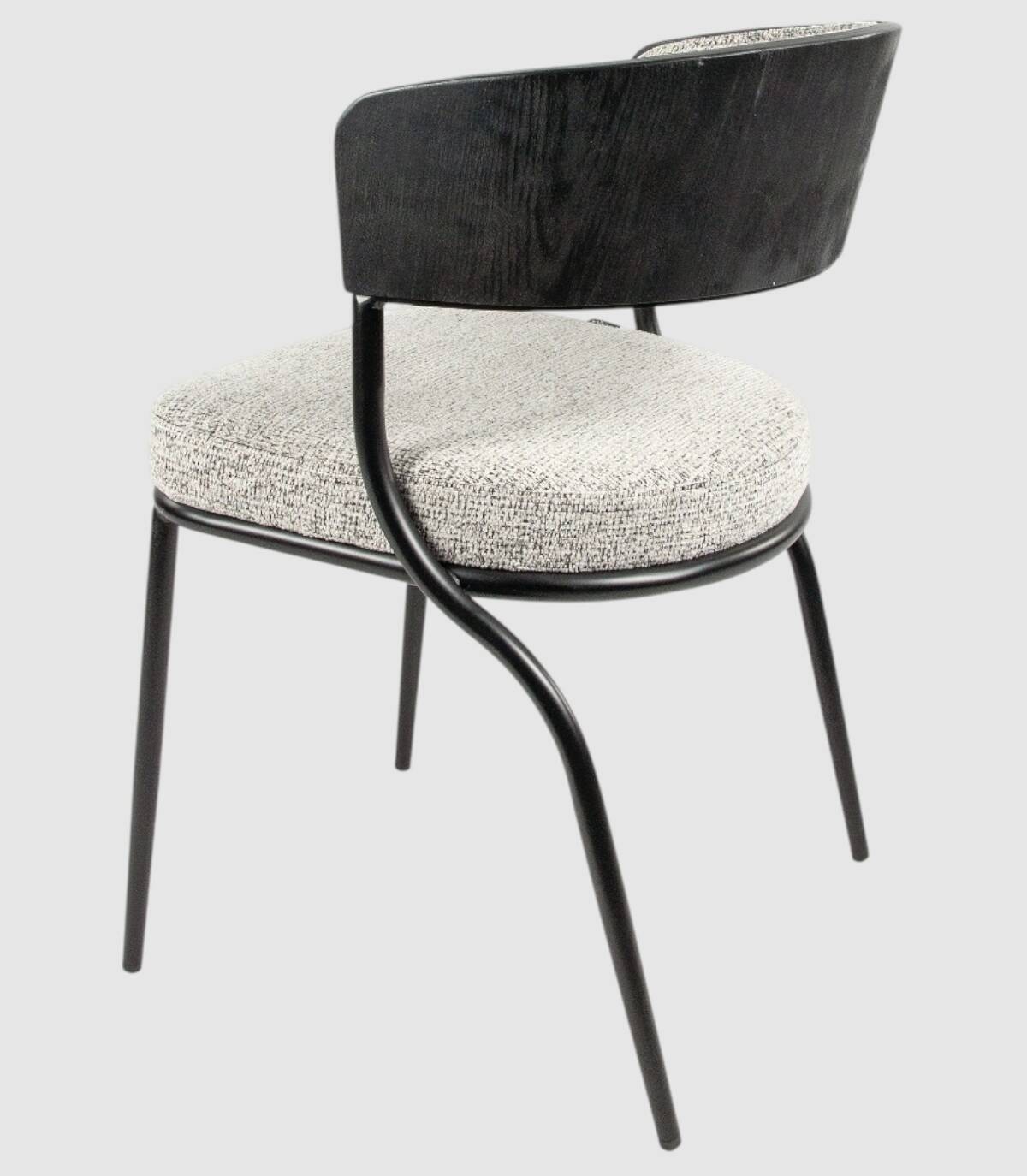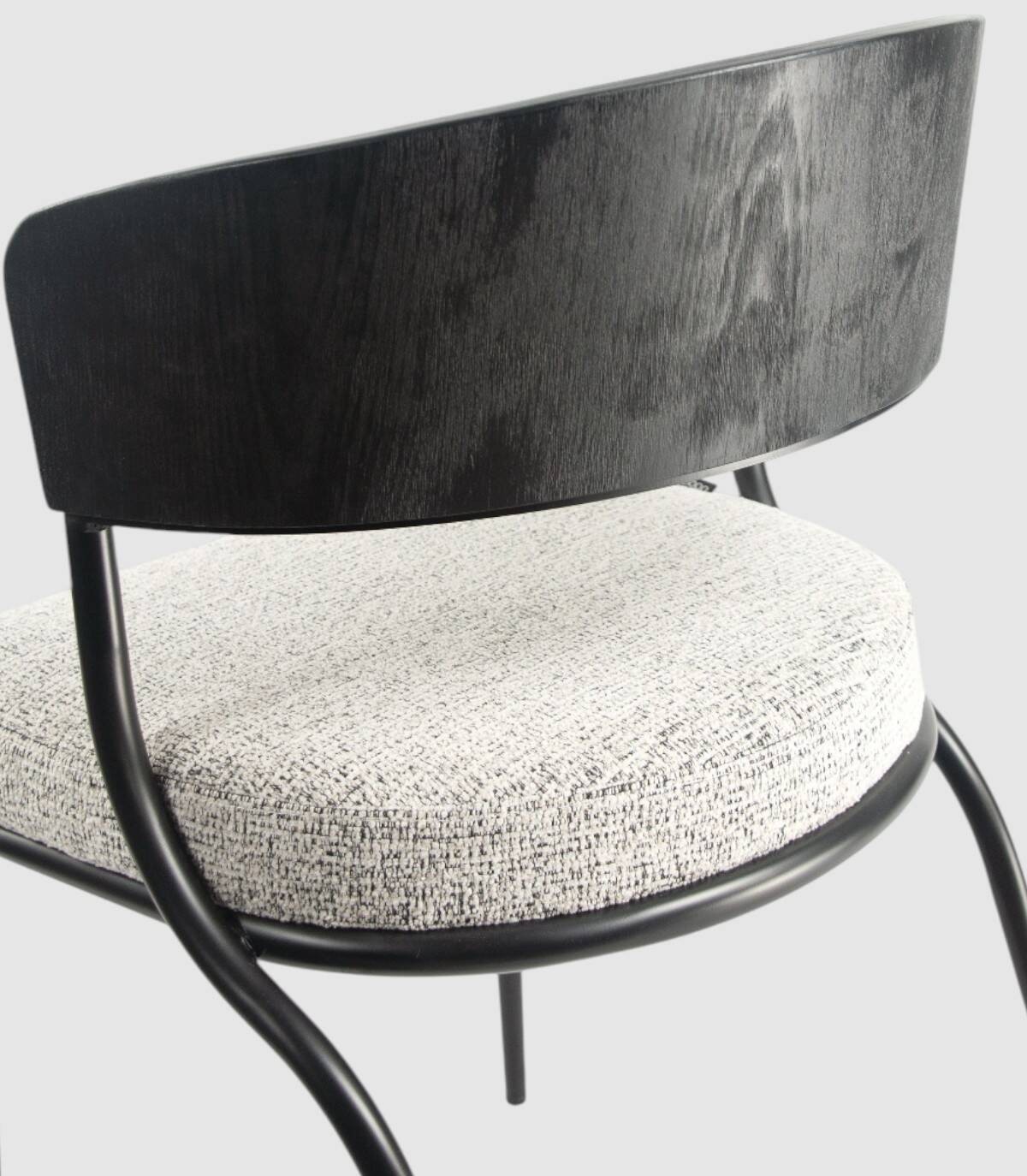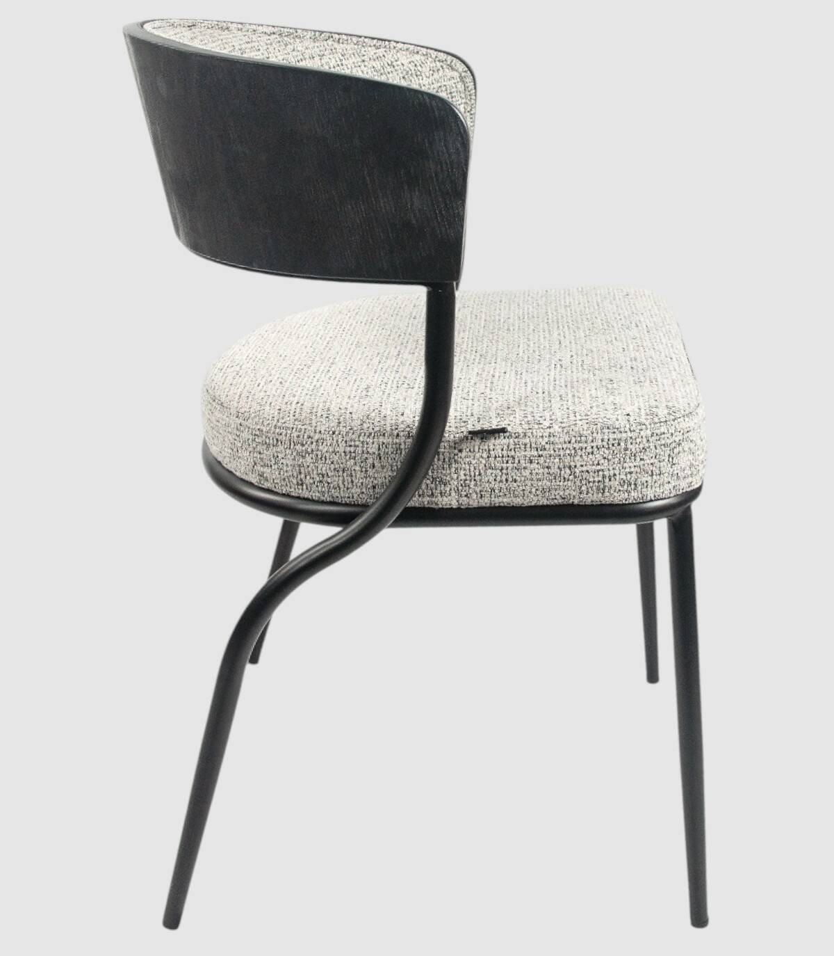 La silla Nimbus de comedor se compone de respaldo de madera de color roble natural, metal negro y tapizado, cuatro patas metálicas negras y asiento tapizados.