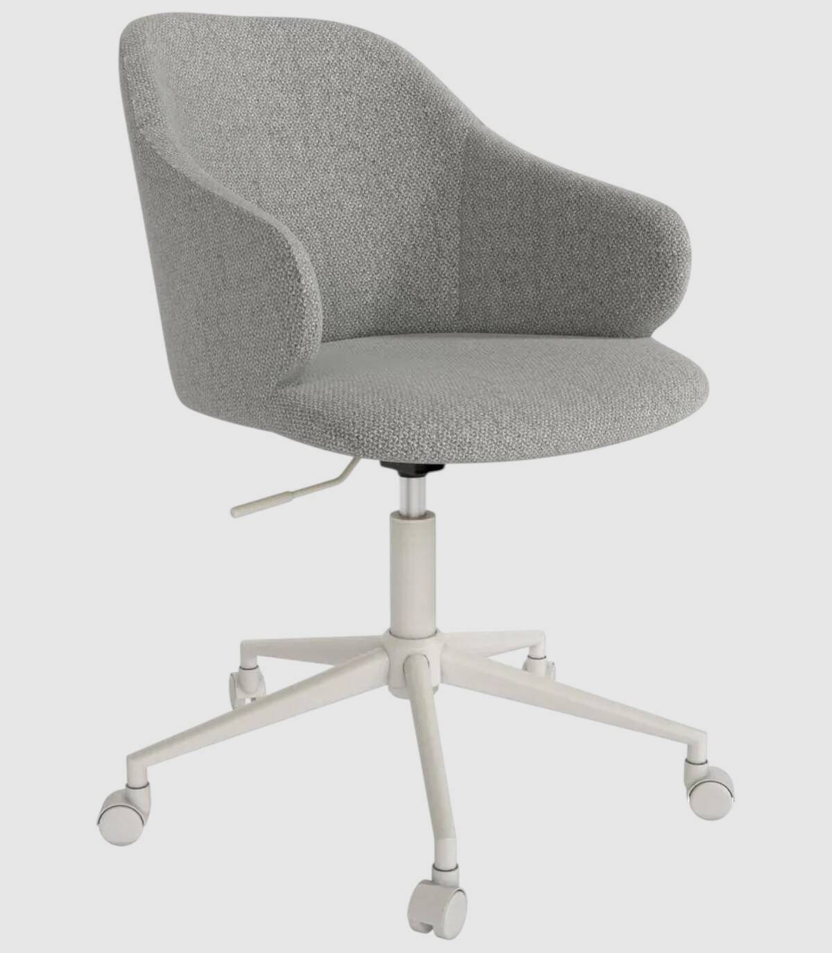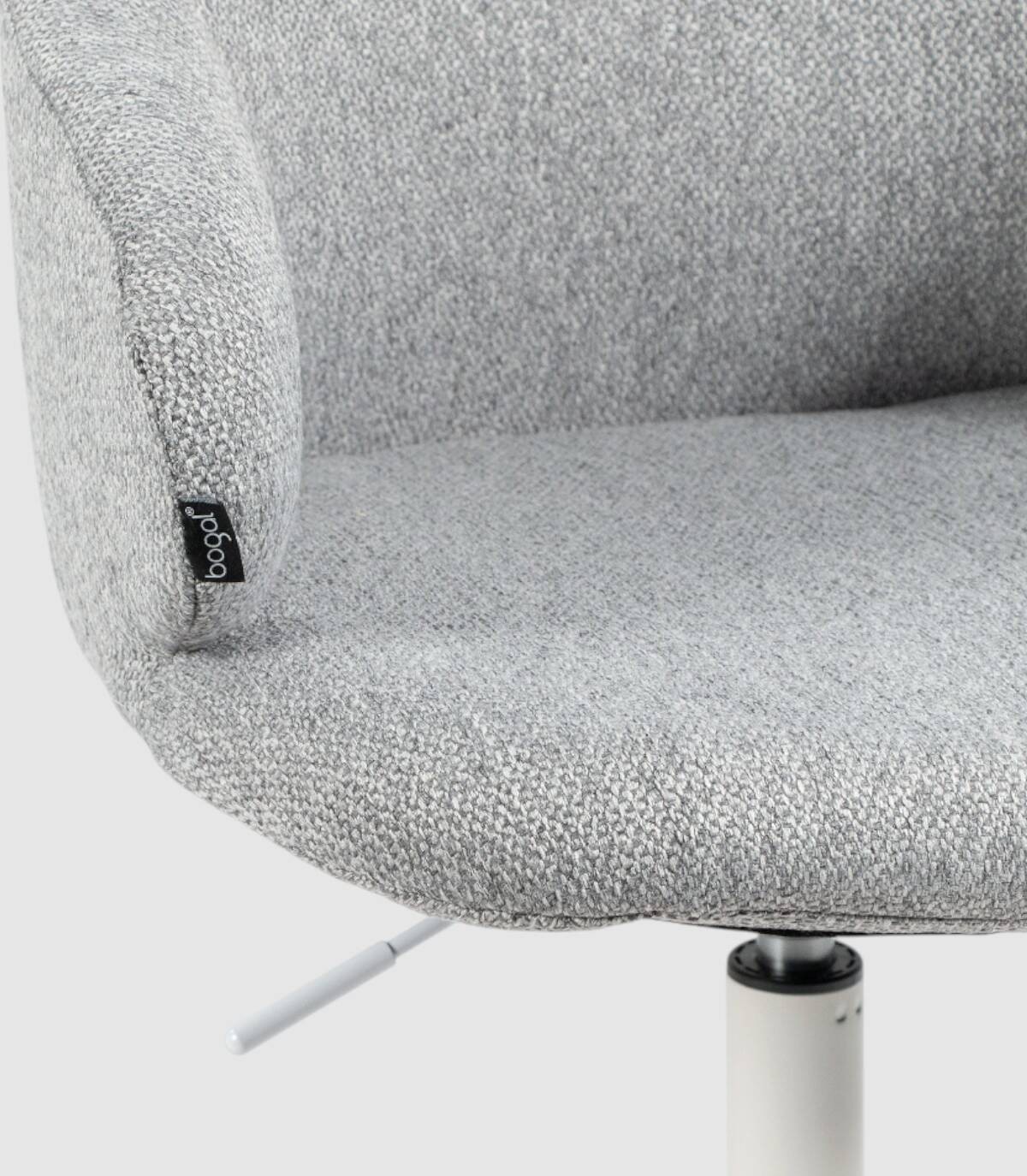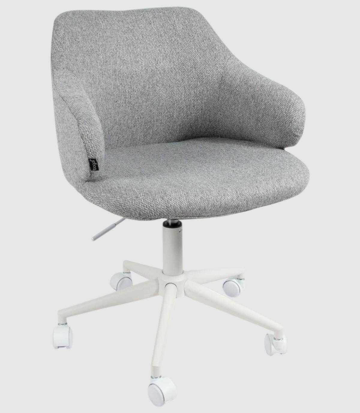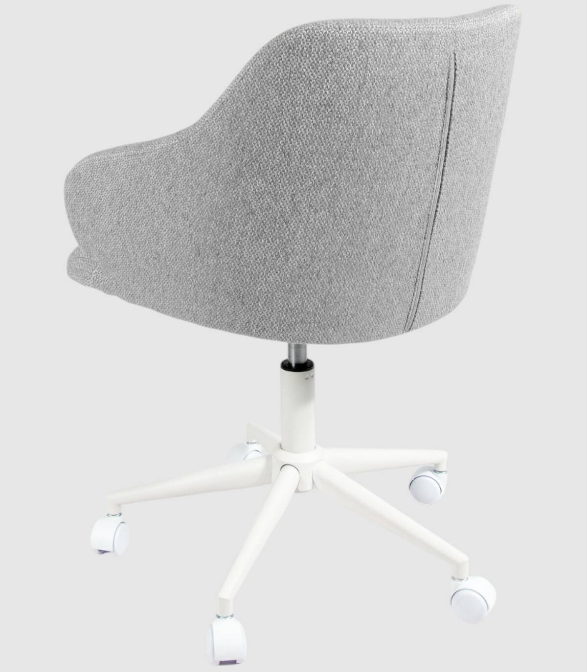 Read moreShow lessHet bestaat uit een rugleuning, zitting, gestoffeerde armleuningen en vijf witmetalen poten met wielen.