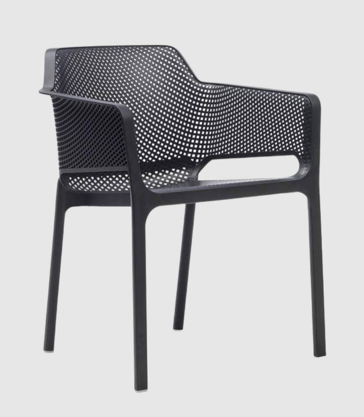 La silla Net con brazos tiene una estructura fabricada en polipropileno tratado anti-UV y teñido en masa, resina reciclable efecto mate de fibra de vidrio. Todas las patas tienen tapones antideslizantes.