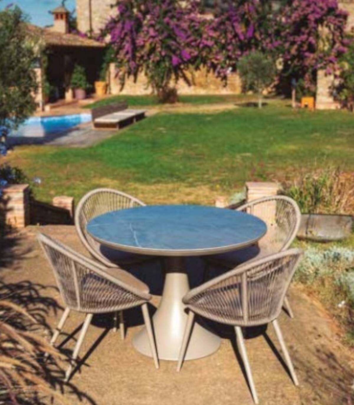 La silla para jardín Spade está fabricada en aluminio con revestimiento en polvo (poliéster). Tiene una asiento tejido con textilene. Las 4 patas tienen tapones antideslizantes.
