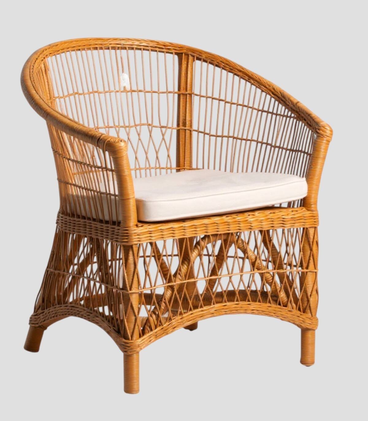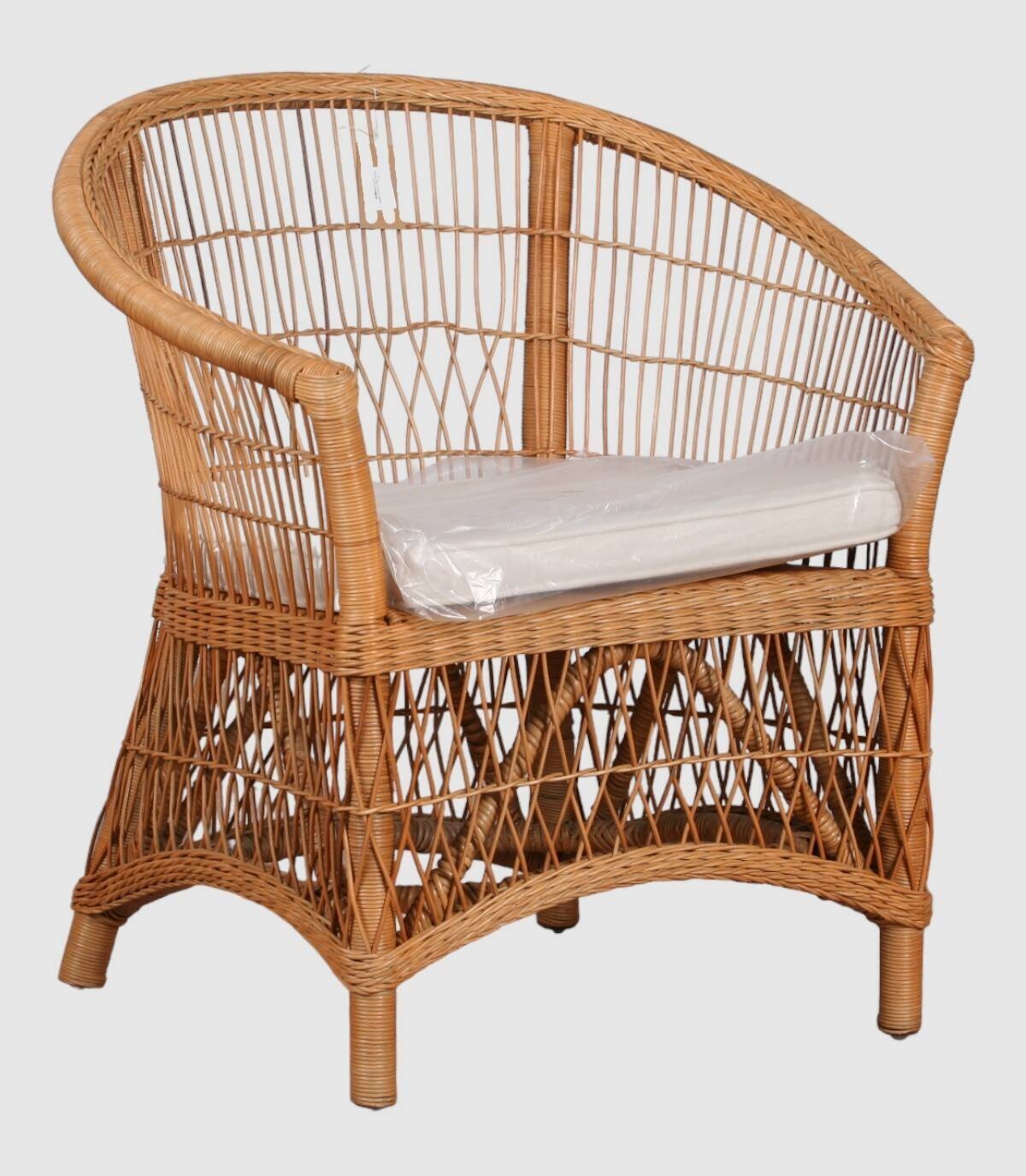 Sorella-stoel Het is gemaakt van een natuurlijk rotanweefsel met een afgeronde rugleuning en armleuningen. Inclusief wit kussen.