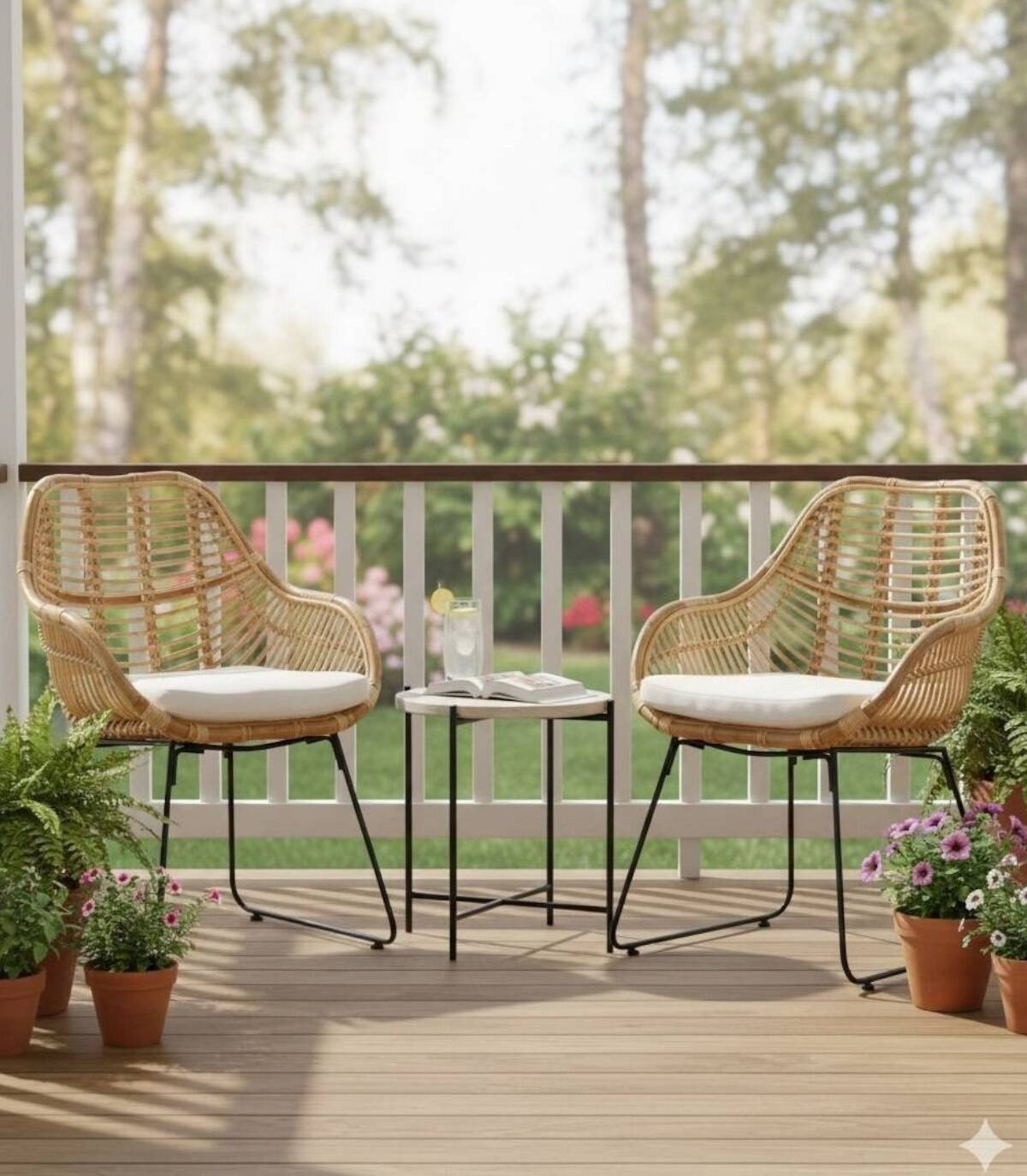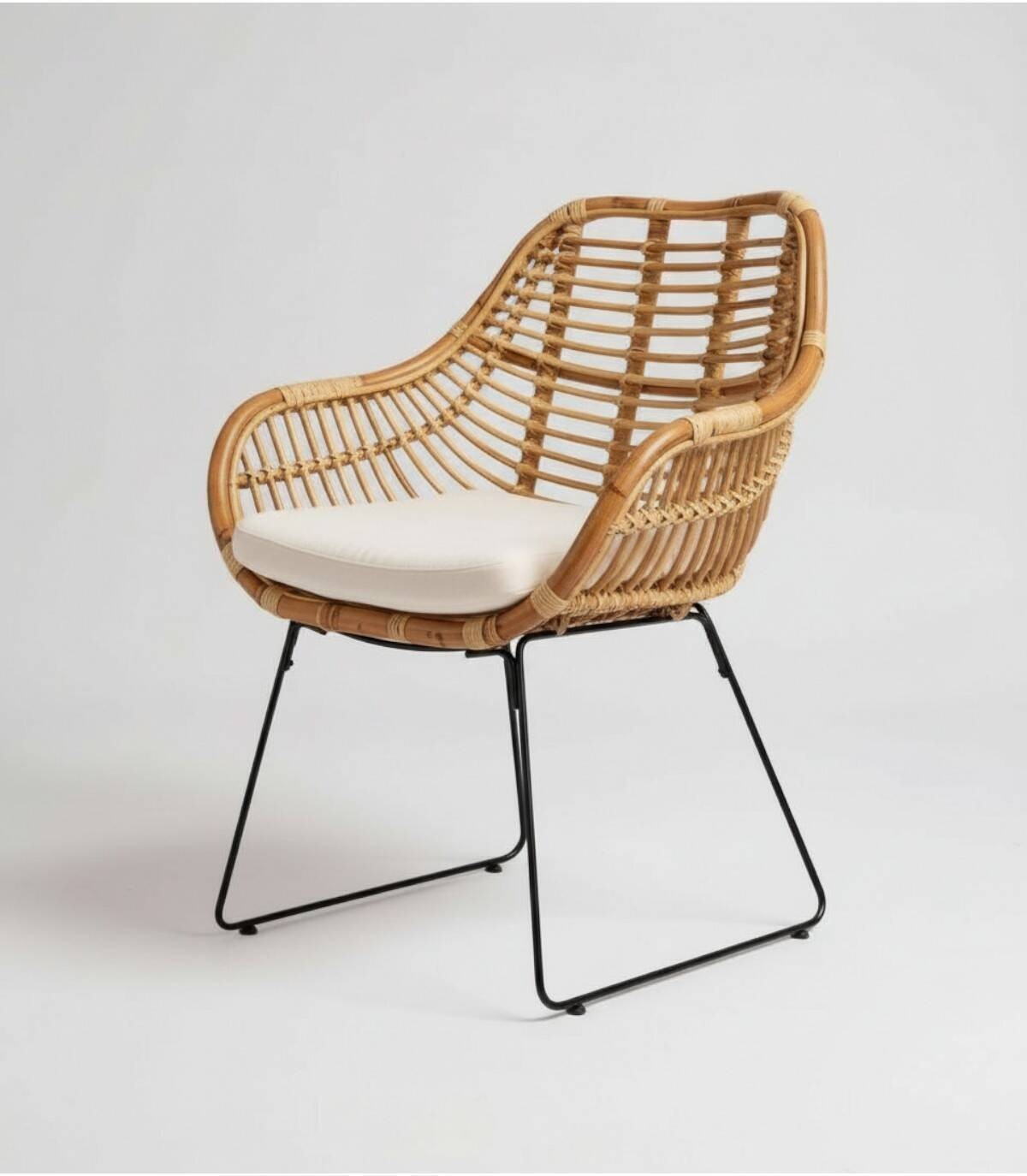 La silla Alfaro está fabricada con una trama de ratán natural con el respaldo de forma redondeada. Incluye cojín blanco.
