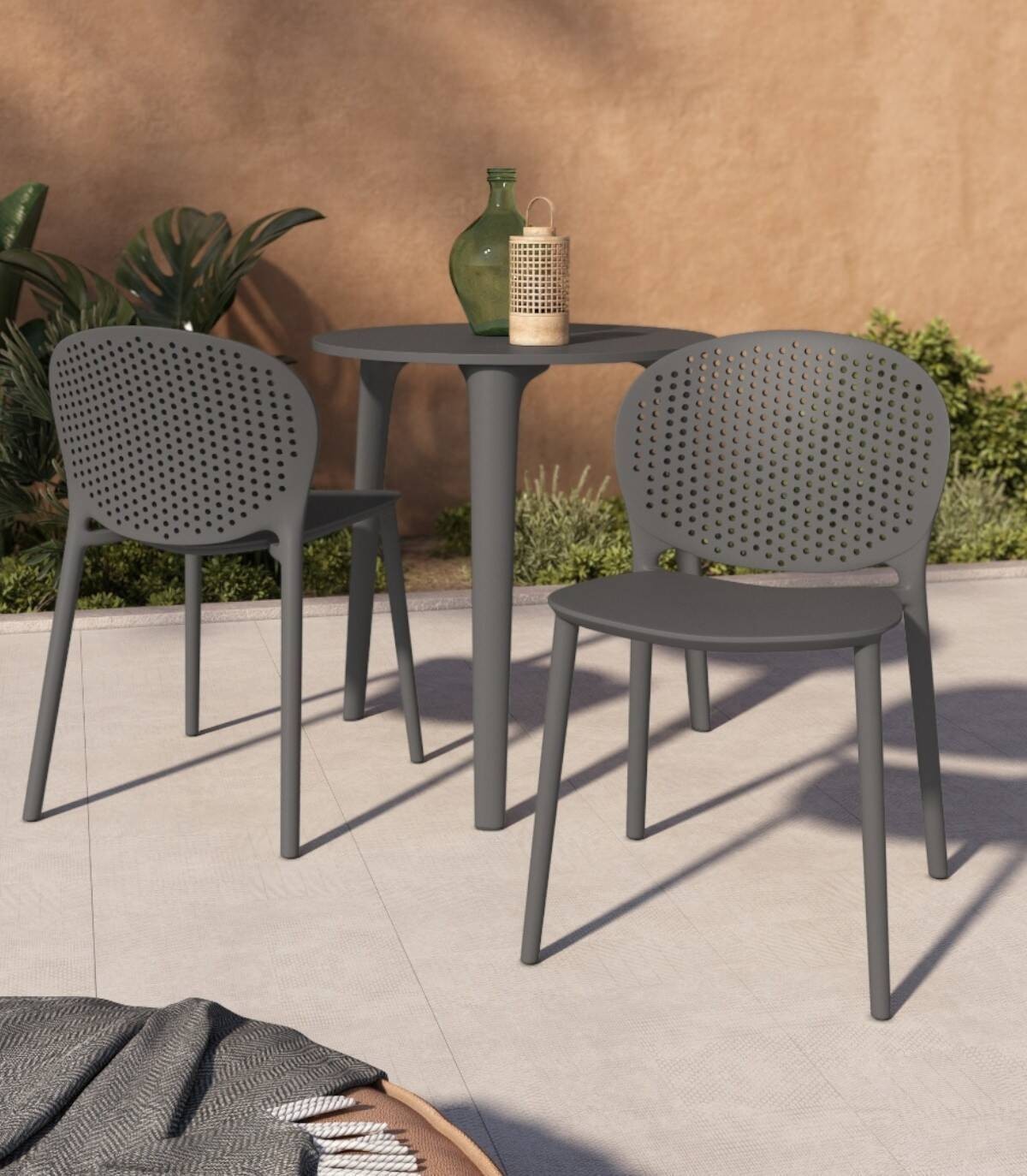 De stapelbare Bogotá-stoel in monoblokstijl, Het heeft een elegant en modern ontwerp en een structuur van polypropyleen, allemaal in dezelfde kleur afgewerkt.
