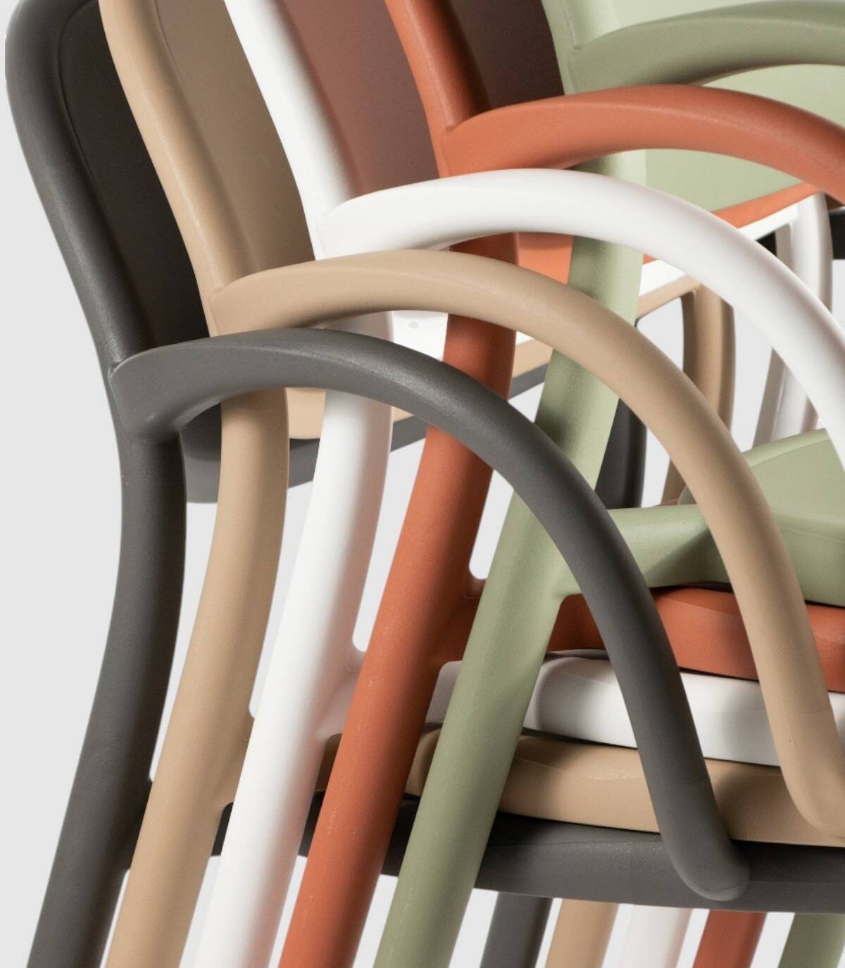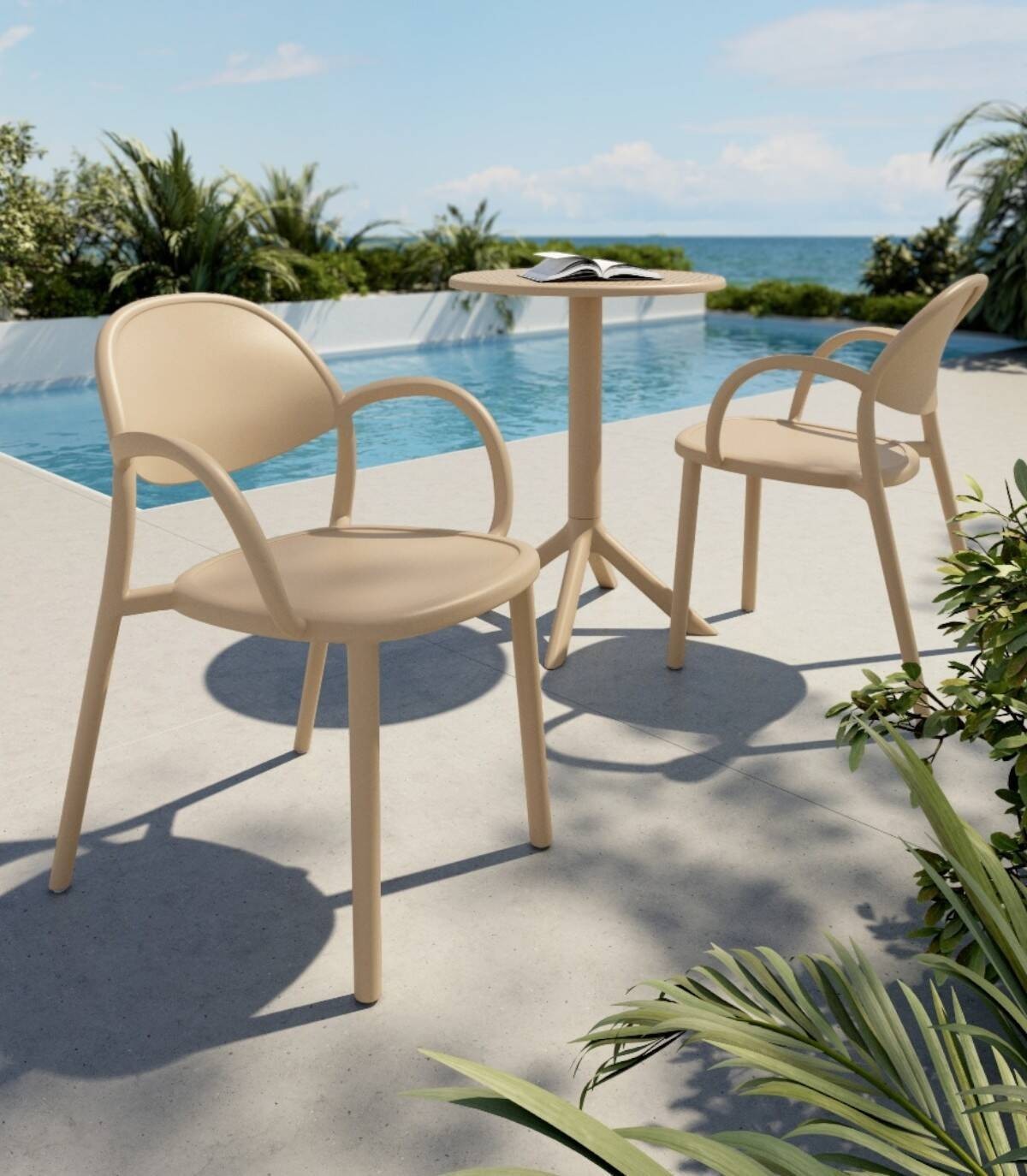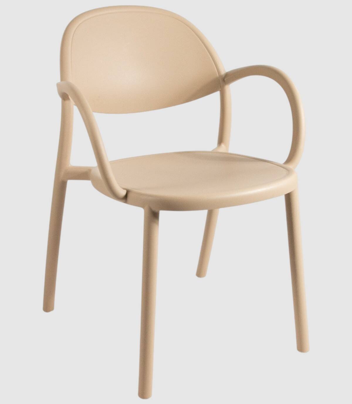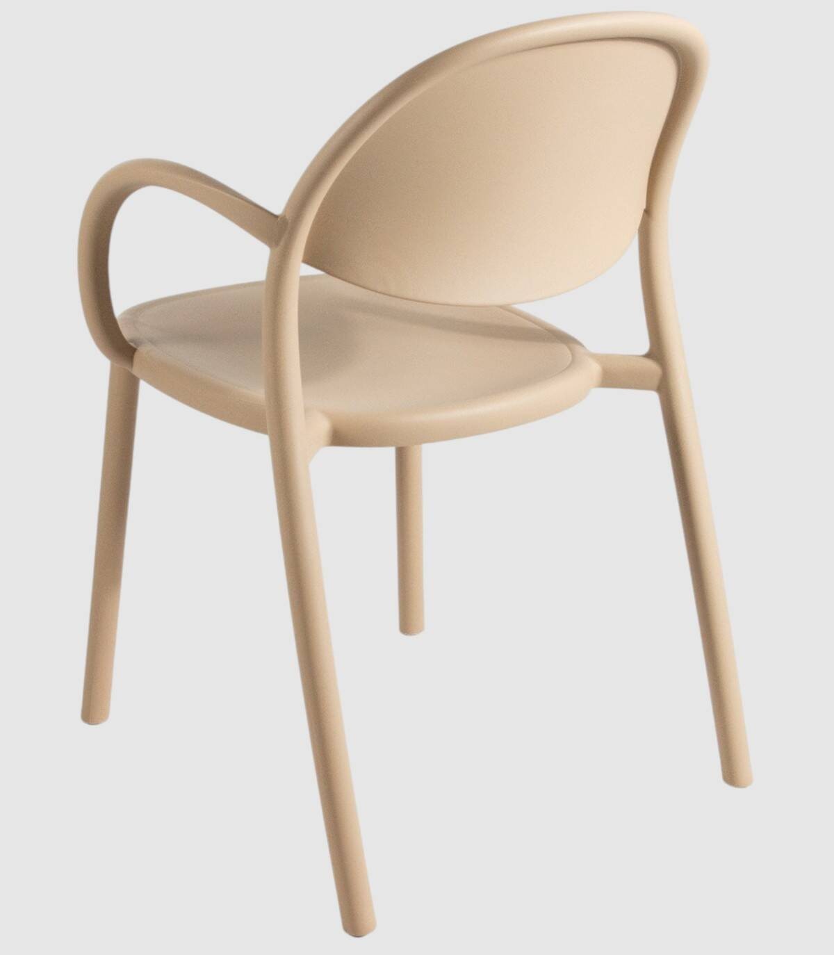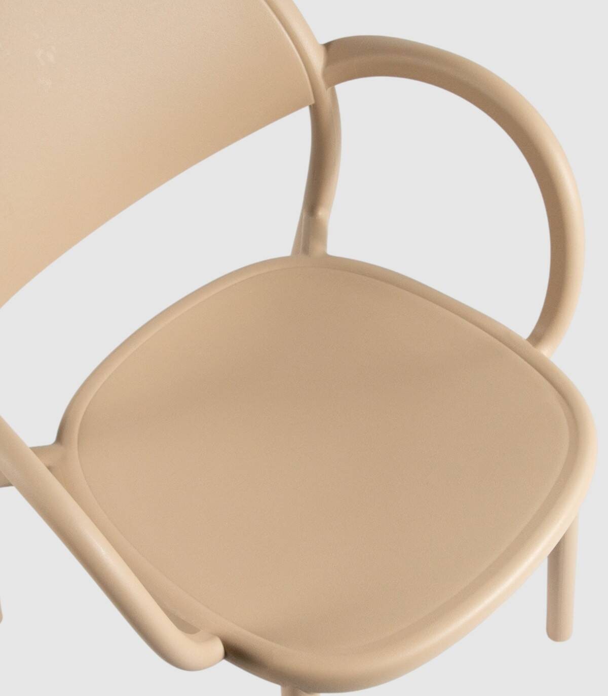 El sillón Bora monobloc tiene una estructura fabricada en polipropileno tratado anti-UV y teñido en masa, resina reciclable efecto mate de fibra de vidrio. Todas las patas tienen tapones antideslizantes.