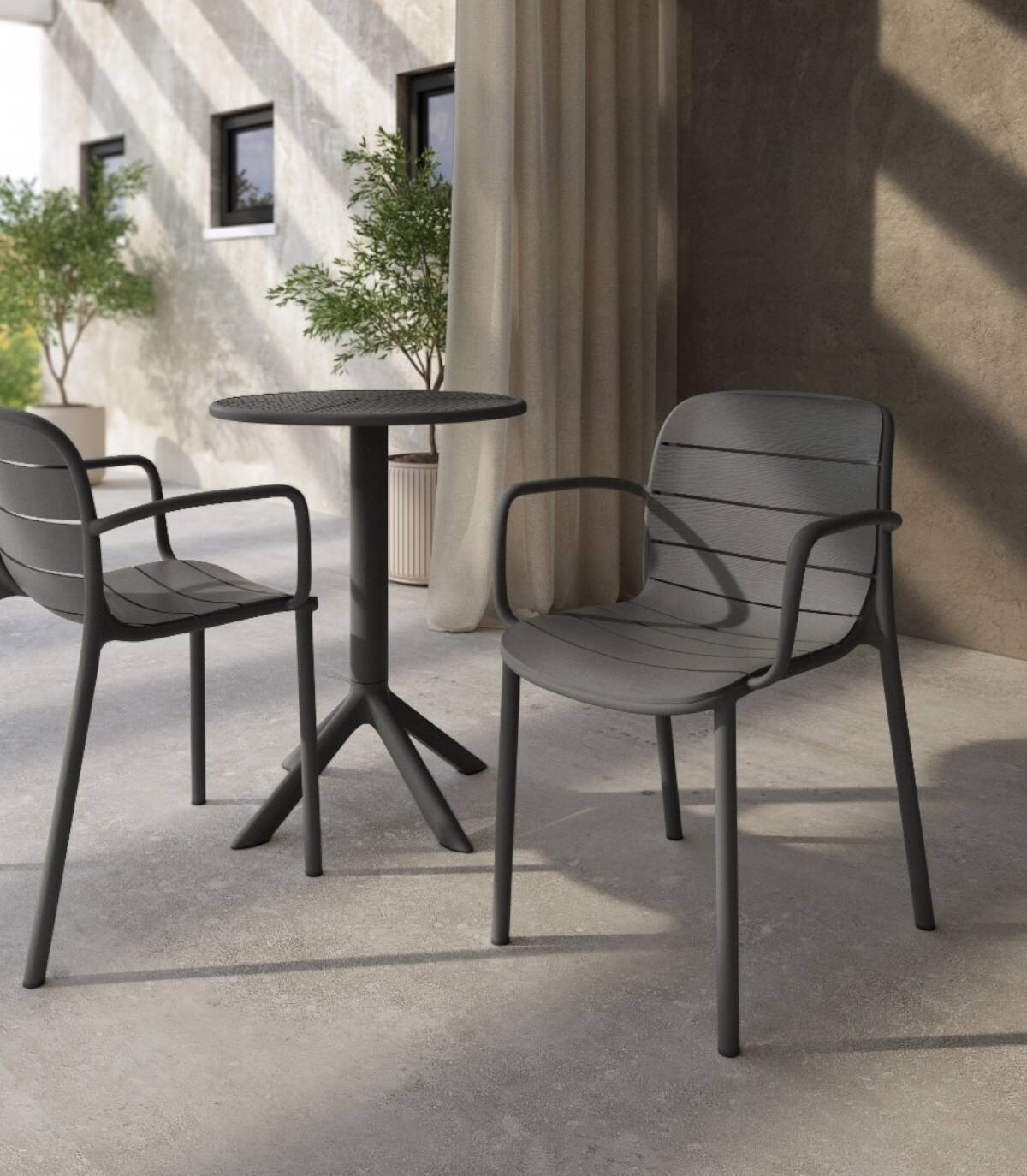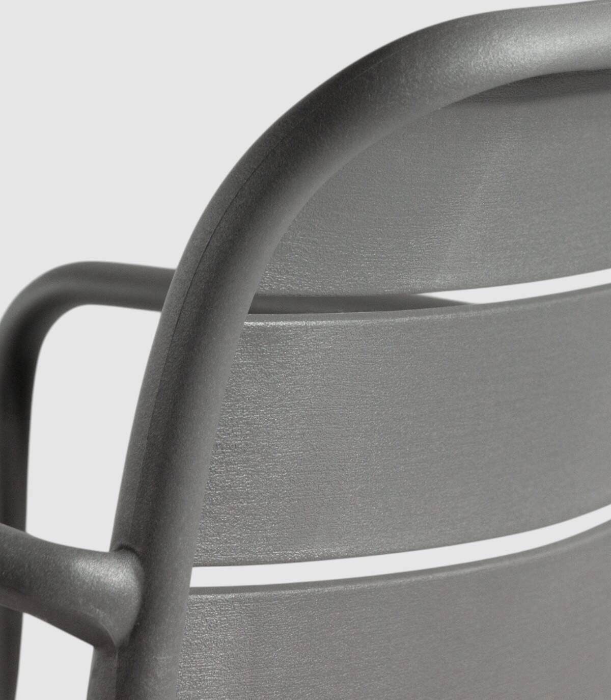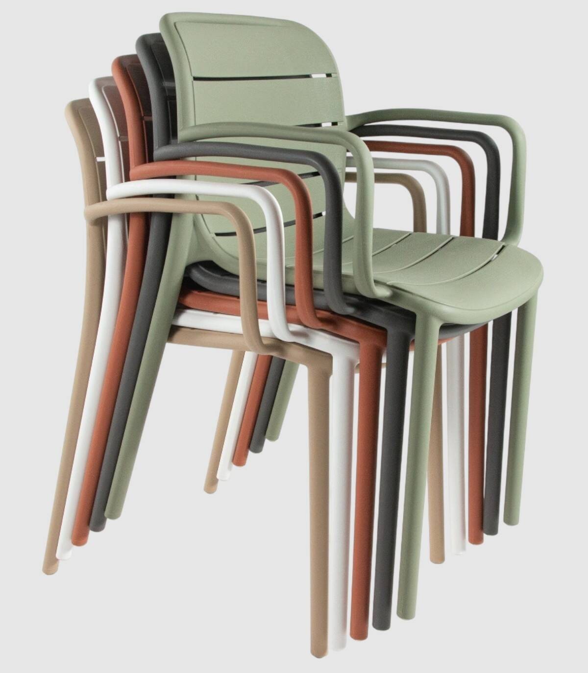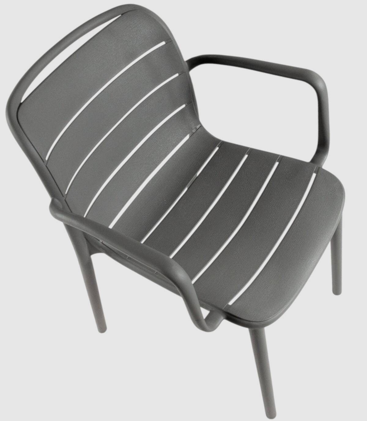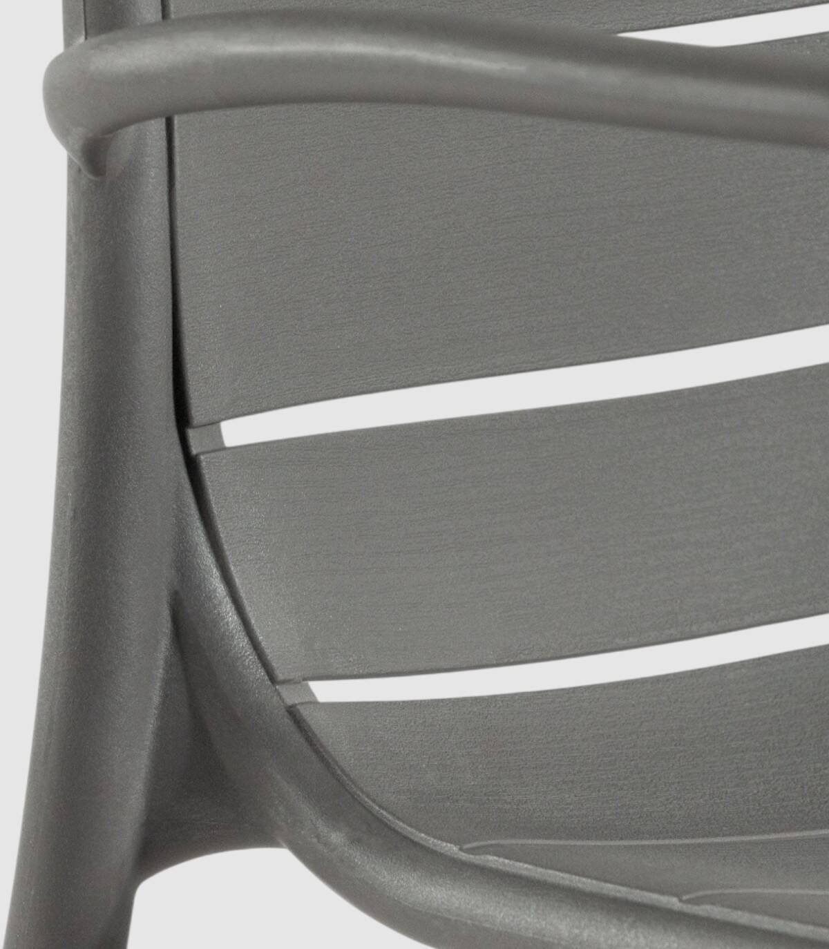 Read moreShow lessHet bestaat uit een rugleuning, zitting, armleuningen en poten van polypropyleen, geverfd in dezelfde kleur met een horizontaal geperforeerd lattenontwerp.
